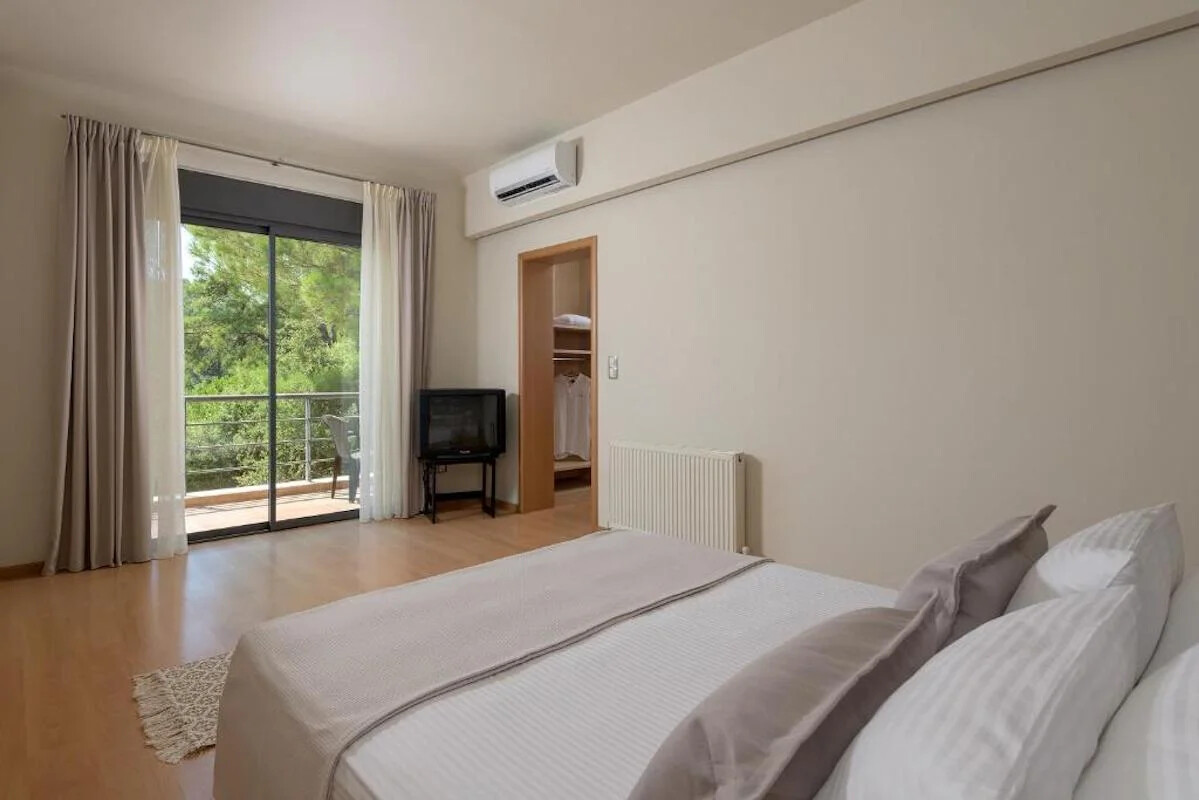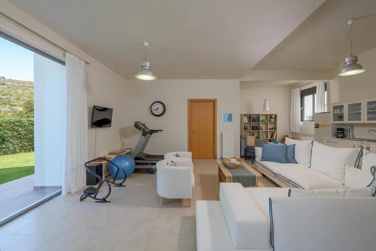 The exterior space is a haven of tranquility, featuring a meticulously landscaped garden, a swimming pool, and a BBQ area. The villa’s elevated position, just 600 meters from the sea, provides breathtaking, unobstructed views of the Aegean. The nearby beach, ideal for families with children, epitomizes the peaceful and serene atmosphere of the neighborhood.