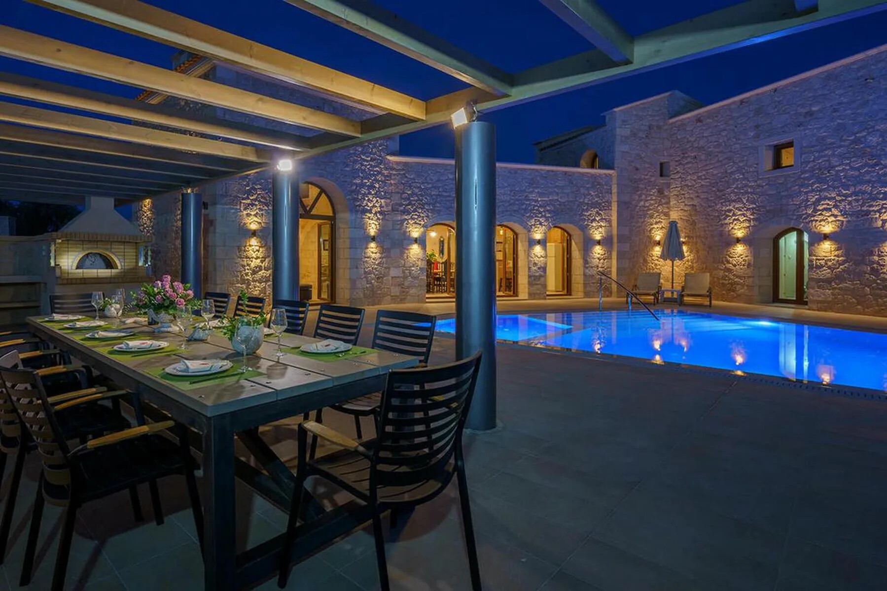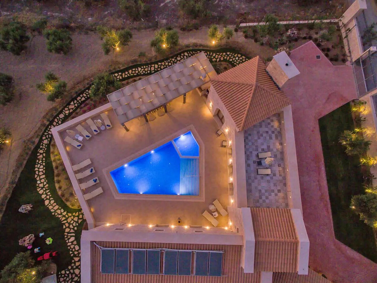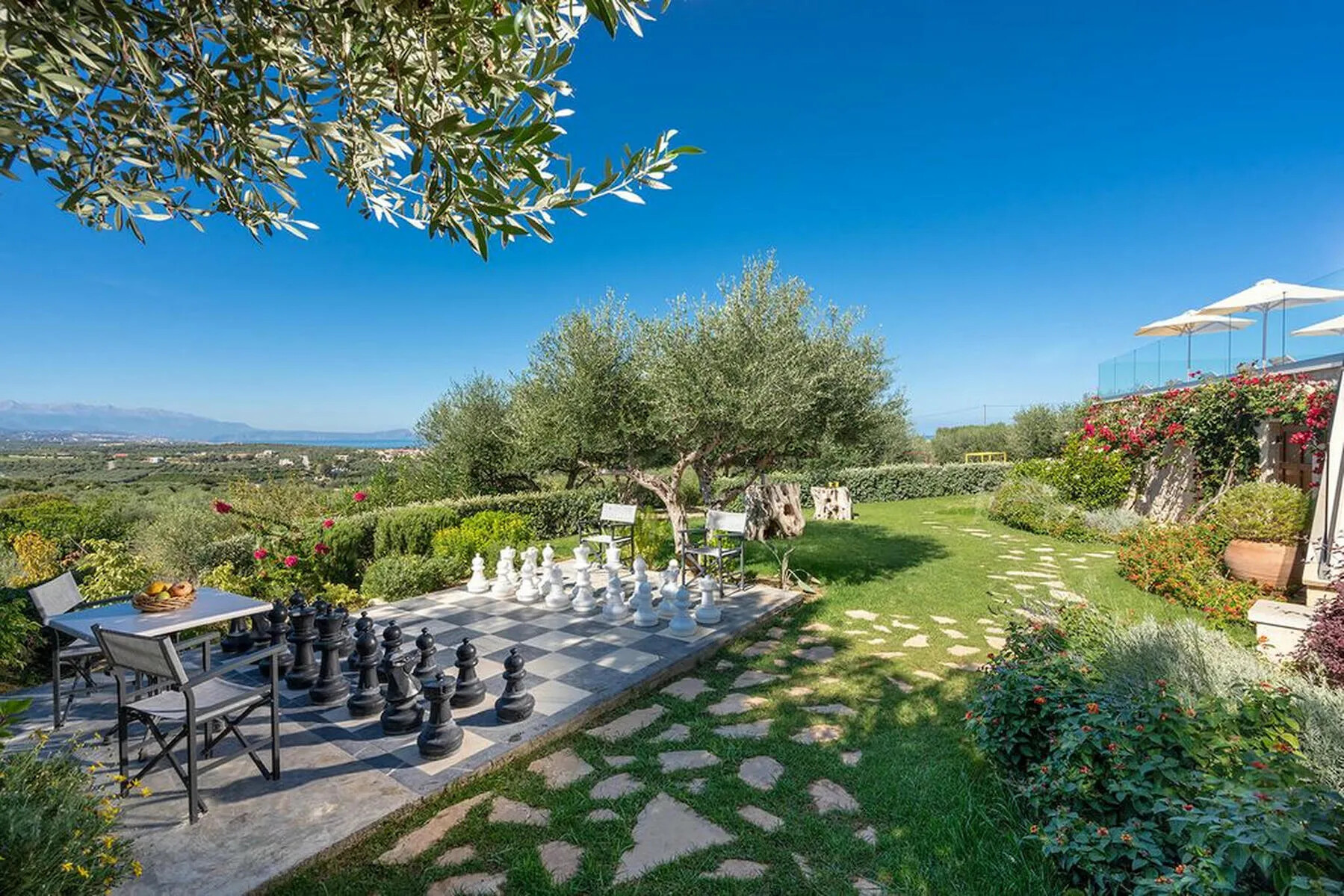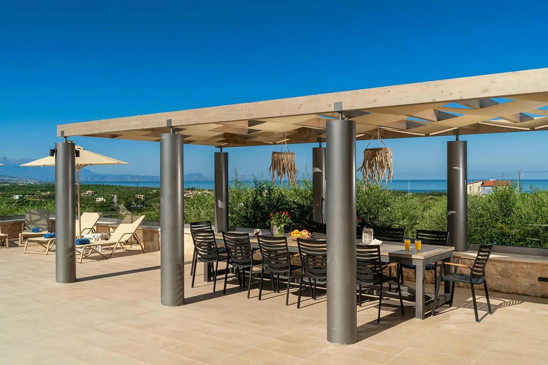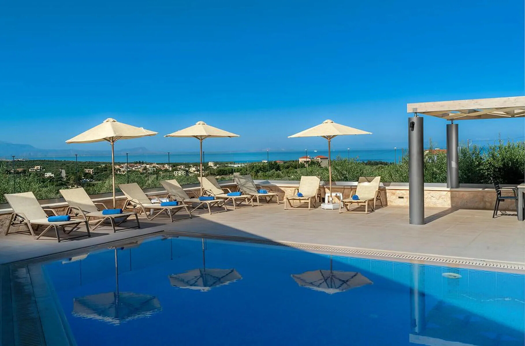 The villa’s outdoor areas offer unparalleled views and provide numerous spaces for relaxation and enjoyment. The 46 m² private pool includes a 9 m² children’s section, making it ideal for families. The pool area is equipped with sunbeds and umbrellas, allowing guests to unwind in comfort while enjoying the beautiful Cretan weather.