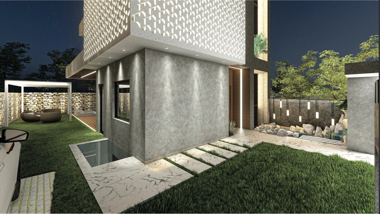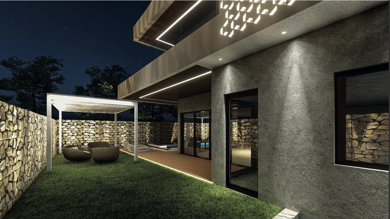 - Smart Lighting: Illumination is achieved through energy-efficient strip lights and spots embedded in ceilings and walls.