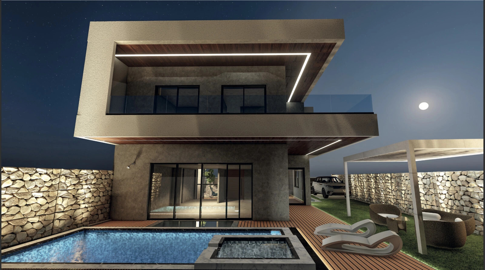 - Luxurious Interiors: The ground floor welcomes you with a spacious kitchen, island, and a large living room with panoramic views of the garden and pool.