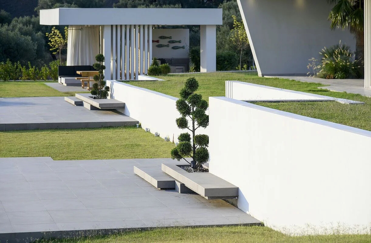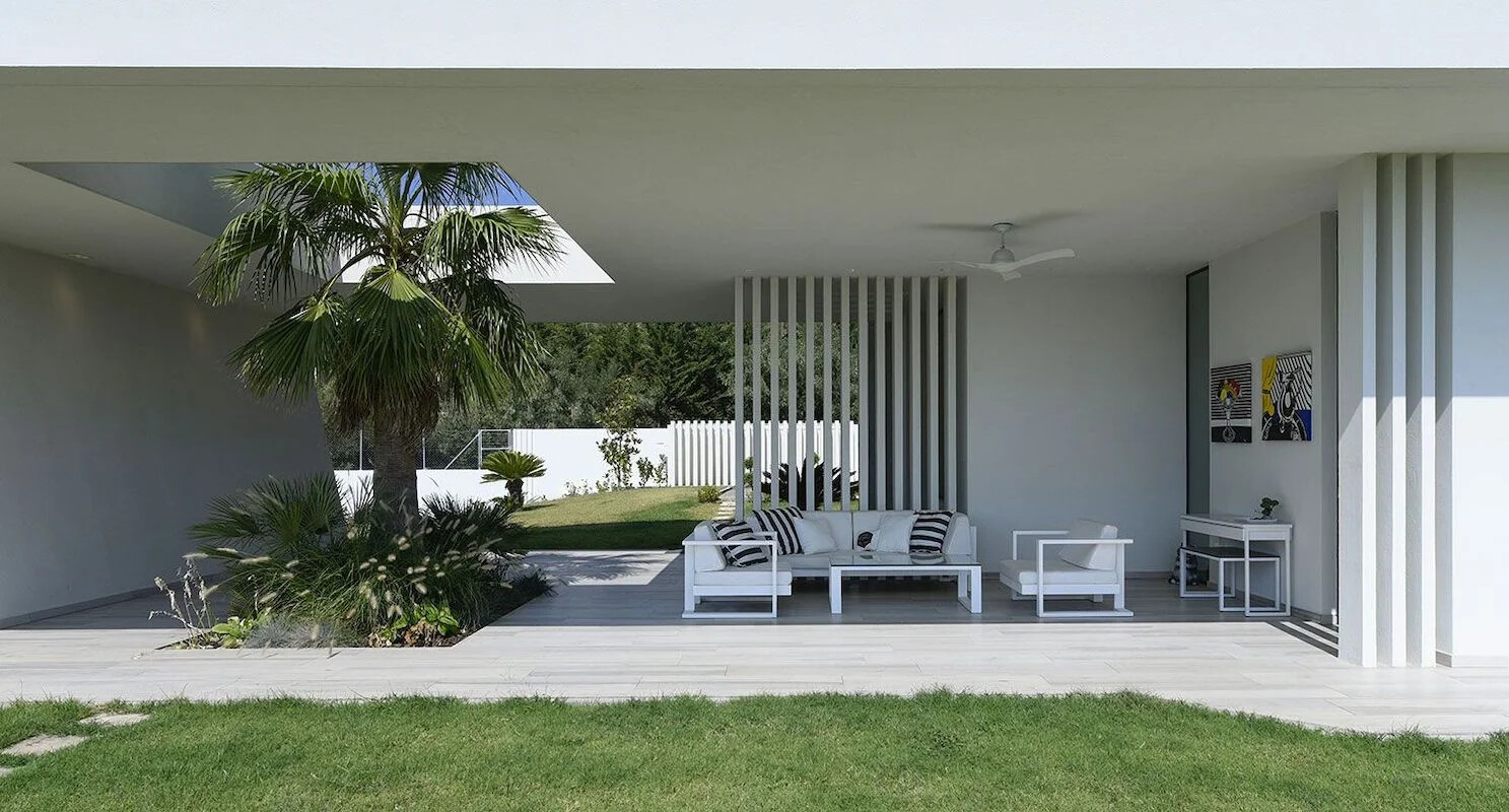 The dream culminates in the outdoor spaces, reminiscent of a summer house paradise. Choose between the refreshing large swimming pool perfectly parallel to the main building, the uniquely designed outdoor pergola, a kitchen that would make any well-organized indoor kitchen envious, an outdoor toilet, sports facilities in a specially constructed court, or the unique external corner with a palm tree shaped by the building’s distinctive architecture.