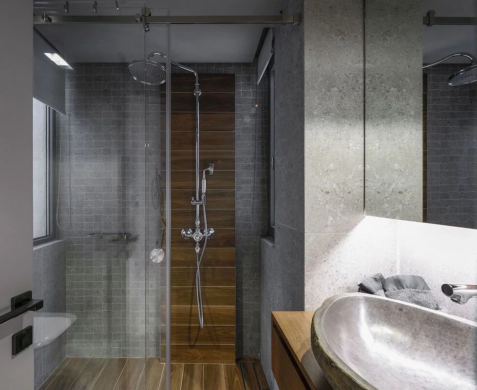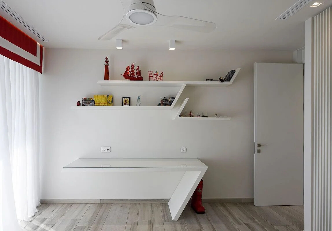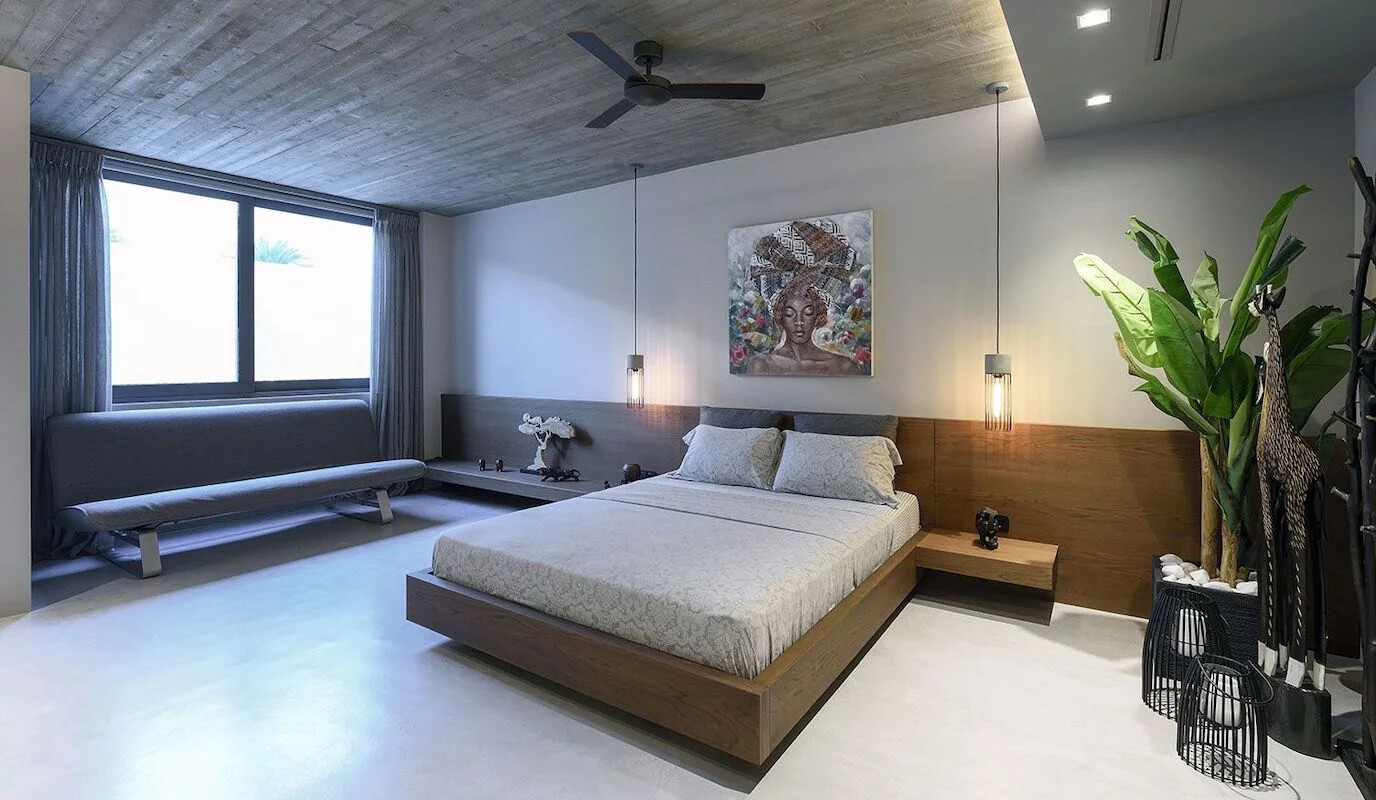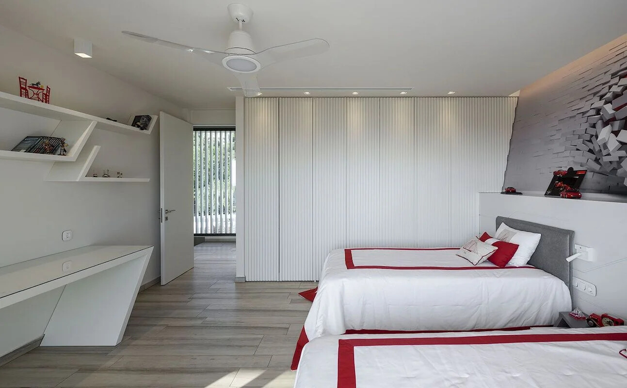 On the upper level, two uniquely spacious rooms await, offering a front-row view through specially crafted frames from the best manufacturers. The bathroom design is equally distinctive. The external area of this floor, with glass railings mirroring the angular design of the main building and a palm tree cleverly integrated across all levels, is truly impressive.
