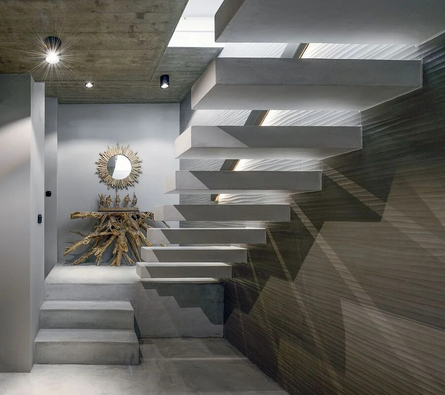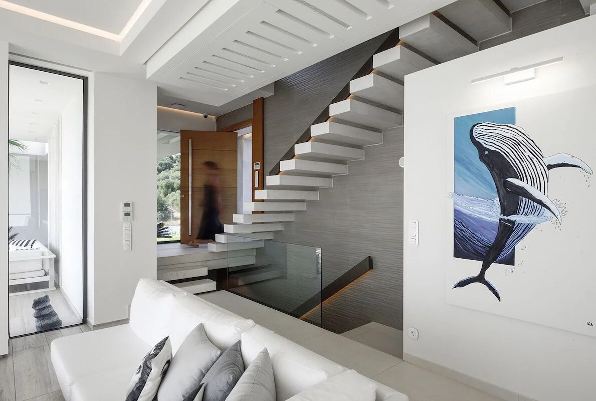 The building’s longitudinal design, resembling the angles of a ship, imparts a dynamic movement to this extraordinary property. Every area of this residence is crafted to offer unforgettable moments. Begin your journey in the masterfully designed living room with a kitchen and island, providing an unobstructed view along the entire sea frontage. The interior architecture seamlessly complements the exterior, featuring special constructions and architectural elements strategically placed to captivate visitors.