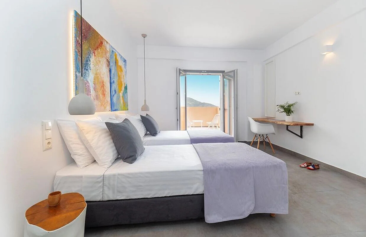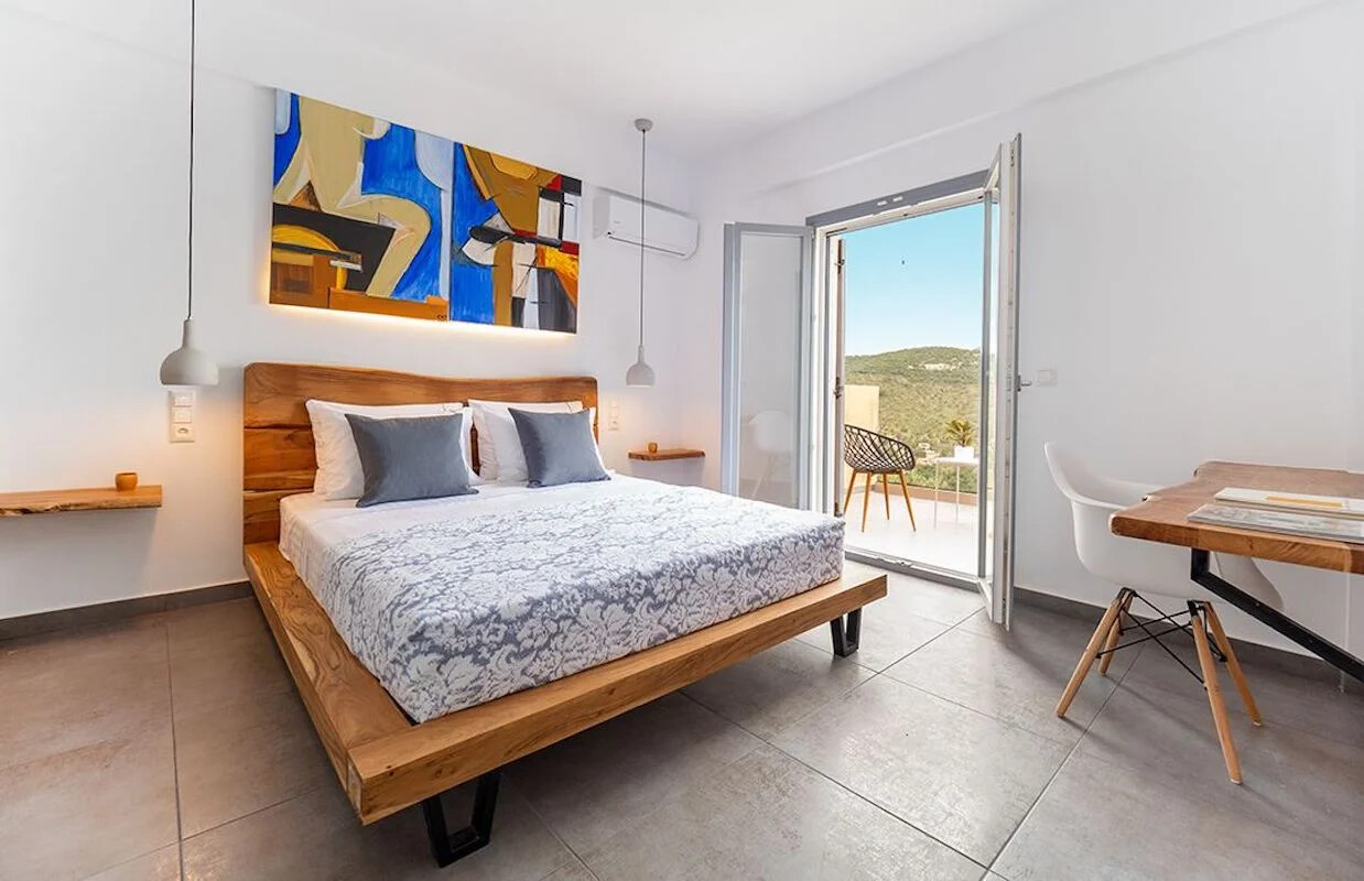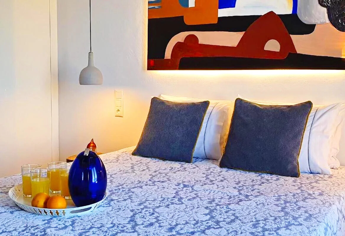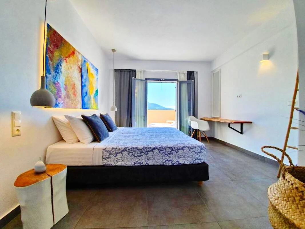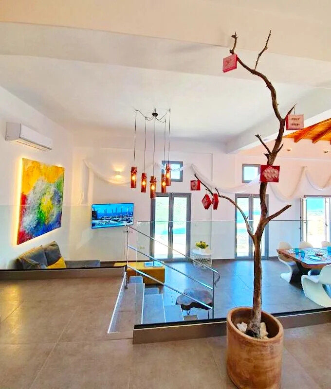 Masterpiece of Design: Villa seamlessly blends with its natural surroundings, offering interiors bathed in natural light and adorned with locally crafted artworks. Owner Yiannis’s hand-painted creations add a touch of local charm, while meticulous attention to detail and the use of natural materials elevate the villa to unparalleled sophistication.