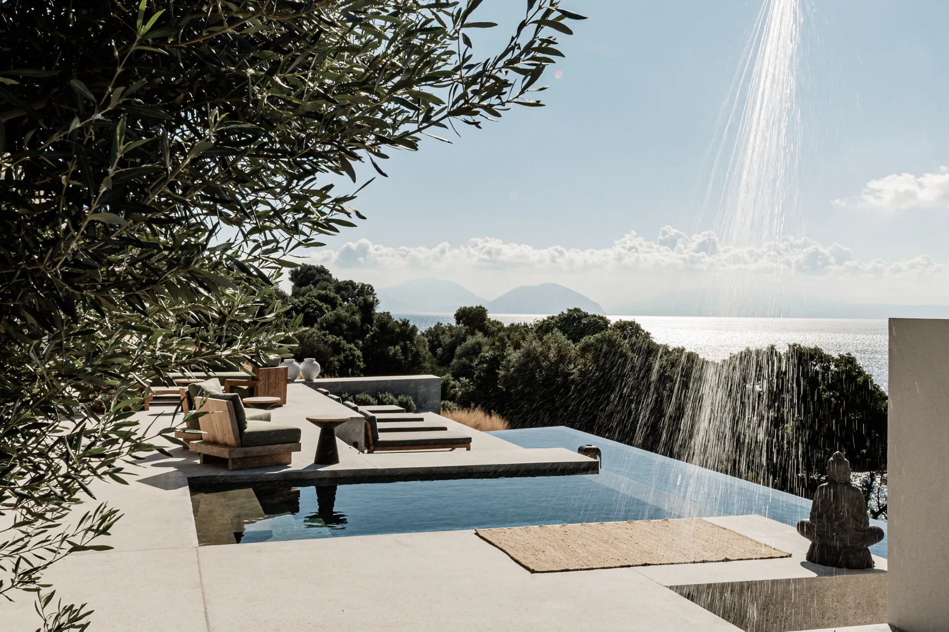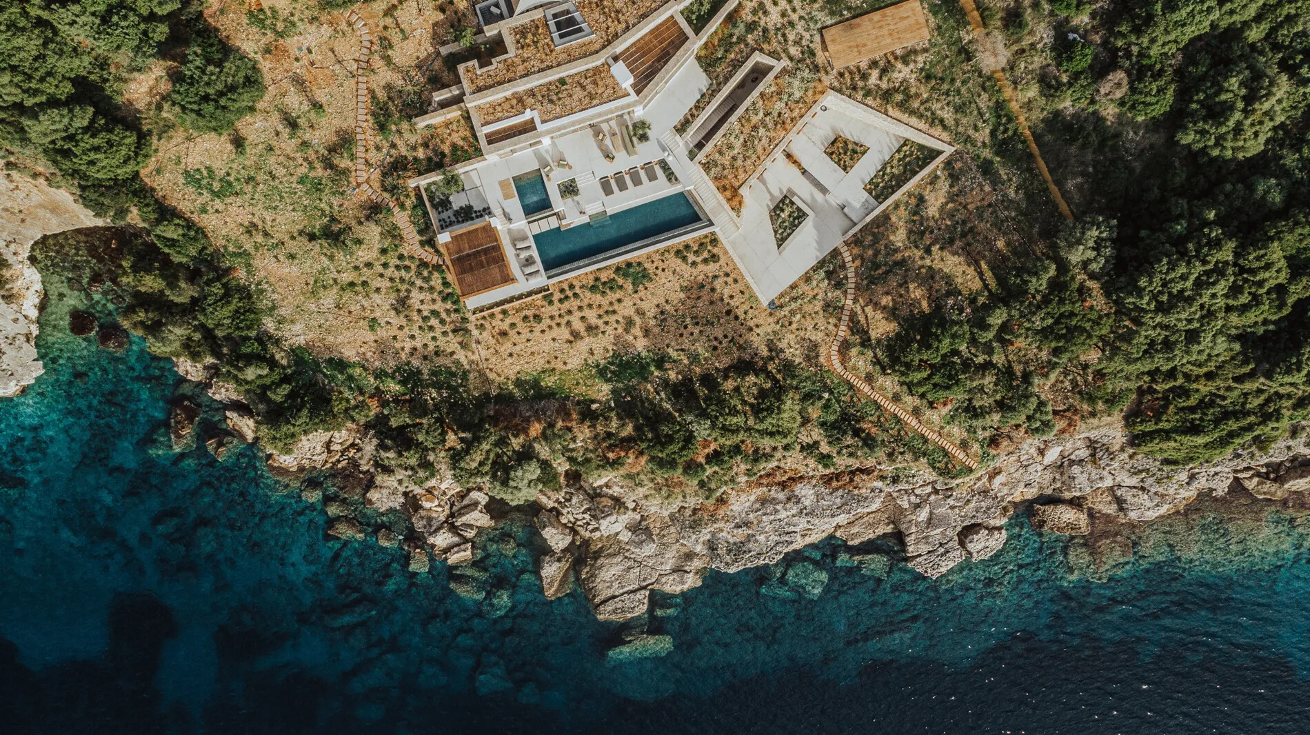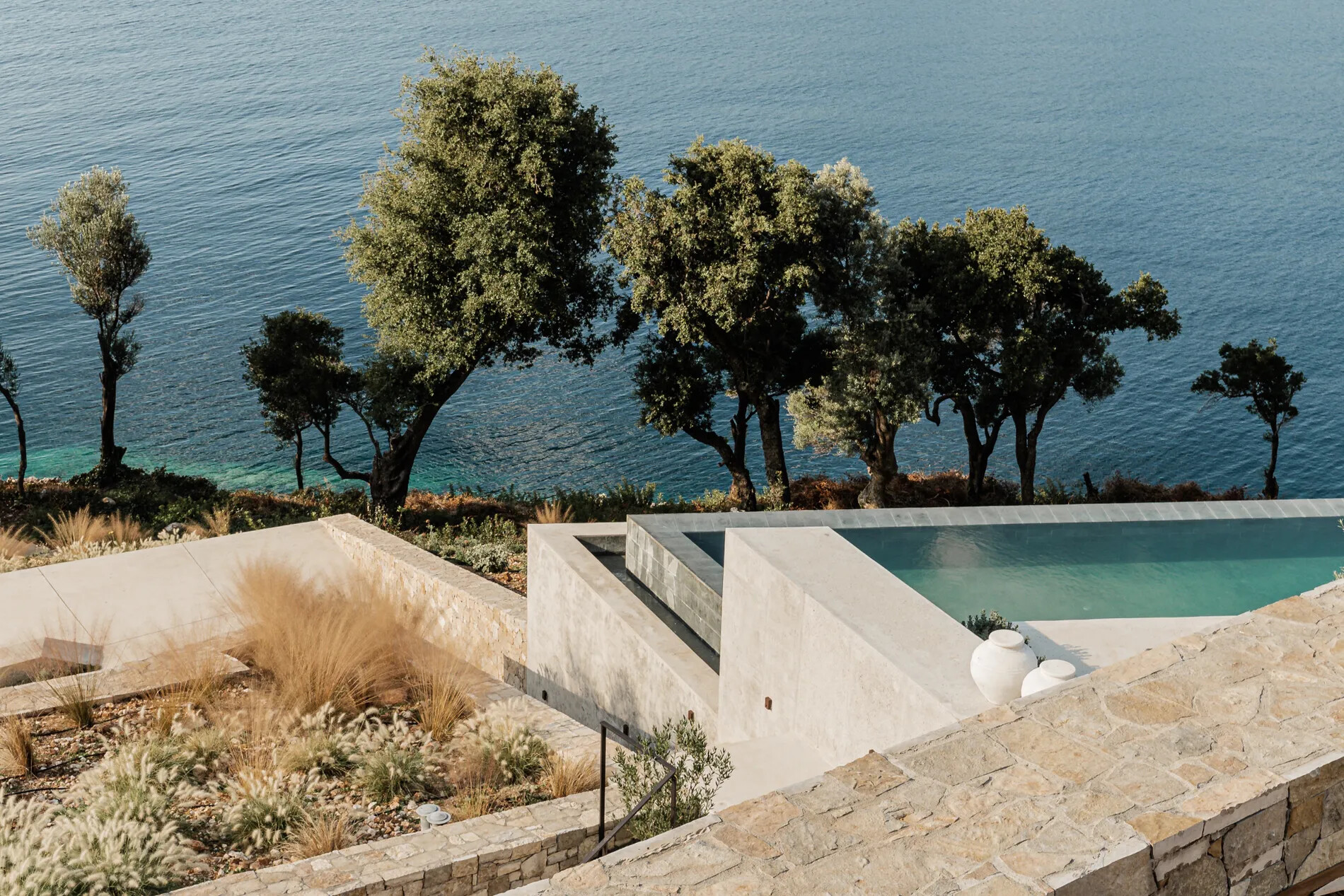 Set into a sloping cliffside, the home makes masterful use of its terrain. Partially embedded into the earth, the structure preserves privacy and reduces environmental impact, while maximizing the breathtaking views across the Ionian Sea.
