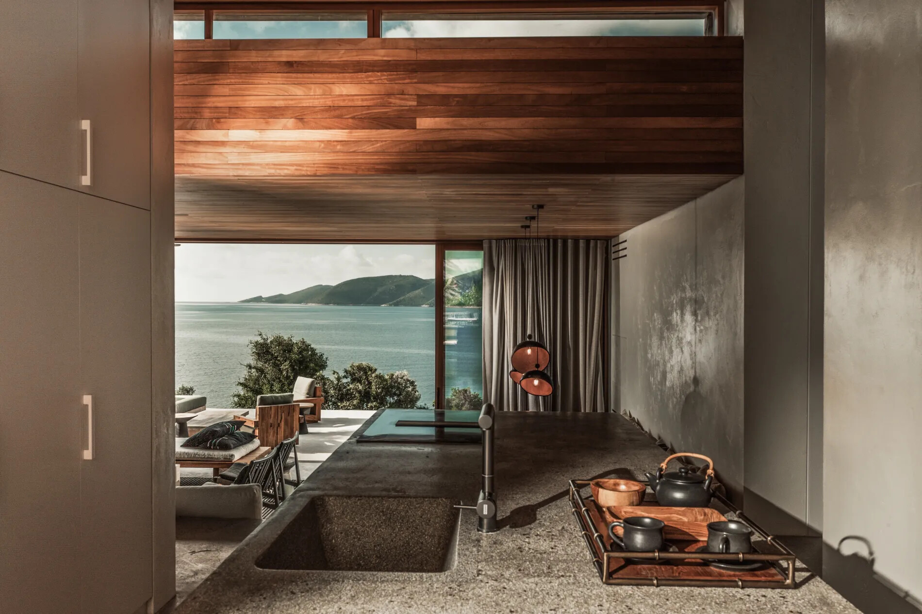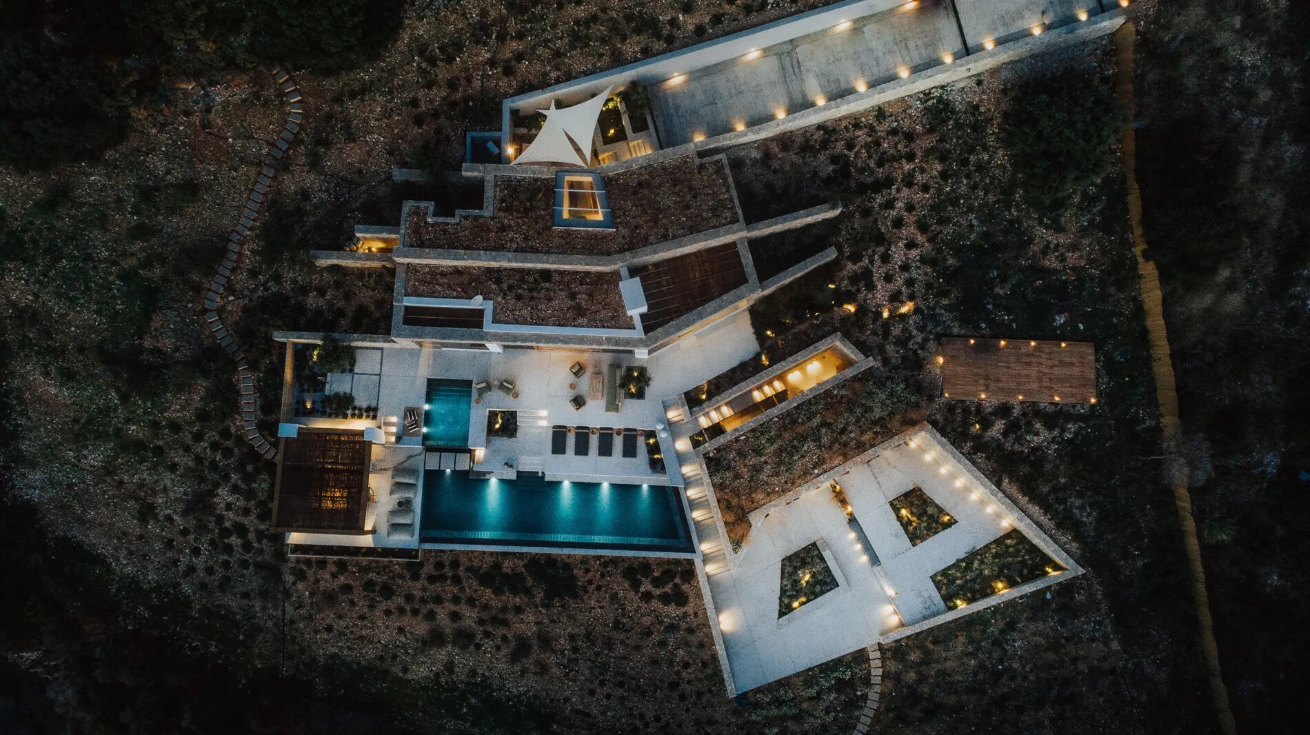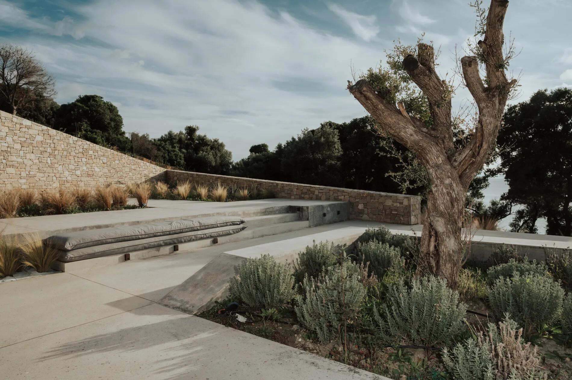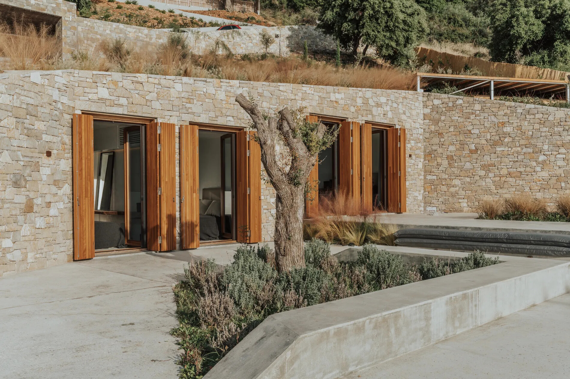 Set into a sloping cliffside, the home makes masterful use of its terrain. Partially embedded into the earth, the structure preserves privacy and reduces environmental impact, while maximizing the breathtaking views across the Ionian Sea.