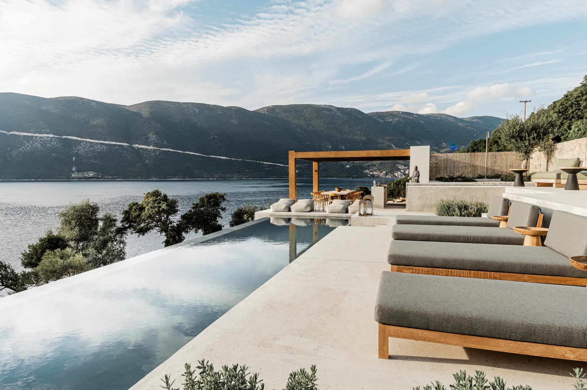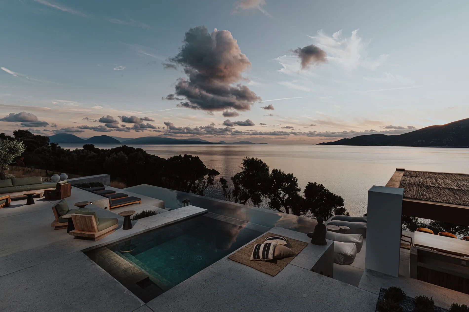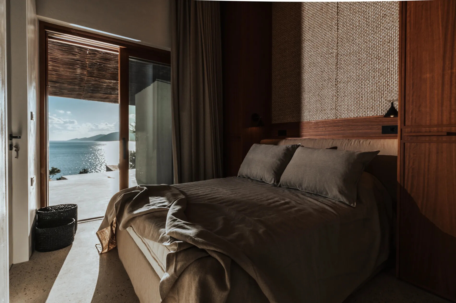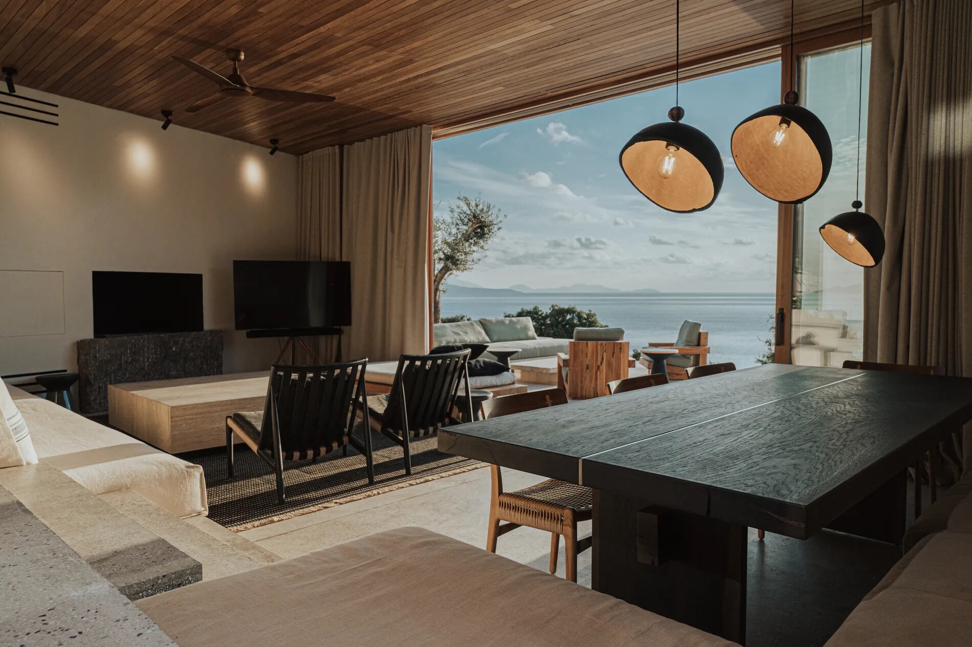 The interior design is characterized by minimalist elegance, using natural tones and raw materials to great effect. Large wall-to-wall windows flood the space with sunlight while framing uninterrupted views of the glistening Ionian Sea.