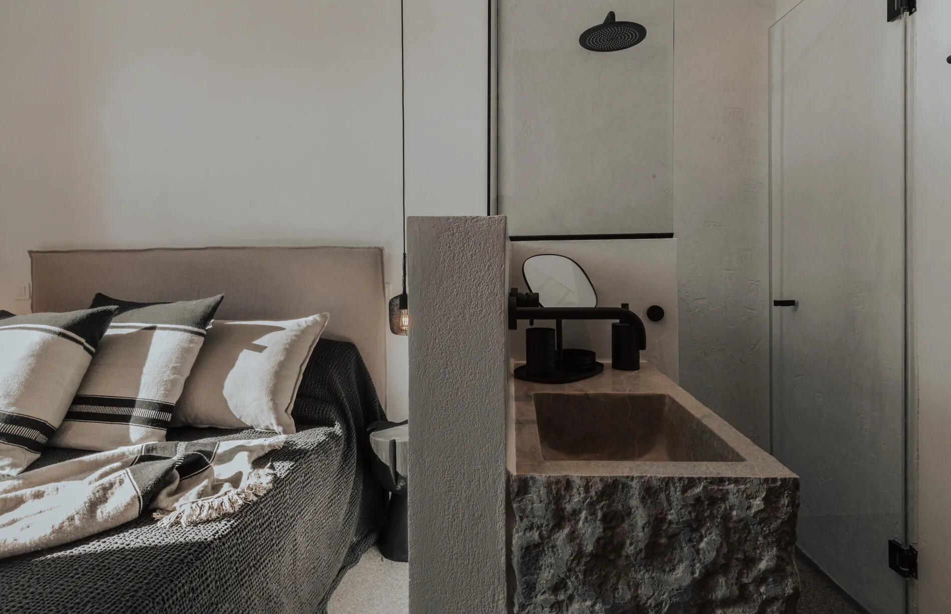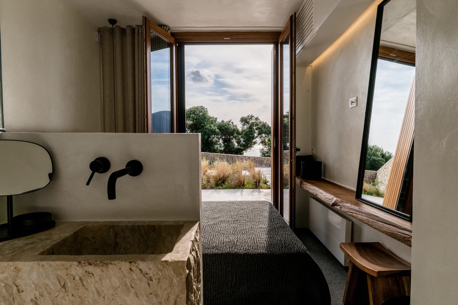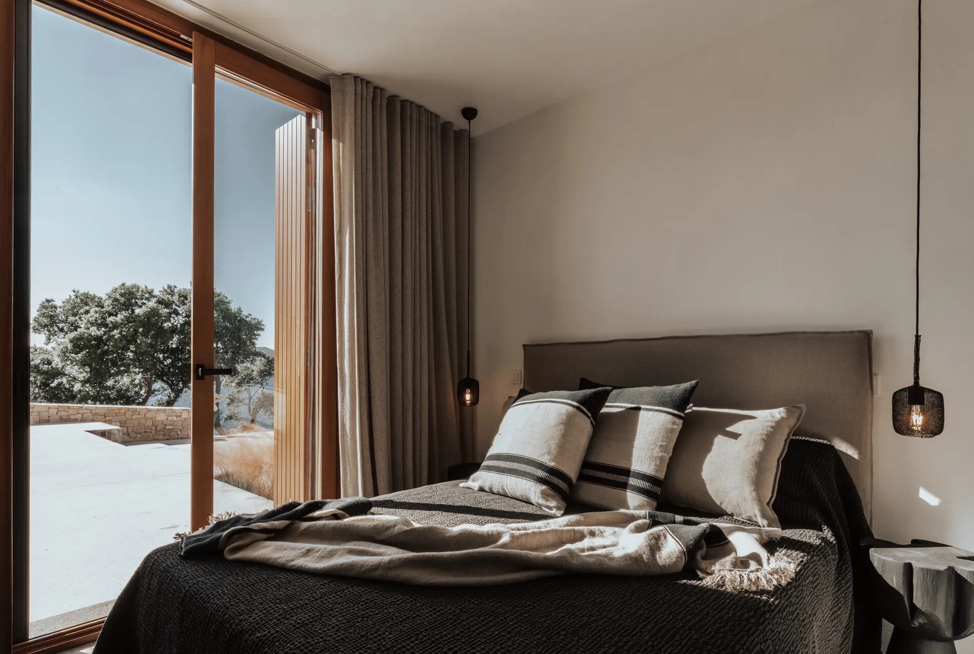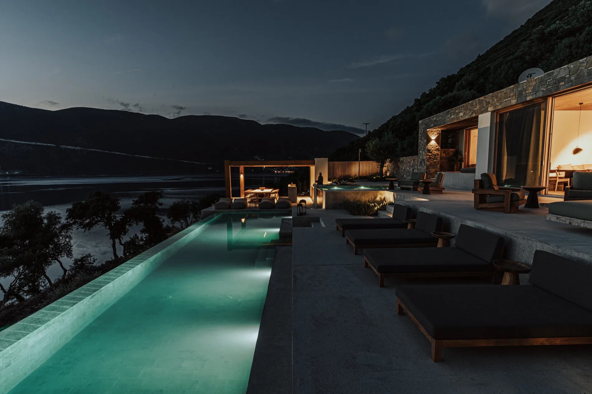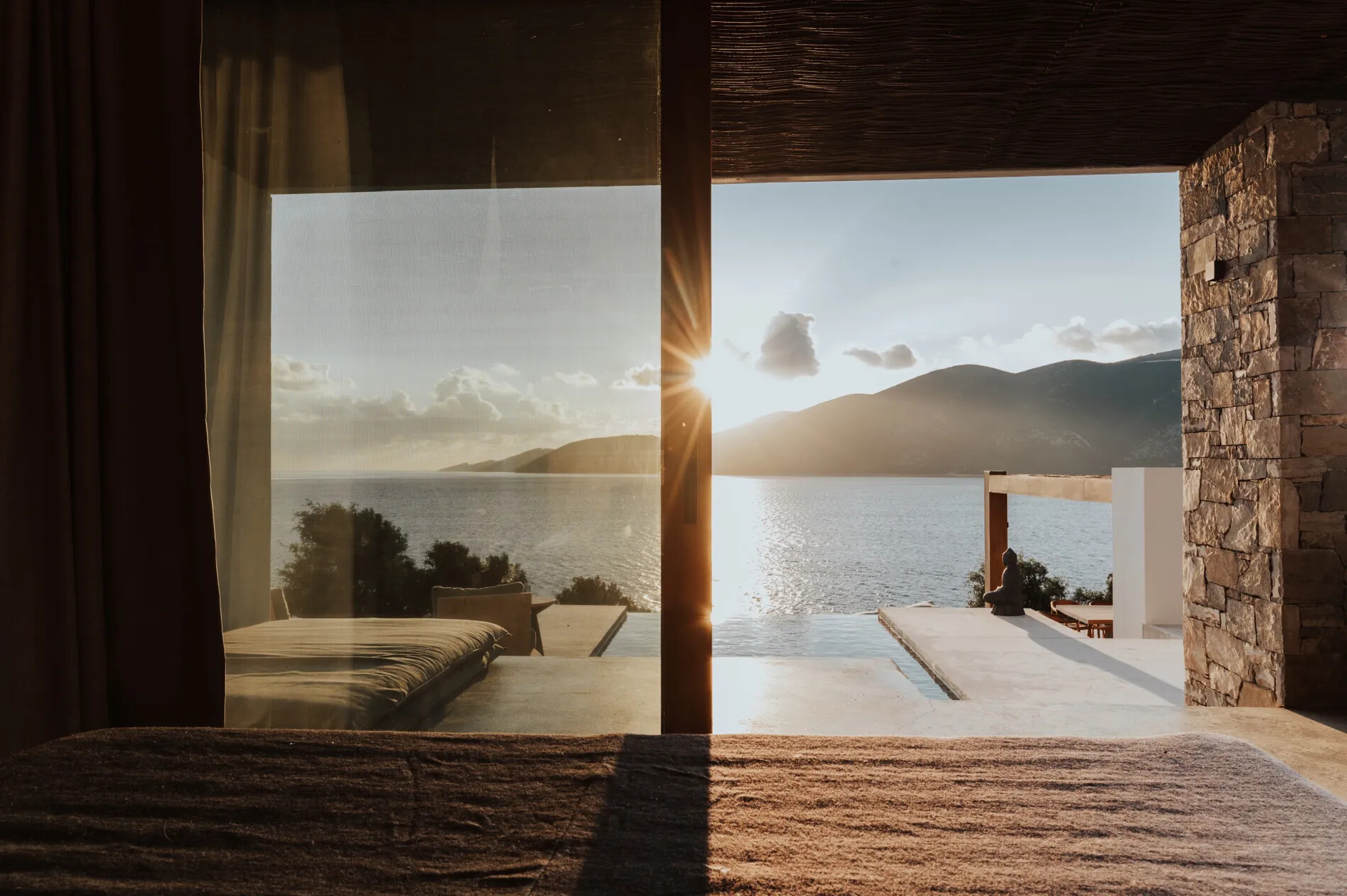 The interior design is characterized by minimalist elegance, using natural tones and raw materials to great effect. Large wall-to-wall windows flood the space with sunlight while framing uninterrupted views of the glistening Ionian Sea.