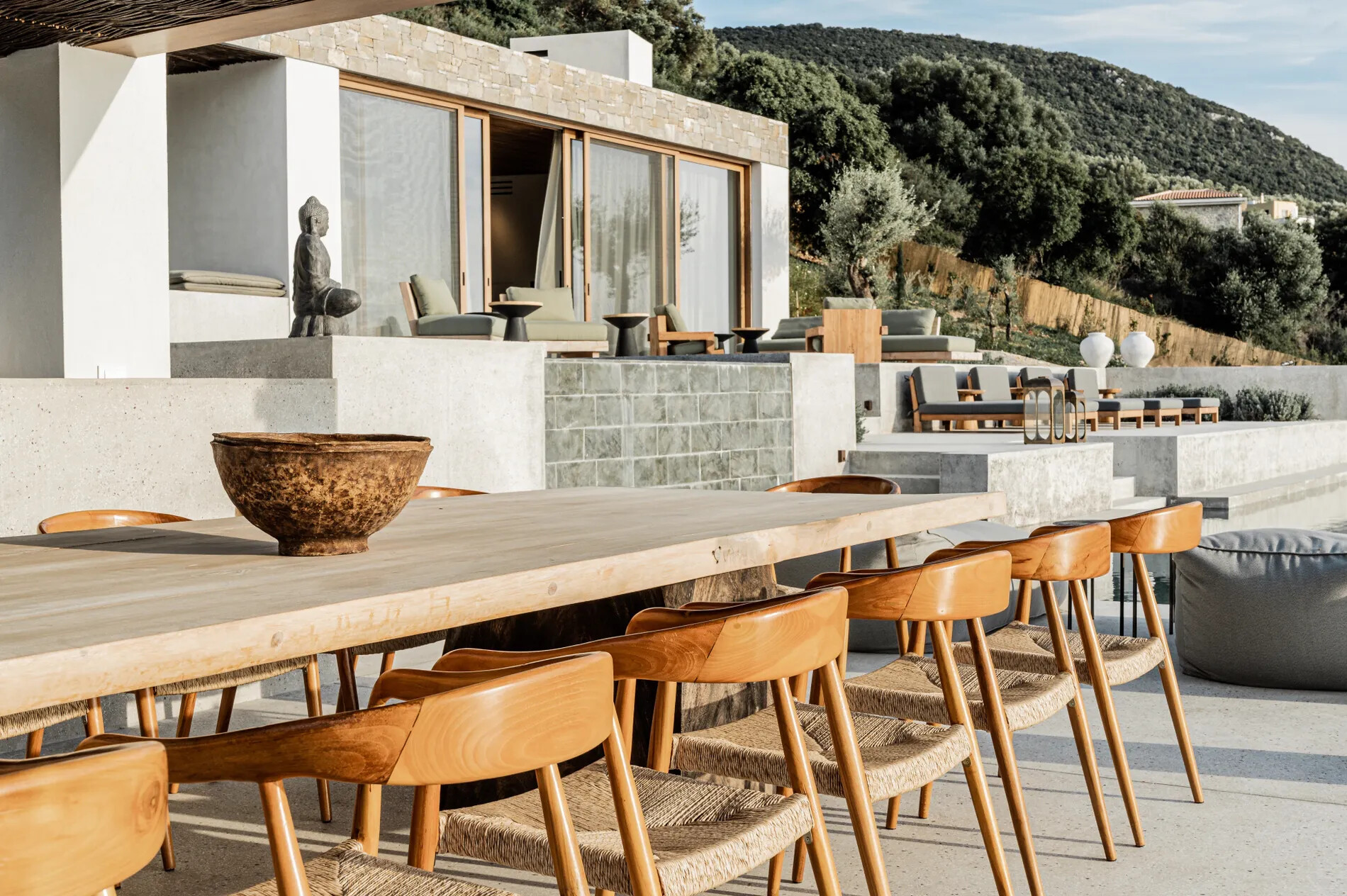 Large terraces open up to panoramic seascapes, ideal for relaxing or entertaining. A sleek infinity-edge swimming pool invites you to unwind while gazing out at the deep blue horizon. Outdoor dining beneath a shaded pergola creates a perfect setting for sharing meals with friends and family.
