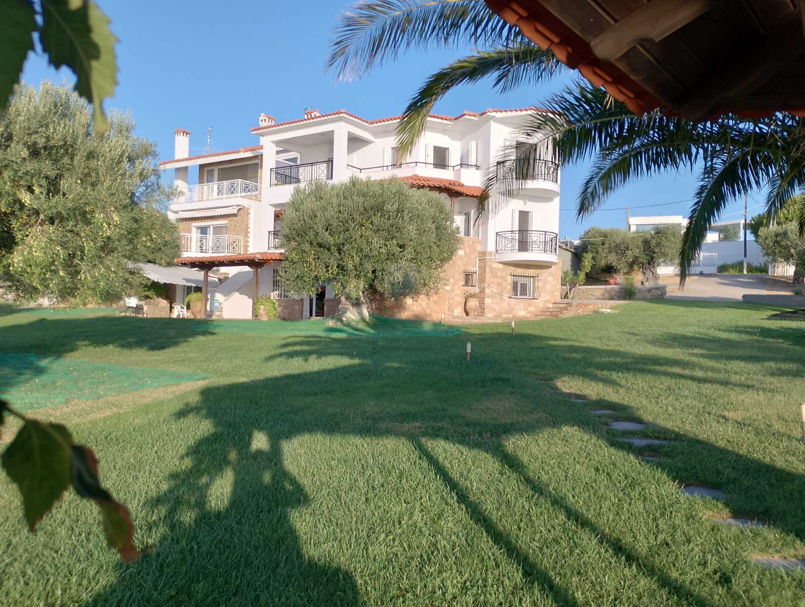 The property occupies a prime 5,500 sq.m. plot with direct access to the sea and features a total living area of 400 sq.m., consisting of a main villa and two independent maisonettes.