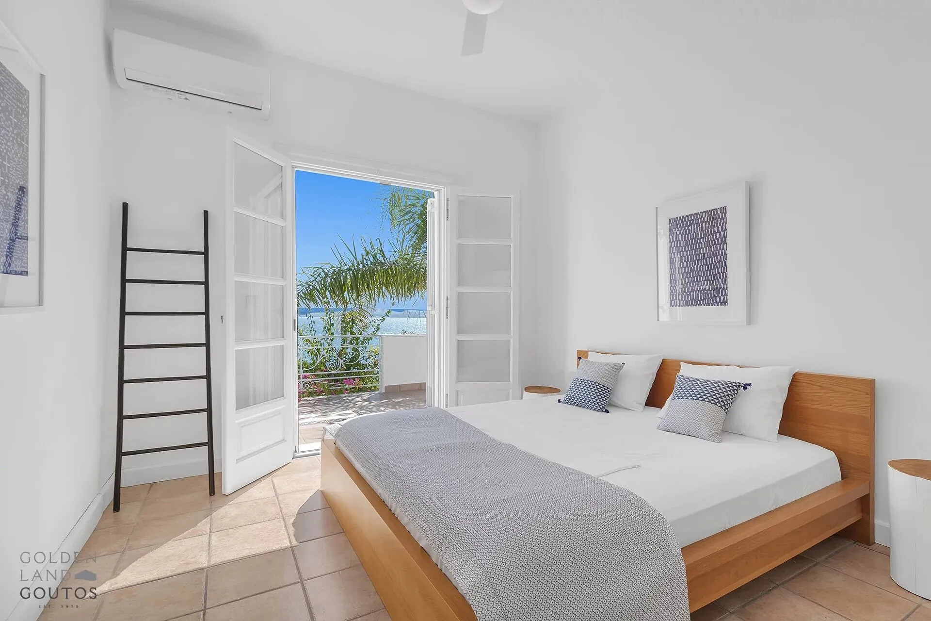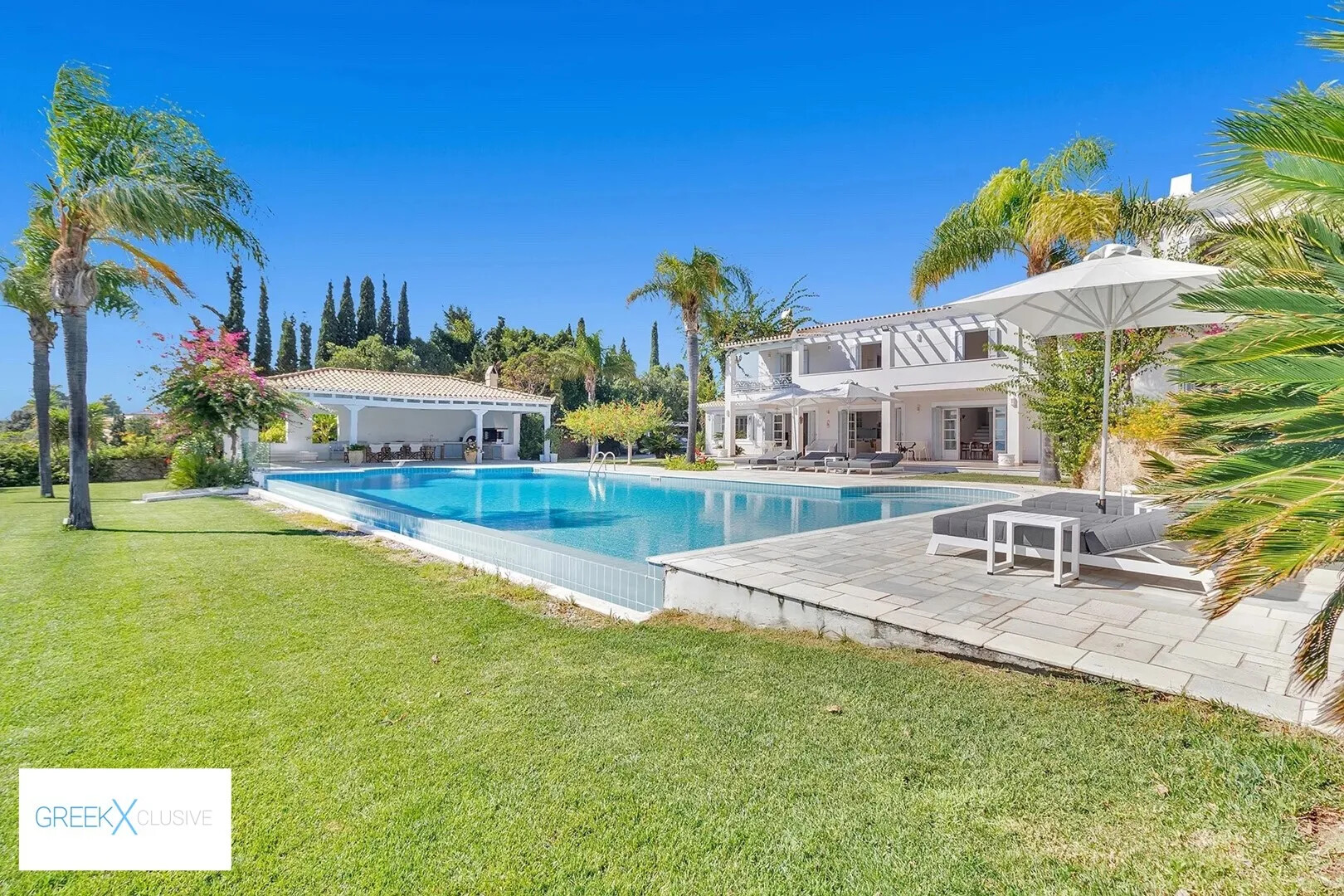 The villa is surrounded by manicured gardens filled with bougainvilleas and palm trees, creating a serene Mediterranean ambiance. Wide balconies and shaded verandas offer spectacular views of the large swimming pool and the shimmering sea.