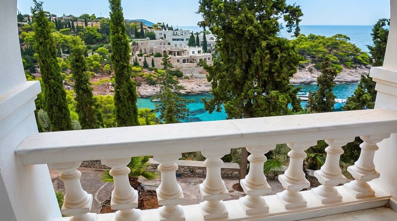 House for sale with a total area of 440 sq.m. on a fantastic area of 35,000 sq.m. which provides complete discretion and autonomy as it is accessible by air and sea. It includes trees with fresh fruit and a small farm with poultry, rabbits and other animals. The area includes 2 private beaches and a marina for large yachts. It provides water, electricity, telephone-internet and cable TV. He can build a 7,000 sq.m. hotel. The maisonette has separate buildings for guest house, spa, gym, home theater, bar with indoor jacuzzi, service rooms, security room etc. all on 1 acre capable of housing over 20 staff. In the next 6 acres there is a wonderful garden with over 100 palms, olives, peaches, lotuses, and other citrus trees and includes an indoor private swimming pool of 200sq.m. It has a helipad. About the Maisonette: it is of three levels with Penteli marbles. Each bedroom includes a bathroom and study room, 1 Guest Suite-Apartment (with separate Living Room, Kitchen, Bathroom), Living Room, fireplace, TV Area, Dinning Area, large kitchen (with professional criteria), Guest WC, large room for wine cellar and large terraces with incredible views. Additional Extras – 1 Boat MasterCraft 190 Barefoot (425 HP) – 1 Suzuki Jeep – 2 Honda 100cc