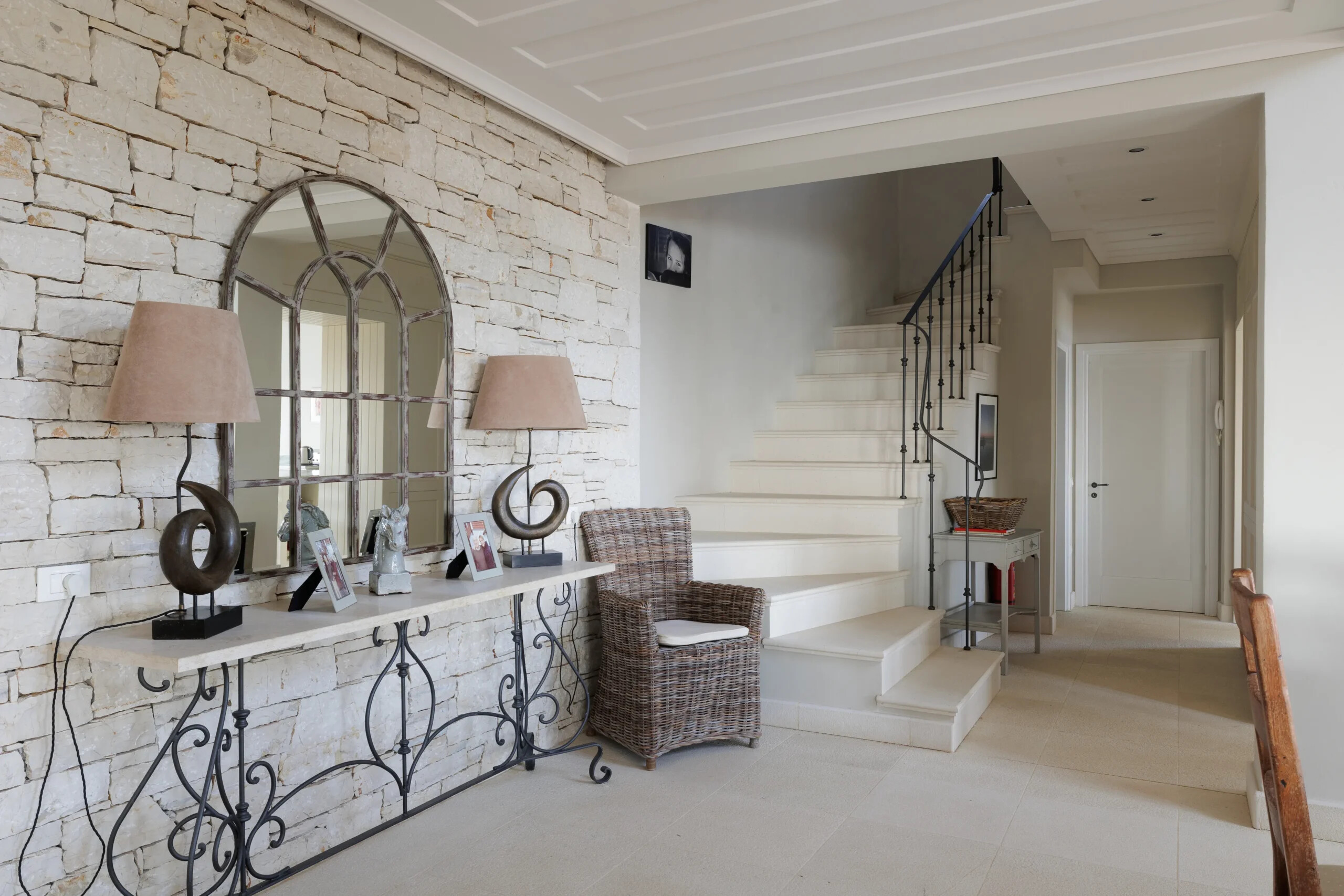 The upper villa boasts a kitchen/dining room leading to an outdoor wisteria-covered dining area, a spacious living room with a stone fireplace, and two double bedrooms with en-suite and adjacent bathrooms. Floor-to-ceiling doors open onto the terrace, with a marble staircase leading to the master bedroom featuring a walk-in closet, en-suite bathroom, and balcony.