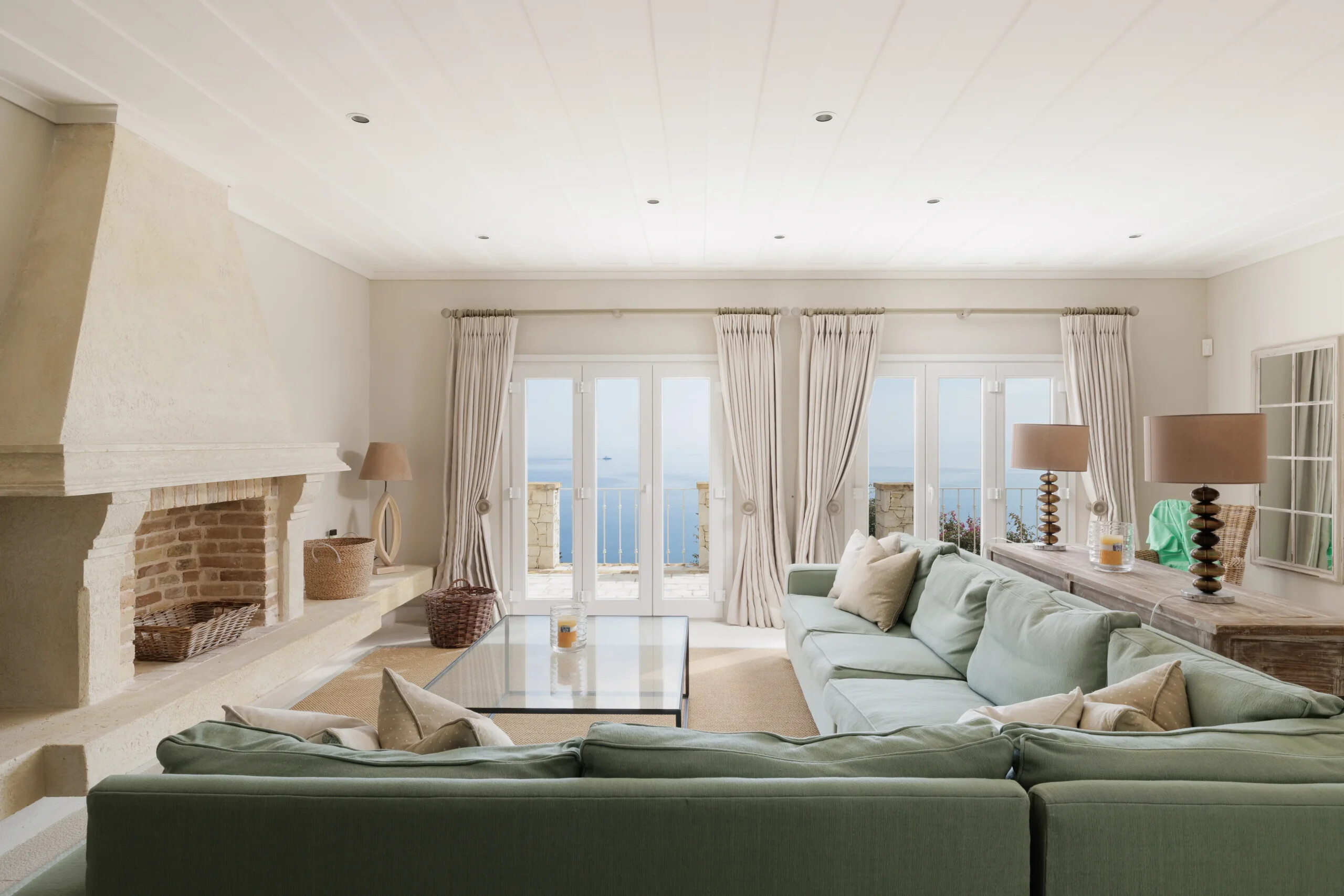 The exterior dining and seating areas offer spacious, shady spots with stunning bay views towards Corfu Town and Paxos. The terrace by the pool, complete with a barbecue area, is designed for entertaining larger gatherings. The infinity pool seamlessly blends with the sea, providing an idyllic spot to soak up the sun or enjoy a refreshing swim amid olive groves and greenery, creating a peaceful oasis to unwind and disconnect.