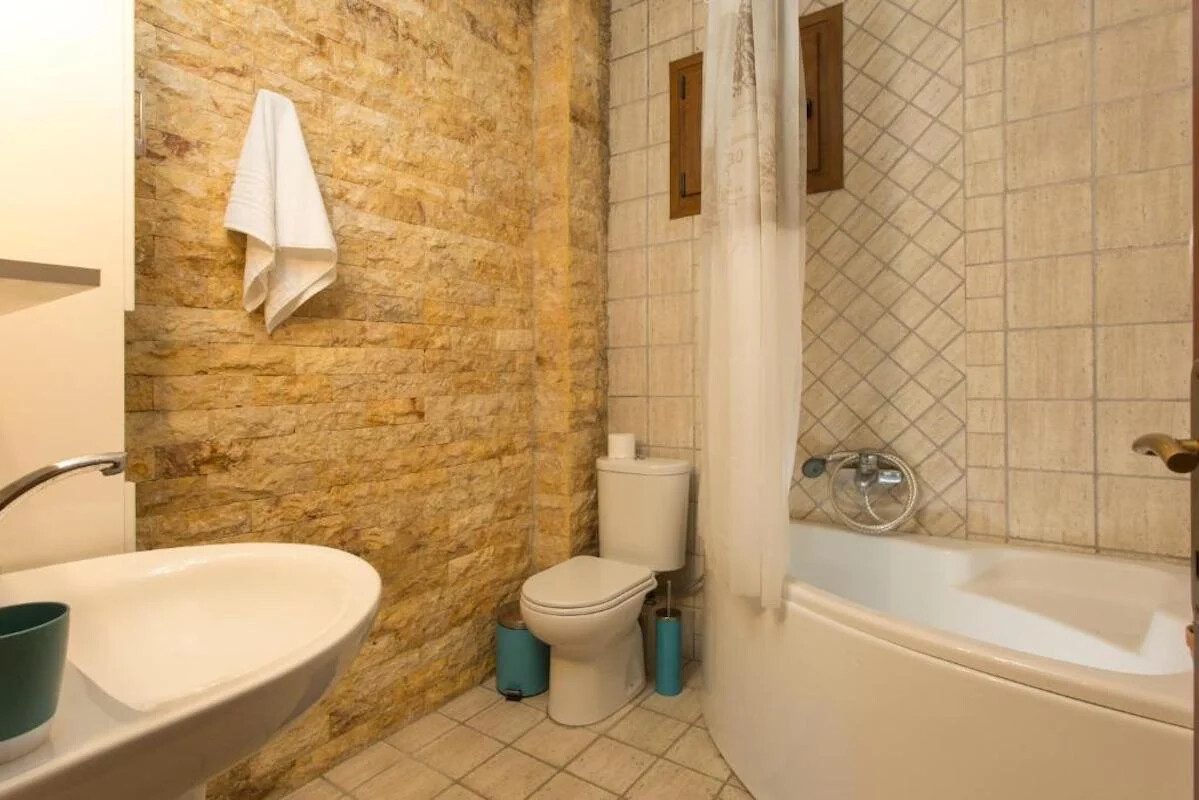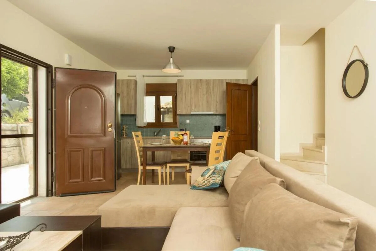 - Spacious living room and modern equipped kitchen seamlessly blend natural materials like stone and wood.