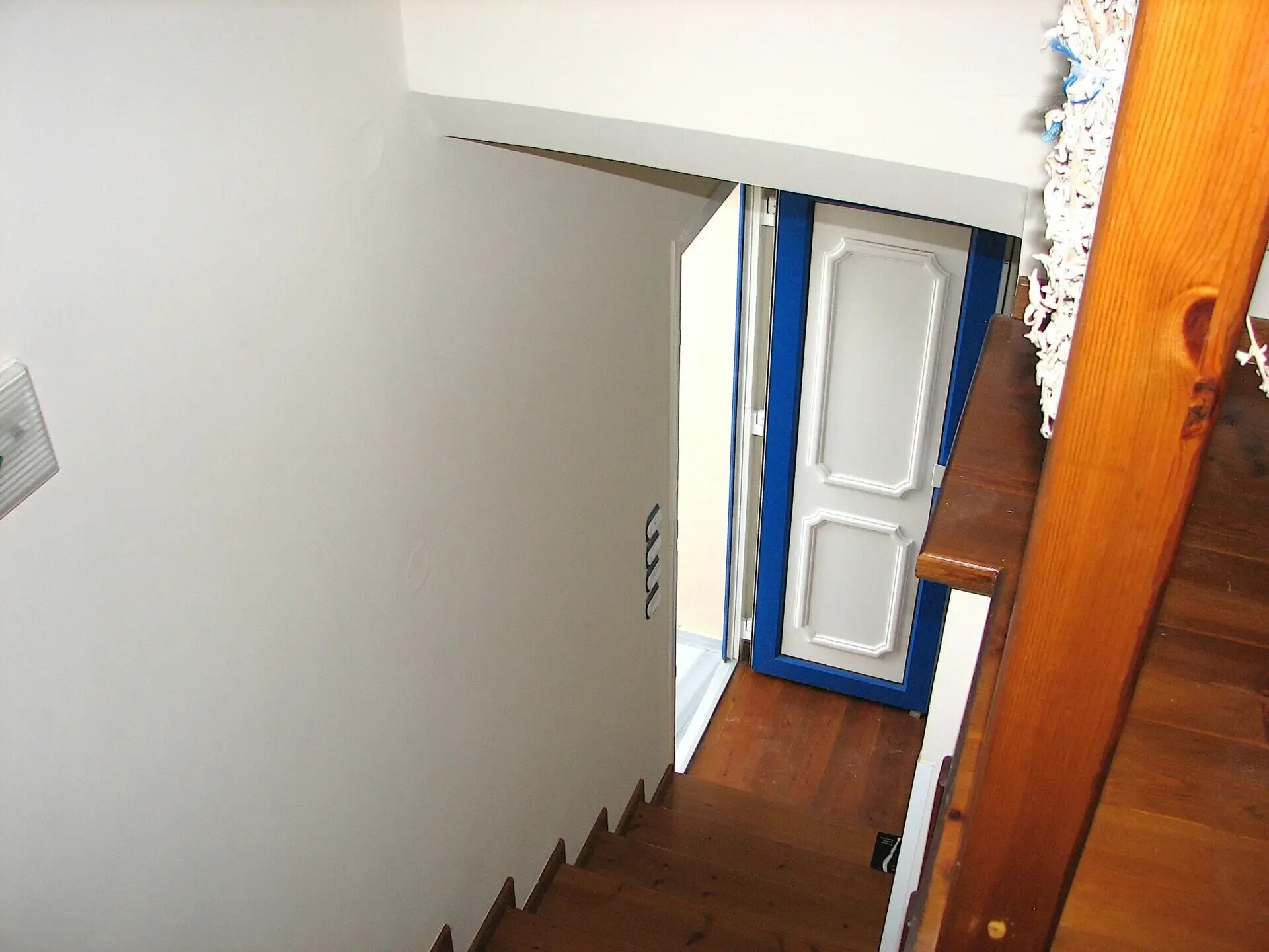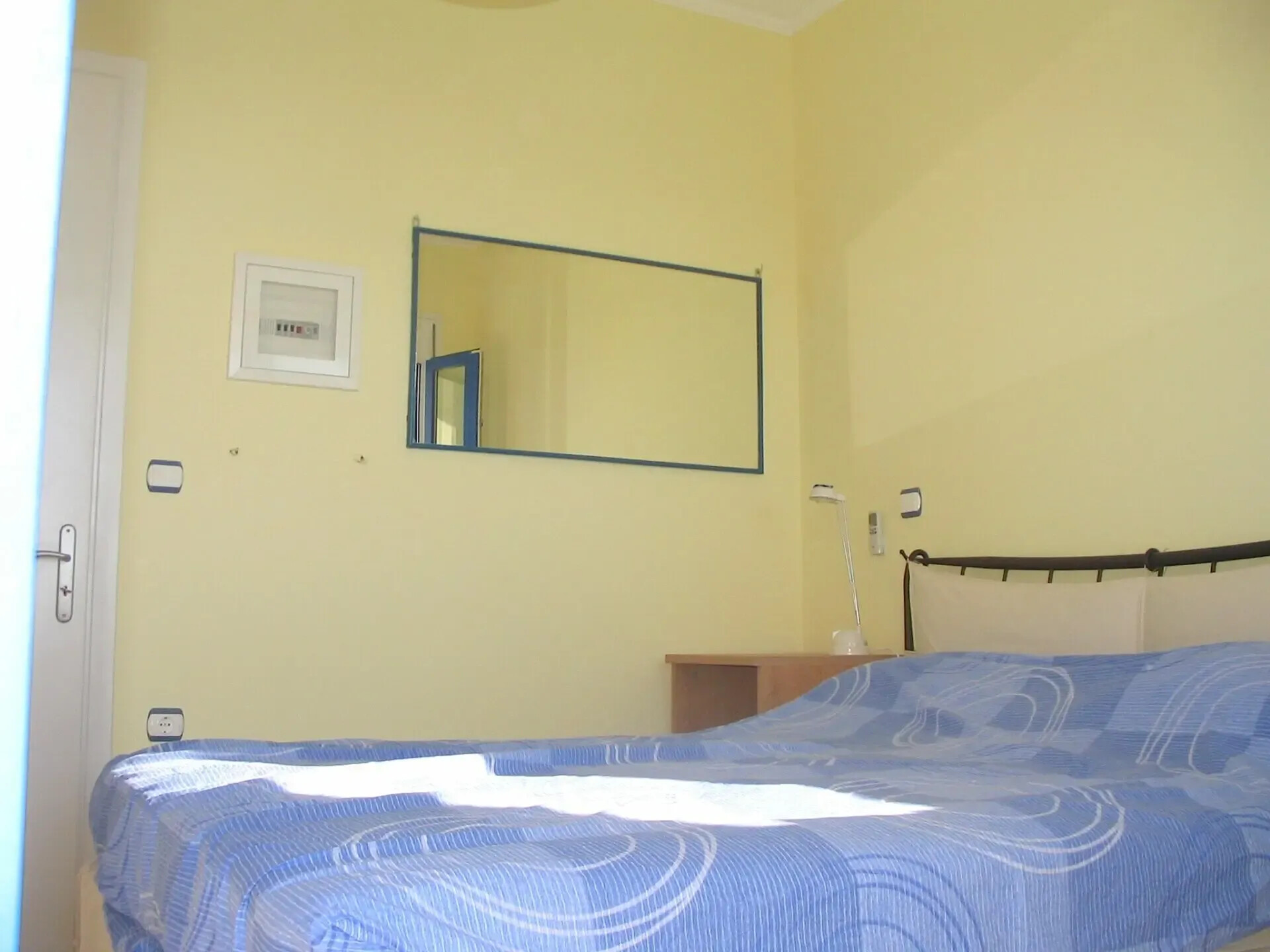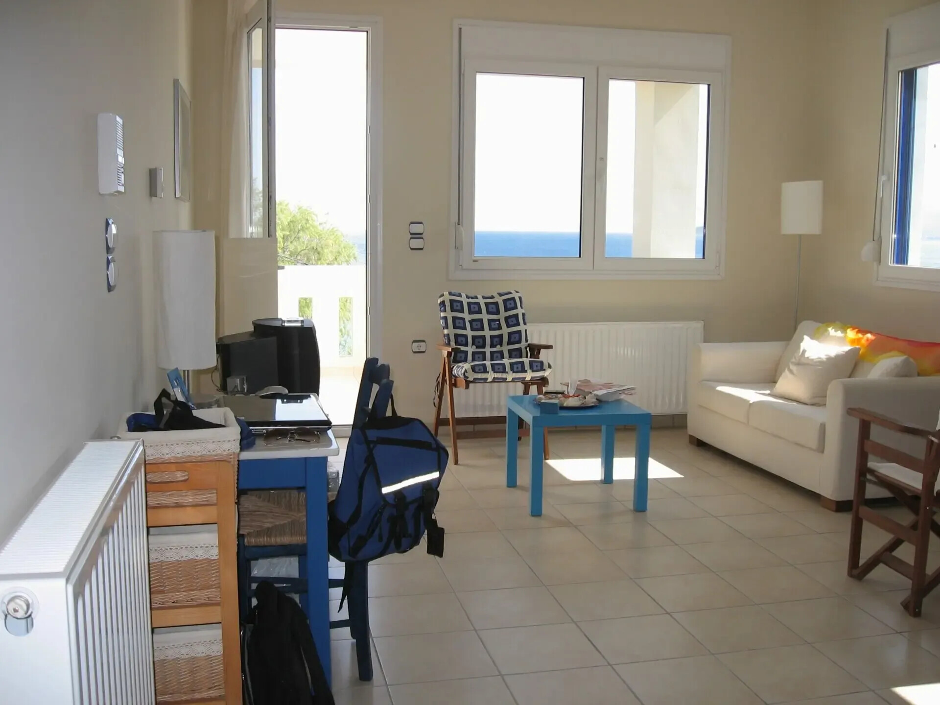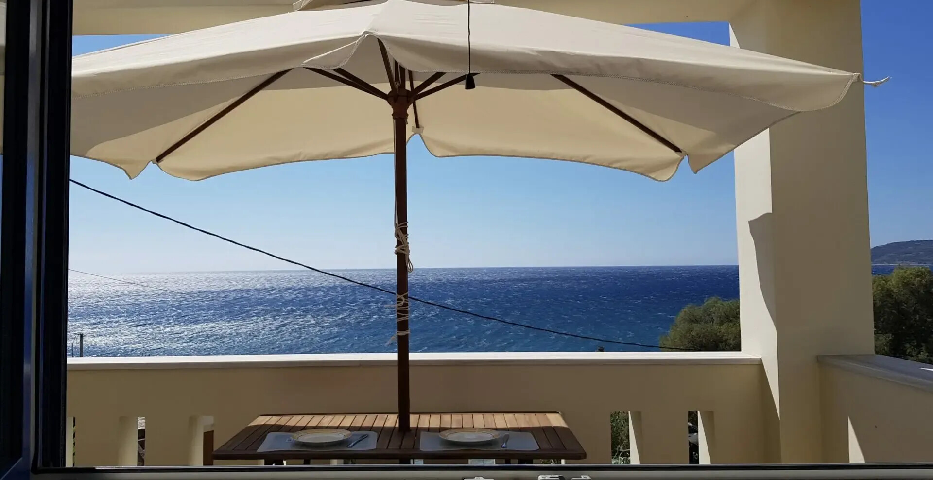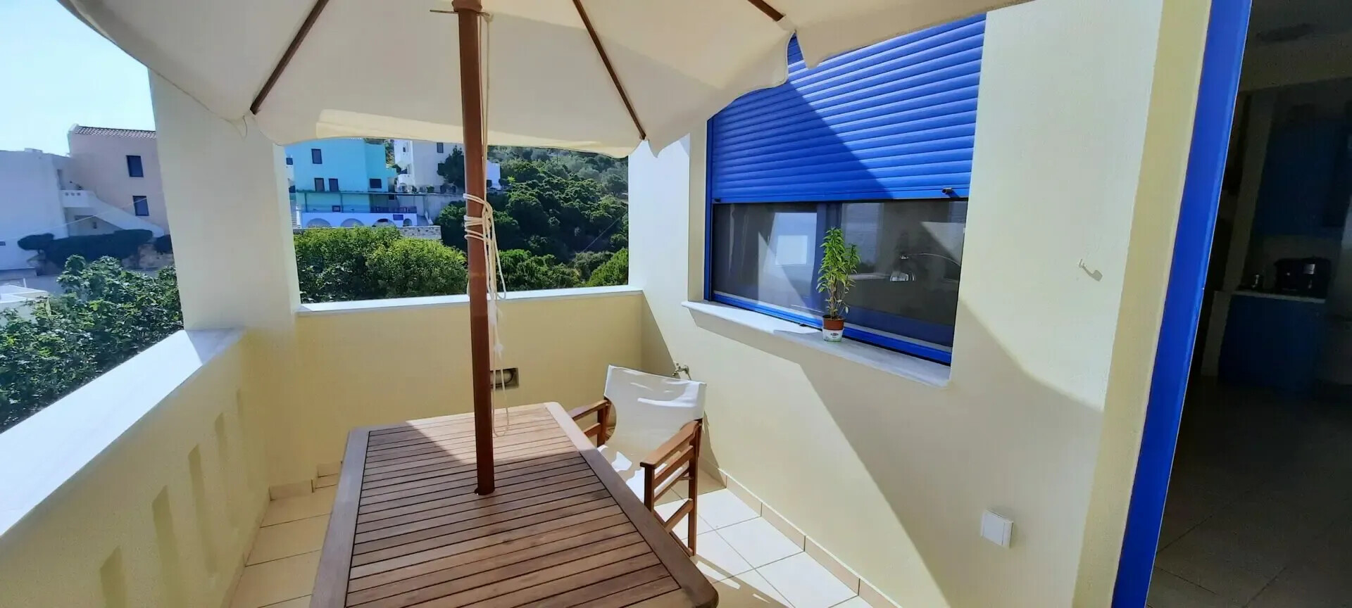The upper level houses the second bedroom and an additional bathroom with a shower. This bedroom also opens onto a spacious balcony overlooking the sea and offering views of the Turkish coastline on the horizon.