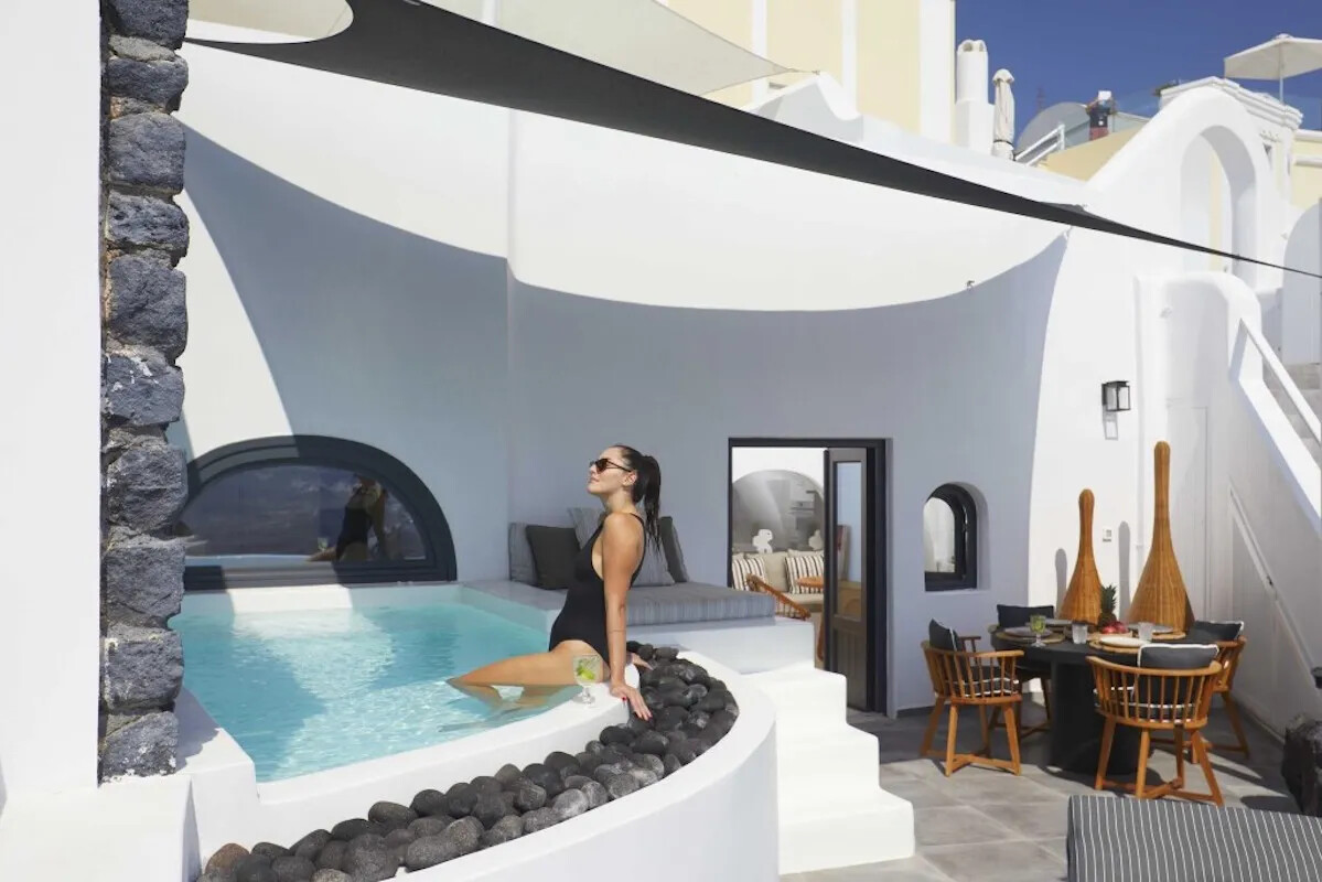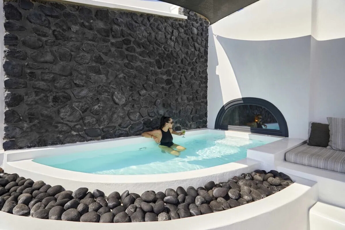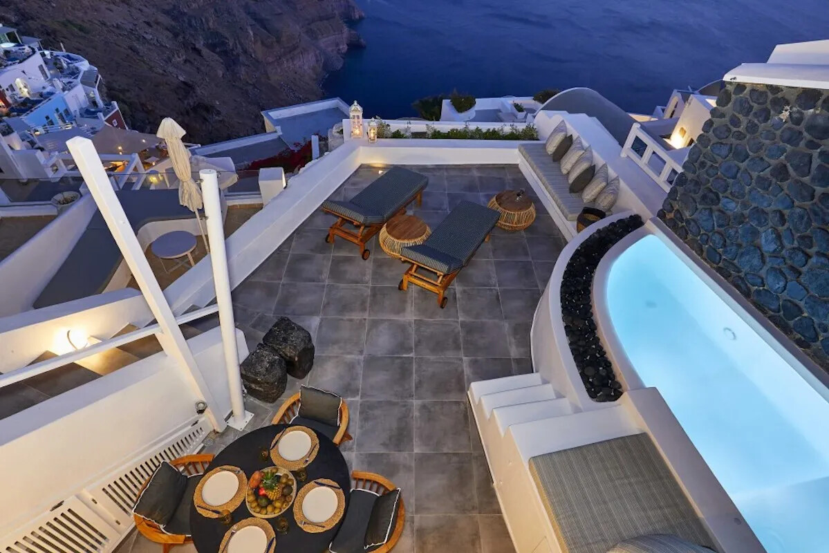 The spacious private courtyard is the crown jewel of this home, featuring an outdoor heated jacuzzi that invites relaxation with breathtaking views over the caldera. It is the perfect place to enjoy a sunset drink or peaceful morning coffee.