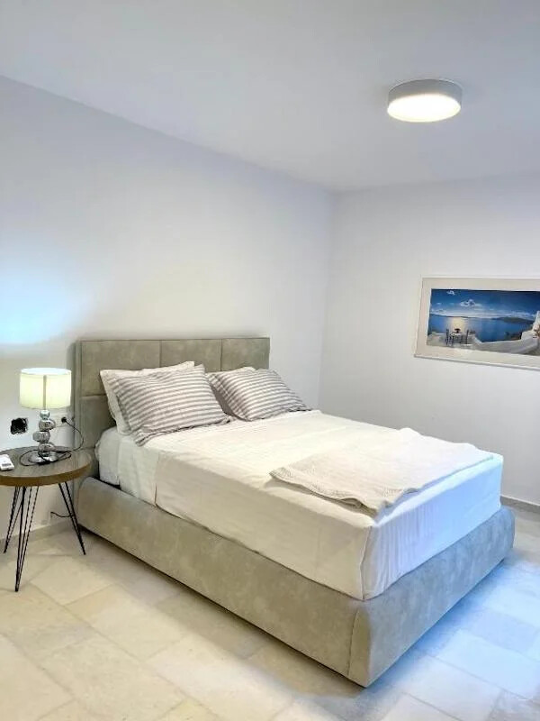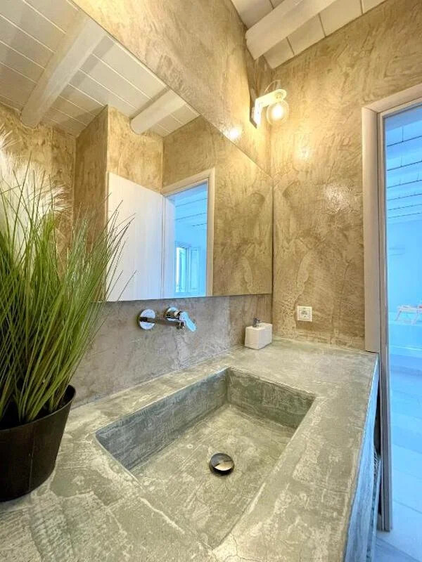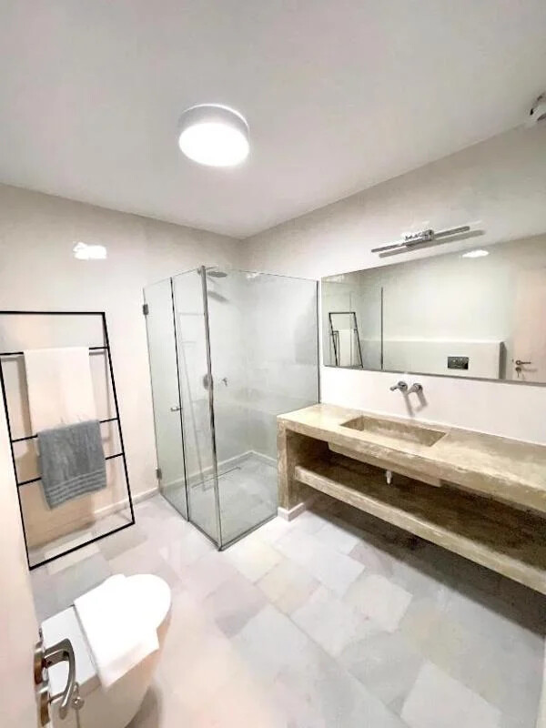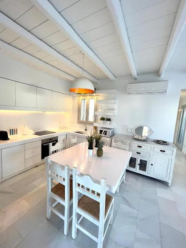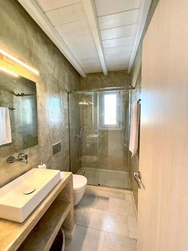• White marble floors, wooden ceilings, and cement coatings in bathrooms and kitchen for a touch of luxury.