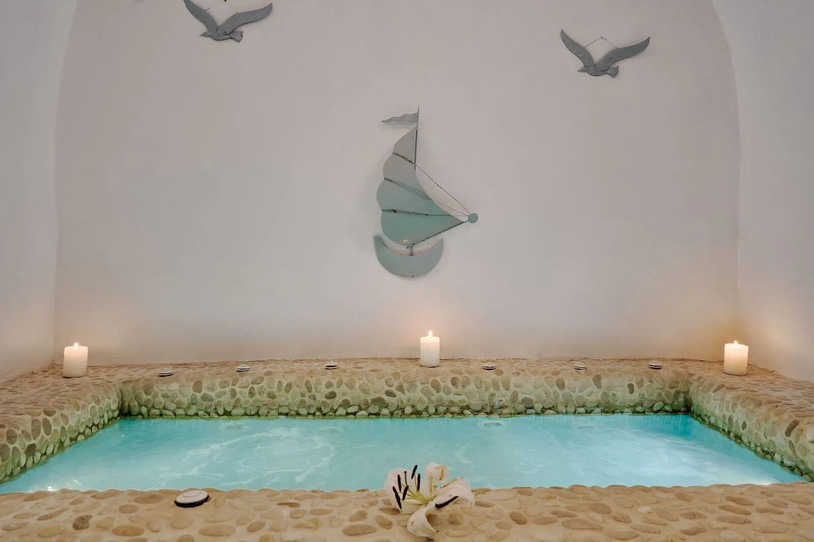 - Terraces: Expansive balconies with panoramic views of the caldera, the volcano, and the Aegean Sea