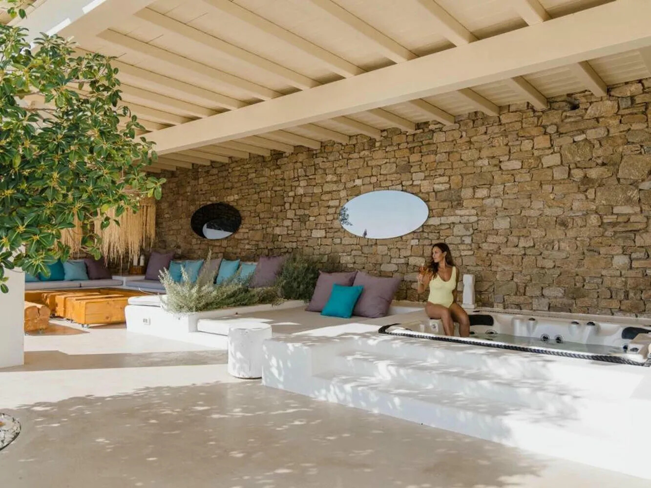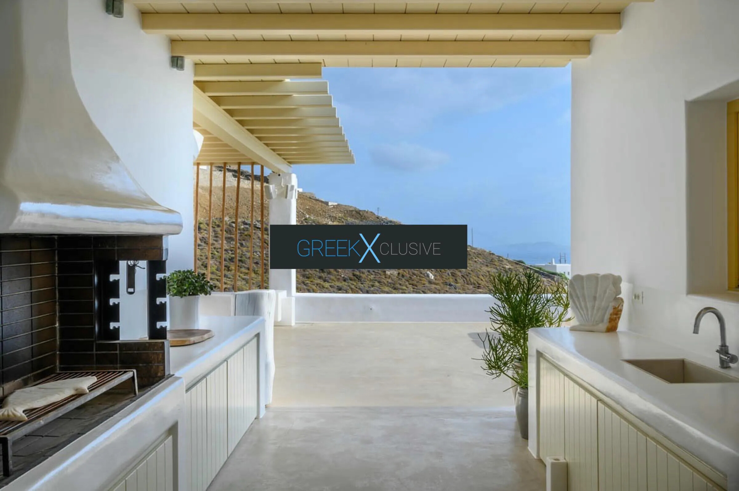 The outdoor areas are designed for entertainment and relaxation, featuring an outdoor kitchen, BBQ area, and a dining space to fully enjoy the beautiful Mykonos weather. The villa is perfectly positioned to capture mesmerizing sunsets, providing an idyllic setting for evening relaxation.