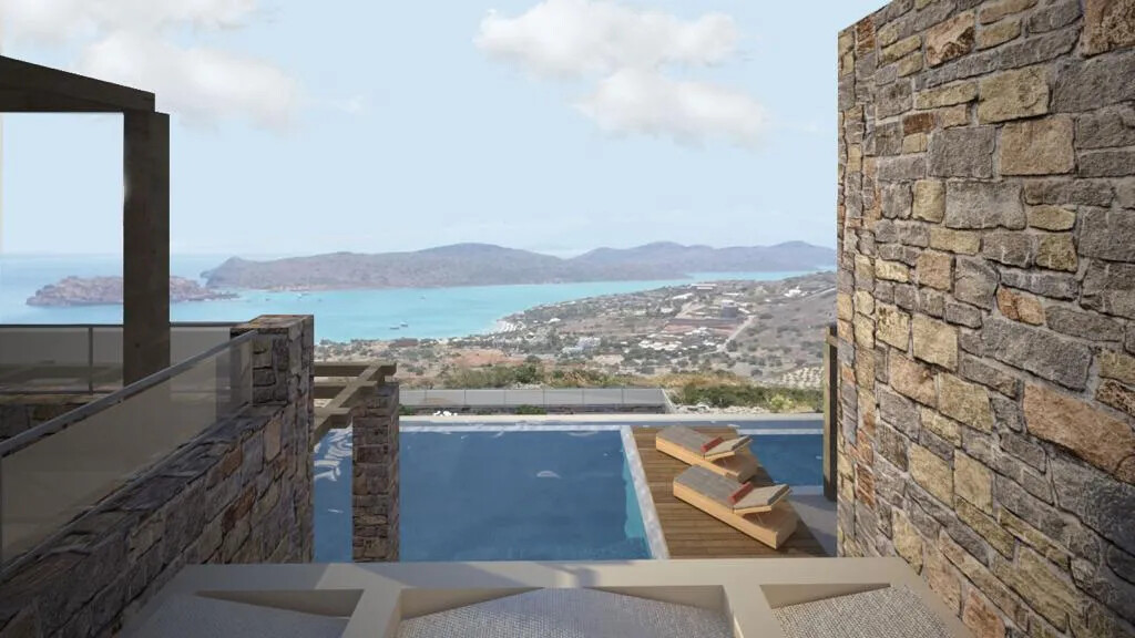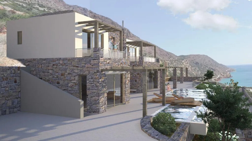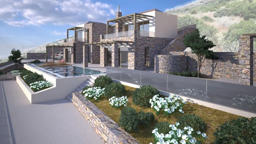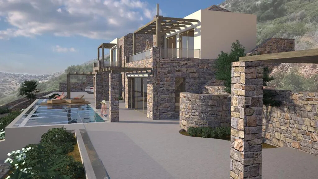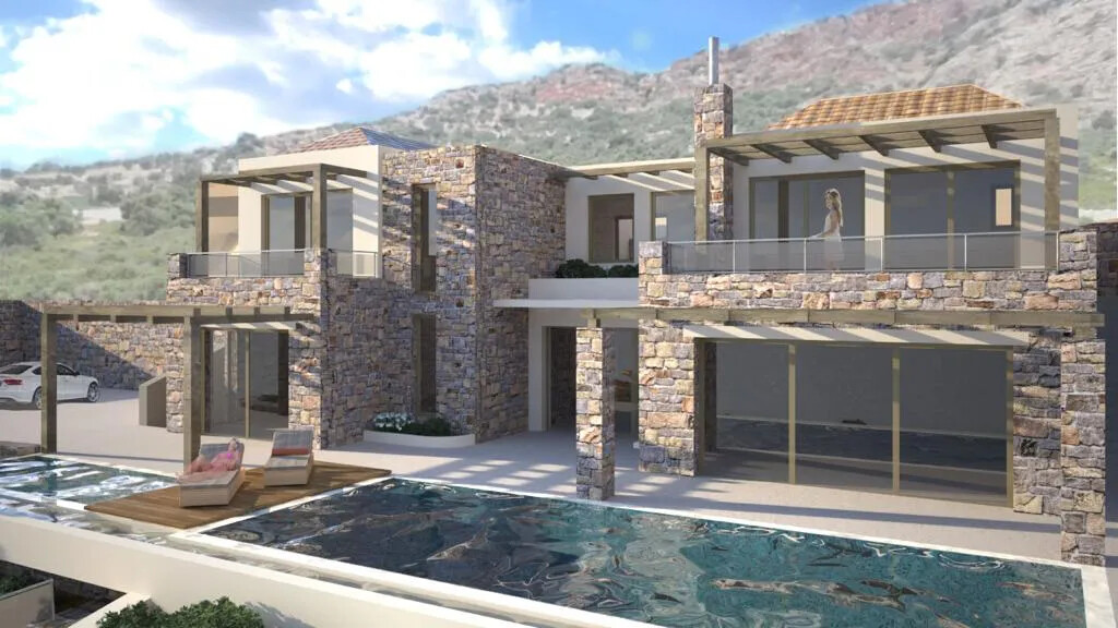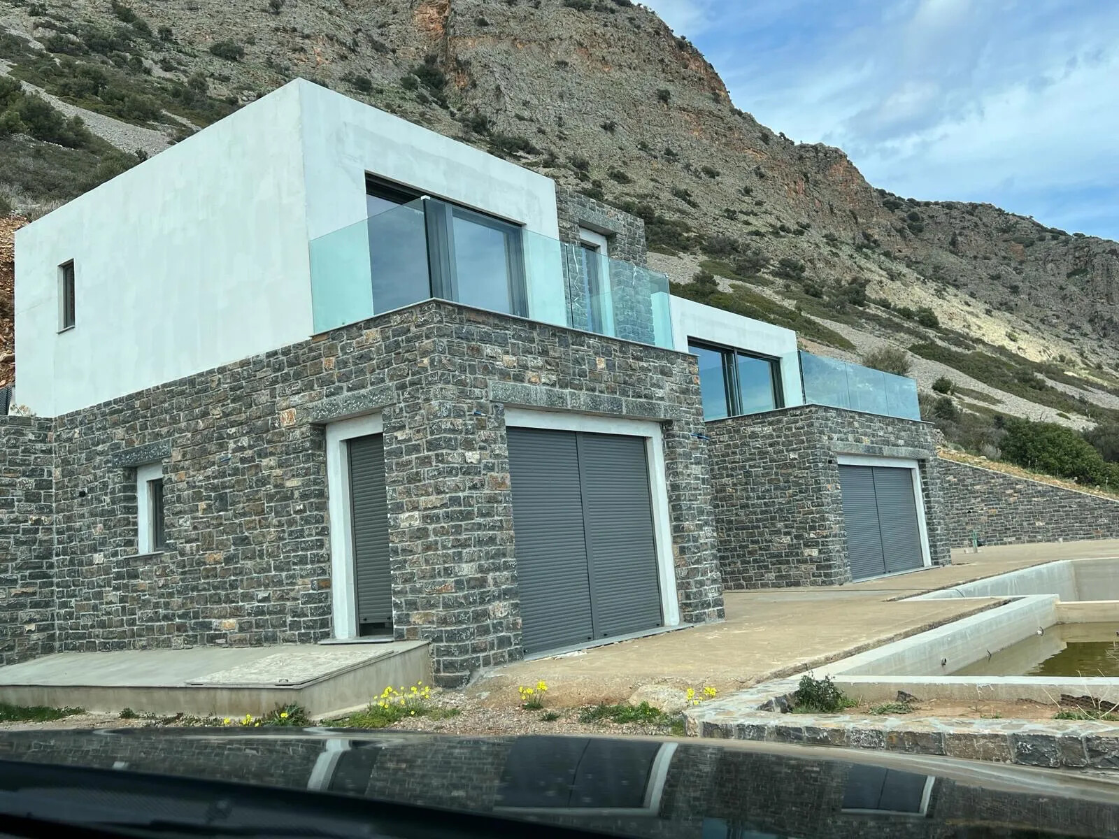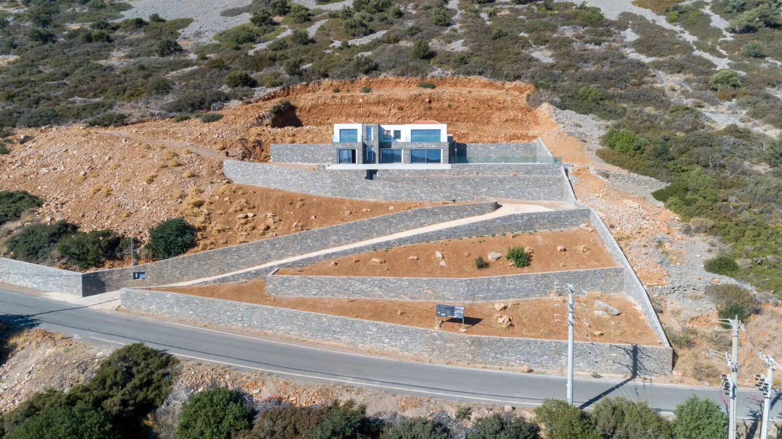 An under-construction villa spanning 520 square meters is now available for sale in the picturesque area of Plaka, Elounda in Crete. Situated on a spacious plot of 13,000 square meters, this villa offers three floors: a basement, ground floor, and first floor.