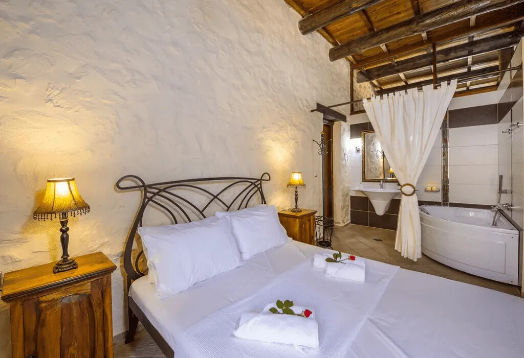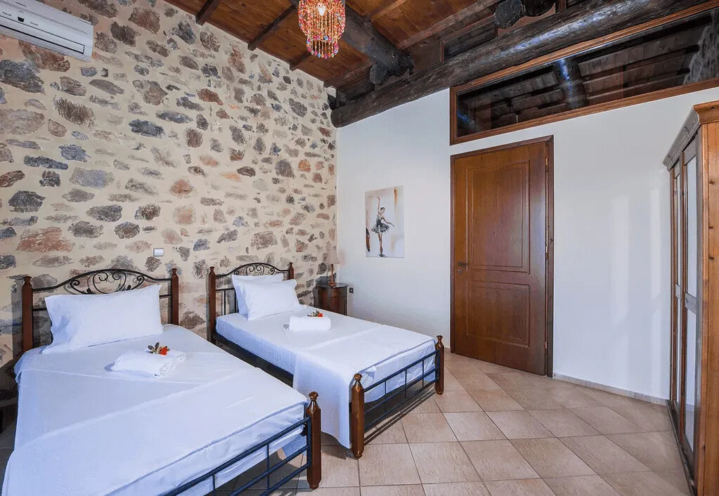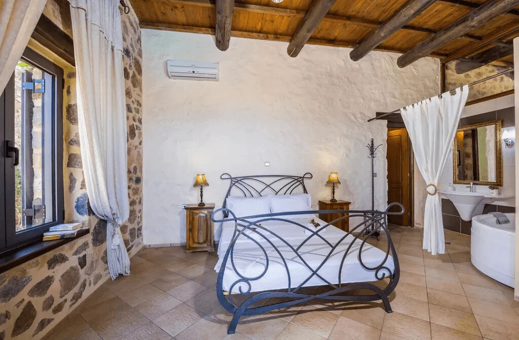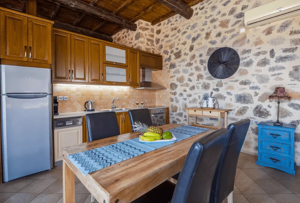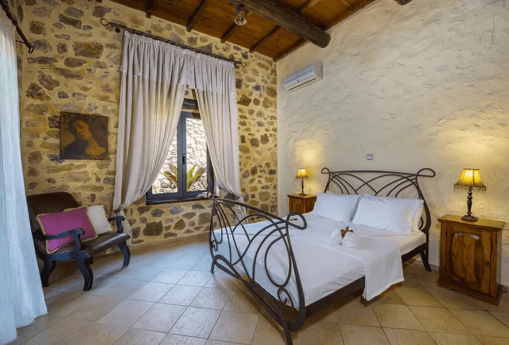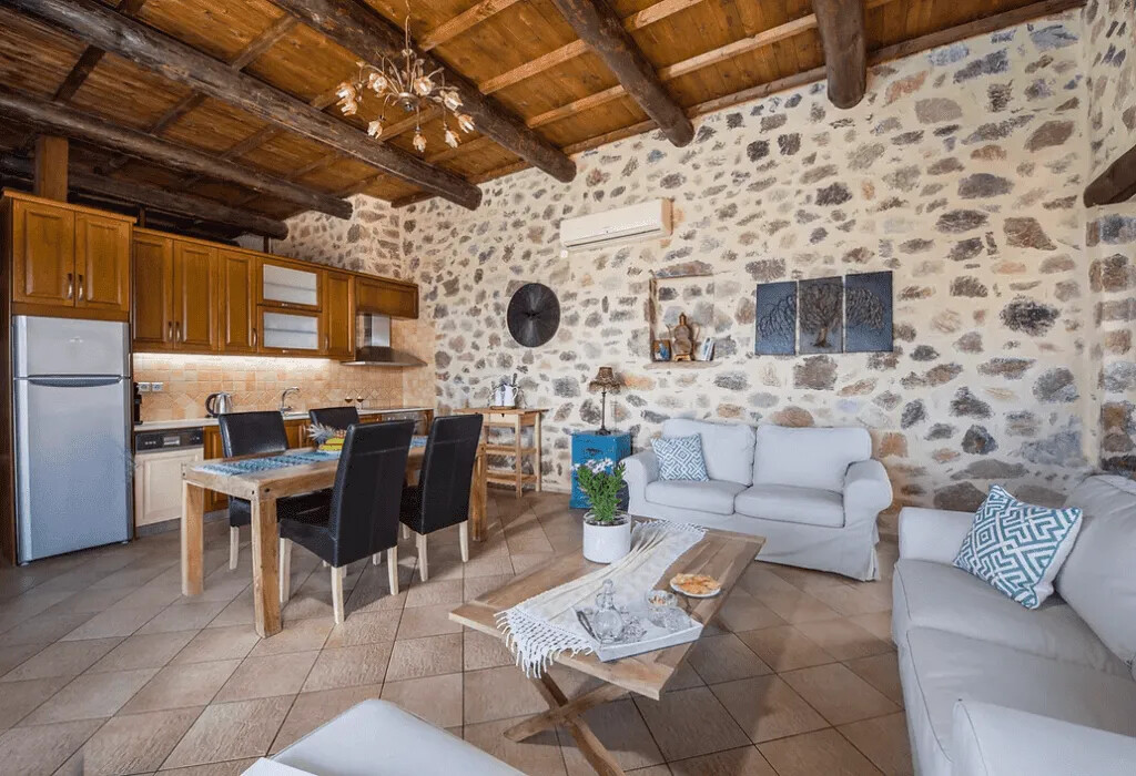 Villa For Sale in Kissamos Chania Crete is positioned on a 1,000 sq.m. private plot, enveloped by olive groves and lush greenery. Built from local natural stone, round wooden beams, and clay tiles, it harmoniously blends into the hillside. A short walk leads to the region’s wild, secluded beaches, offering a unique seaside experience.