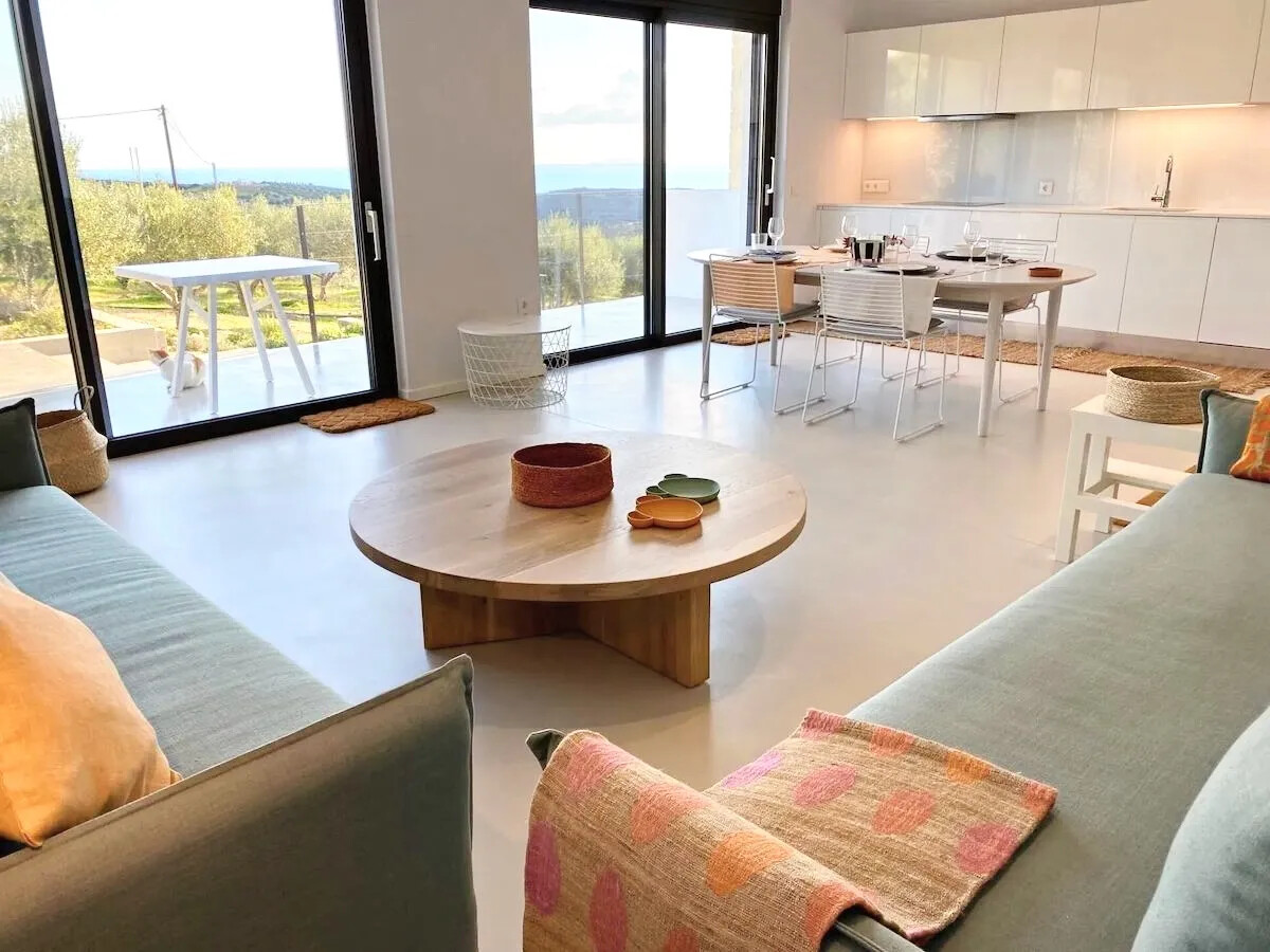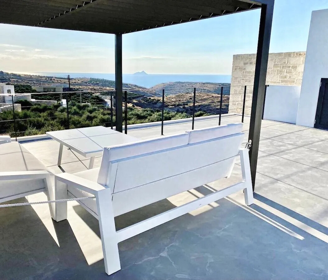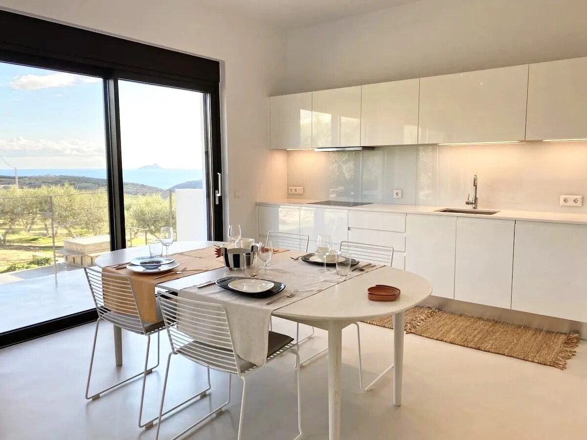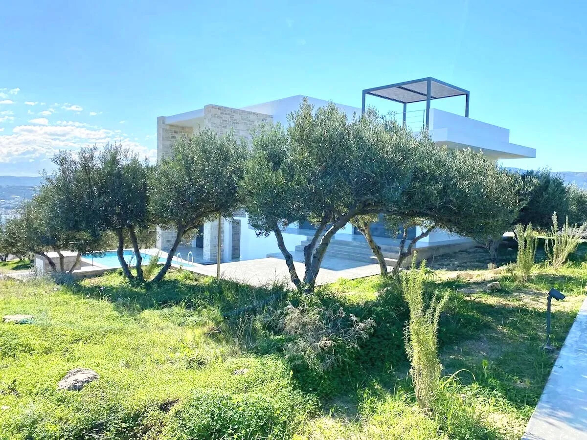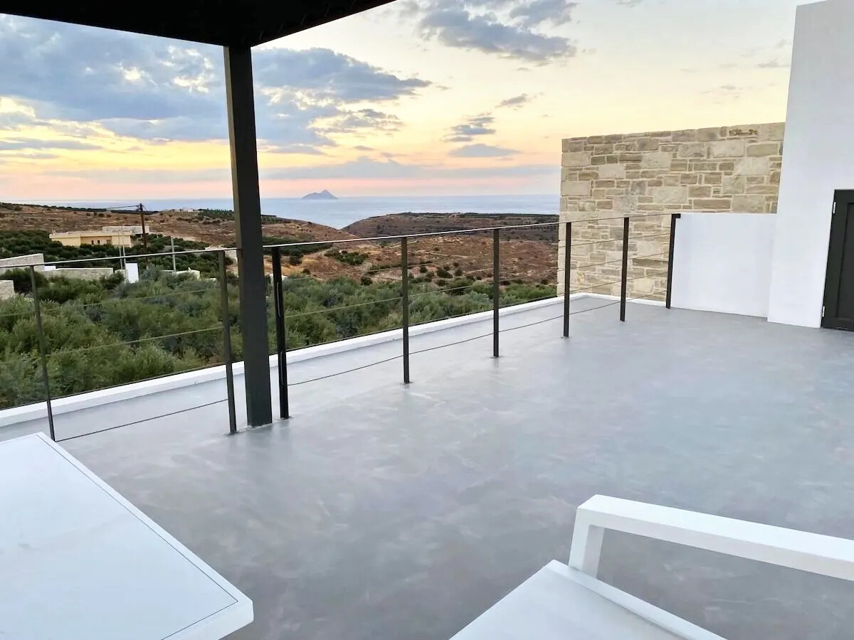 An exclusive new villa with modern, minimal design. Situated in a countryside surrounding in south Crete, out of Kamilari village. Built on a hill plot among olive groves, all rooms offer spectacular views of the sea and the surrounding areas.