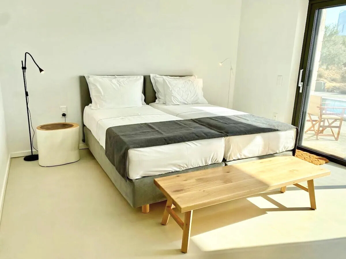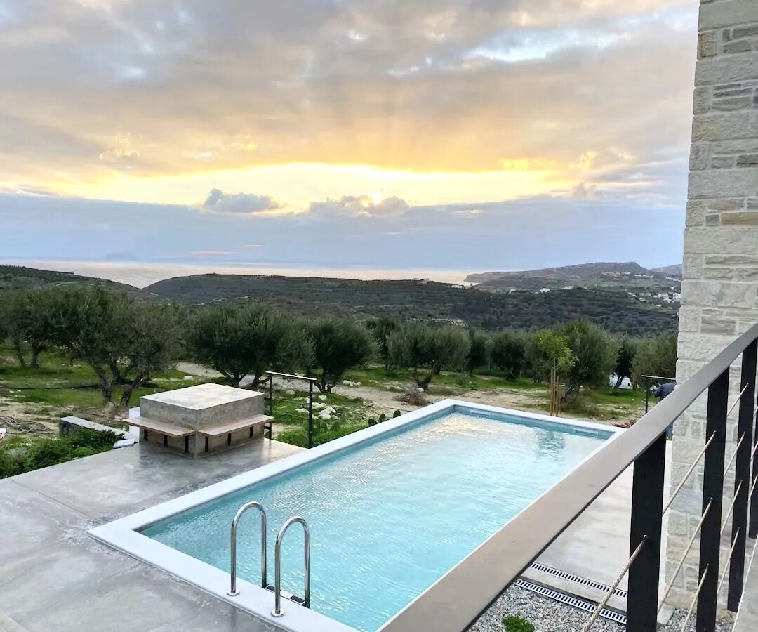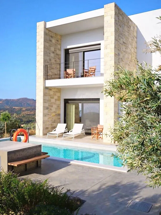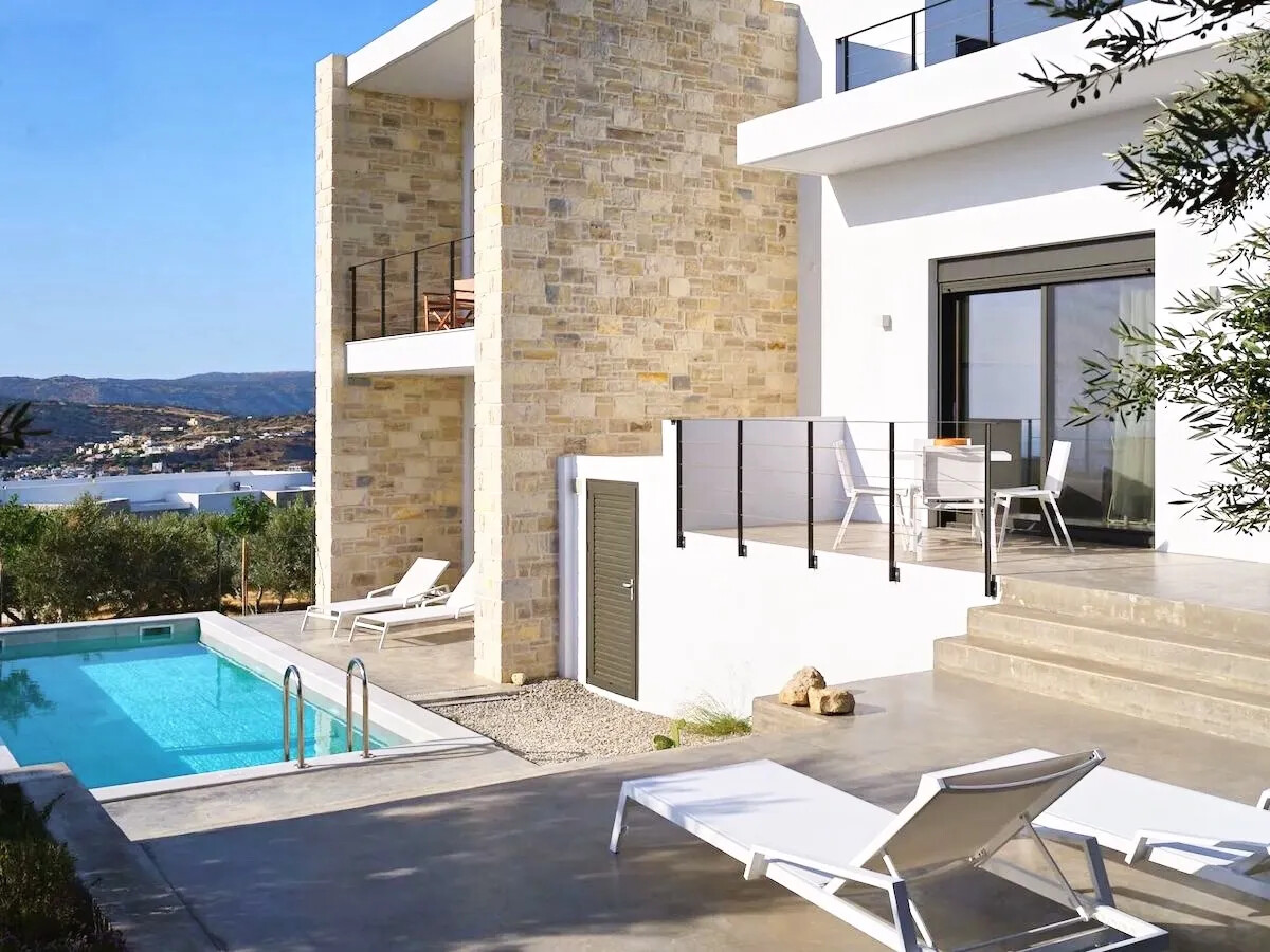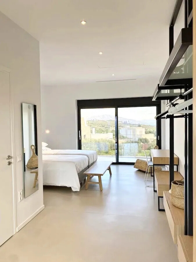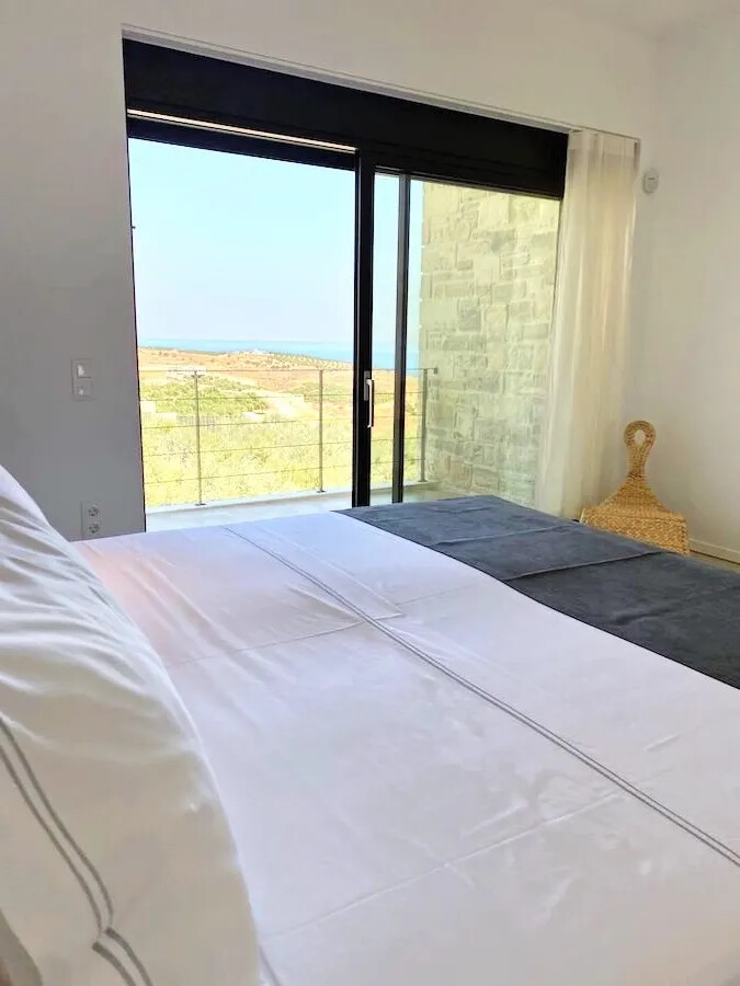 An exclusive new villa with modern, minimal design. Situated in a countryside surrounding in south Crete, out of Kamilari village. Built on a hill plot among olive groves, all rooms offer spectacular views of the sea and the surrounding areas.