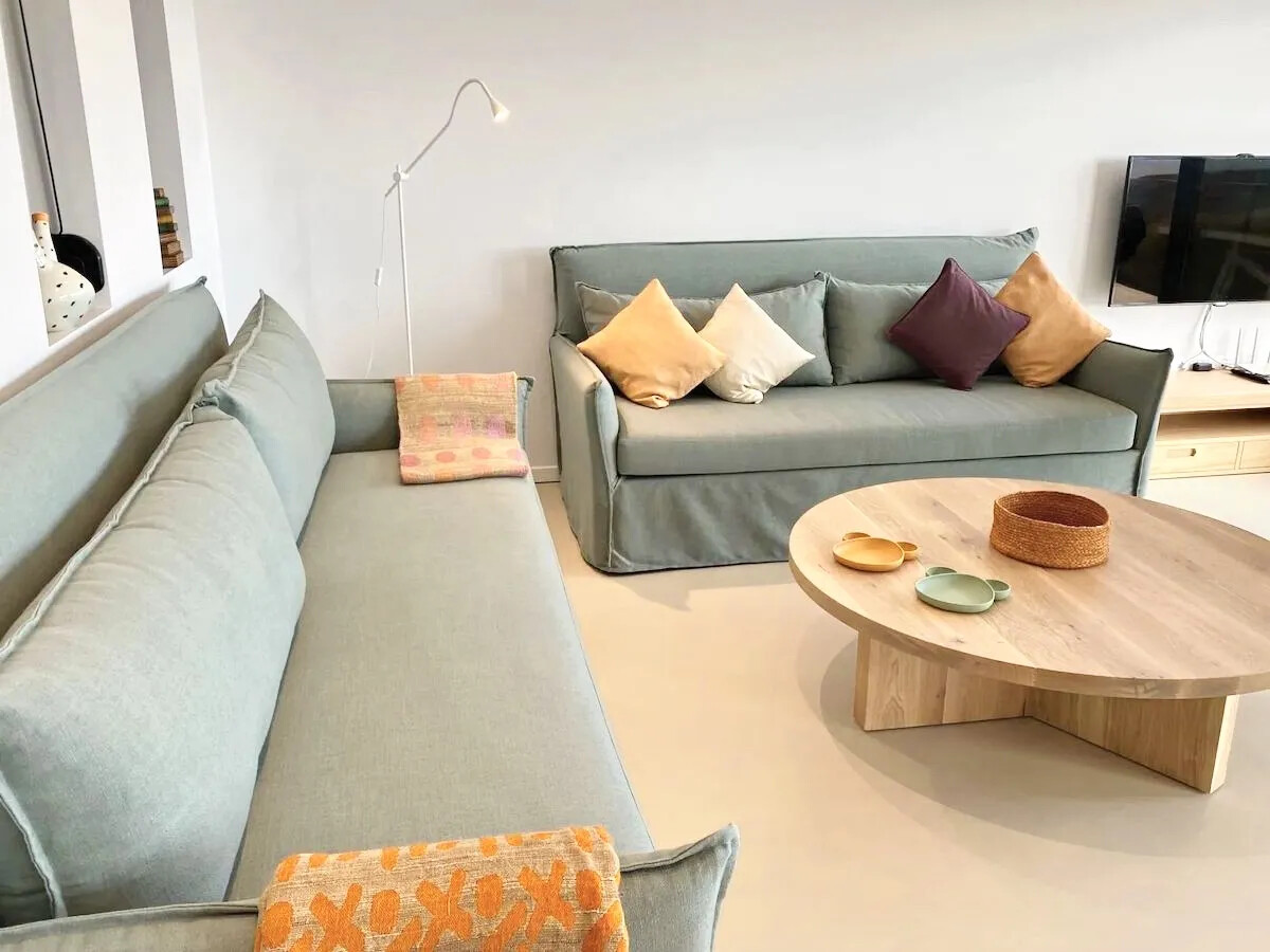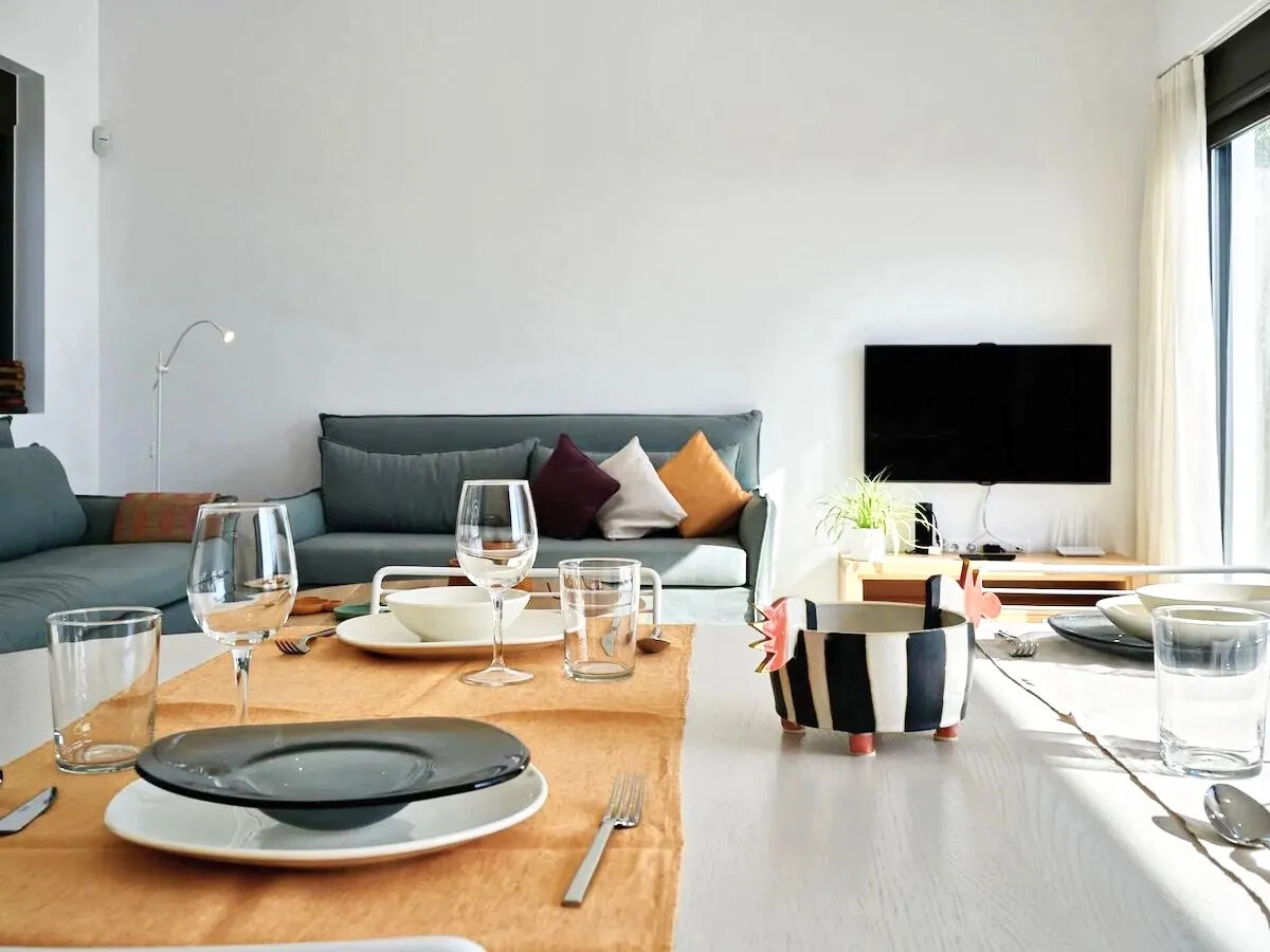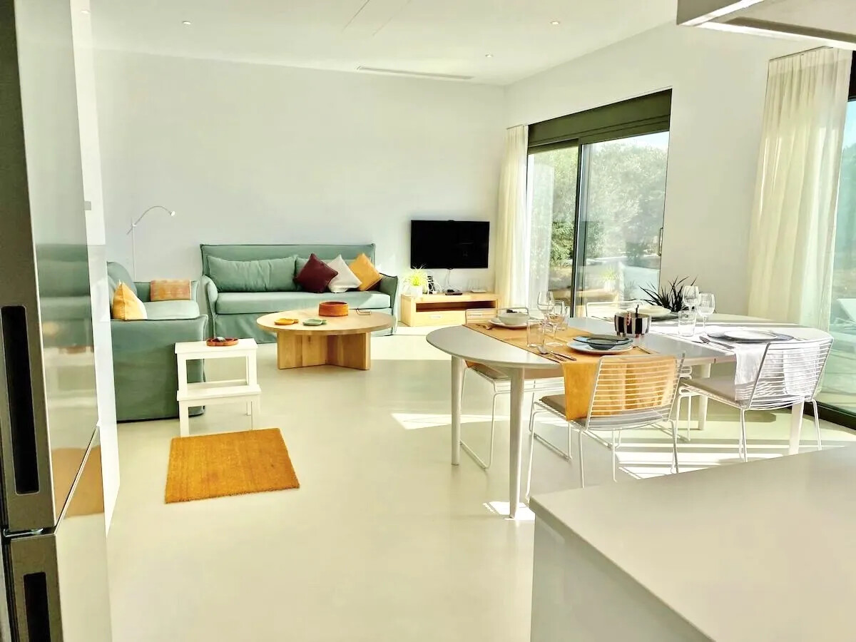 - Living Area: Spacious open-plan living room with a fully equipped Italian kitchen featuring Miele appliances, including a washing machine.