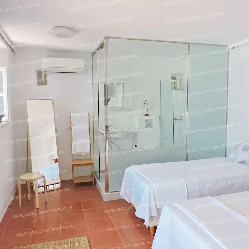 The villa comprises four elegantly designed bedrooms, each offering privacy and style. The two main suites, accessible via separate entrances, include a master suite with a double bed and a twin suite, both with en-suite bathrooms. The open-plan layout enhances the sense of spaciousness, and every room is designed to capture the striking views of the Aegean.