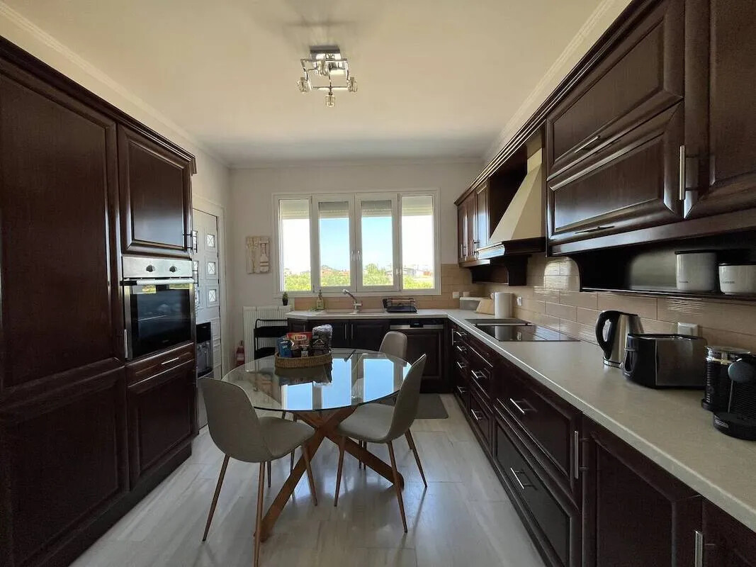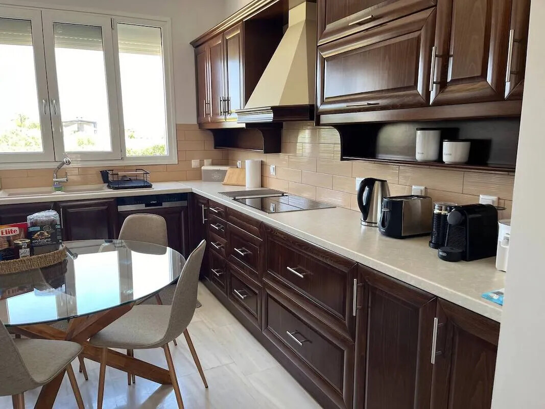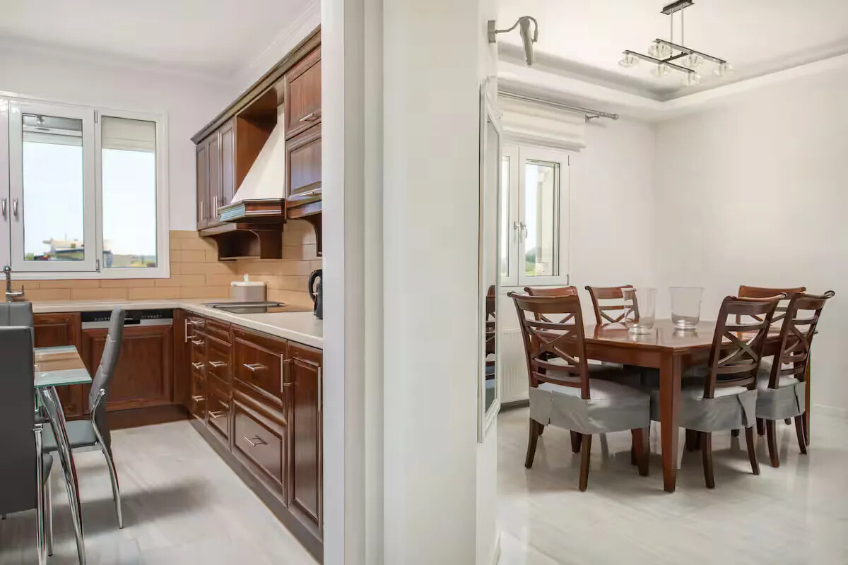 - Flooring: Pentelic white marble in the living room, dining area, and kitchen; Italian tiles in bedrooms and bathrooms