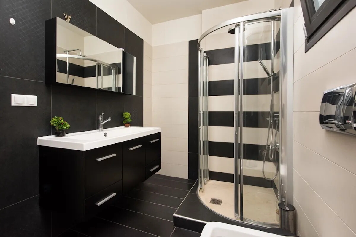 On the ground floor of the main house, there is a spacious living room, an open kitchen equipped with high-quality appliances, and two additional bedrooms. One bedroom features a queen-size bed, while the other has two single beds. A bathroom with a shower cabin serves these bedrooms. The guesthouse is a detached one-bedroom apartment with an en-suite bathroom, offering additional privacy for guests.