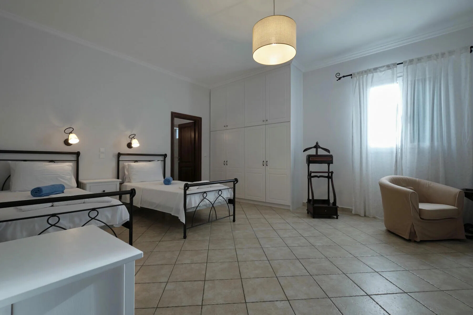 The villa’s exteriors are equally remarkable. Lush greenery, mature trees, and stone-paved terraces surround a large infinity pool with direct sea views. A separate children’s pool ensures safe family fun, while the built-in BBQ and alfresco dining area invite relaxed gatherings under the Ionian sun.