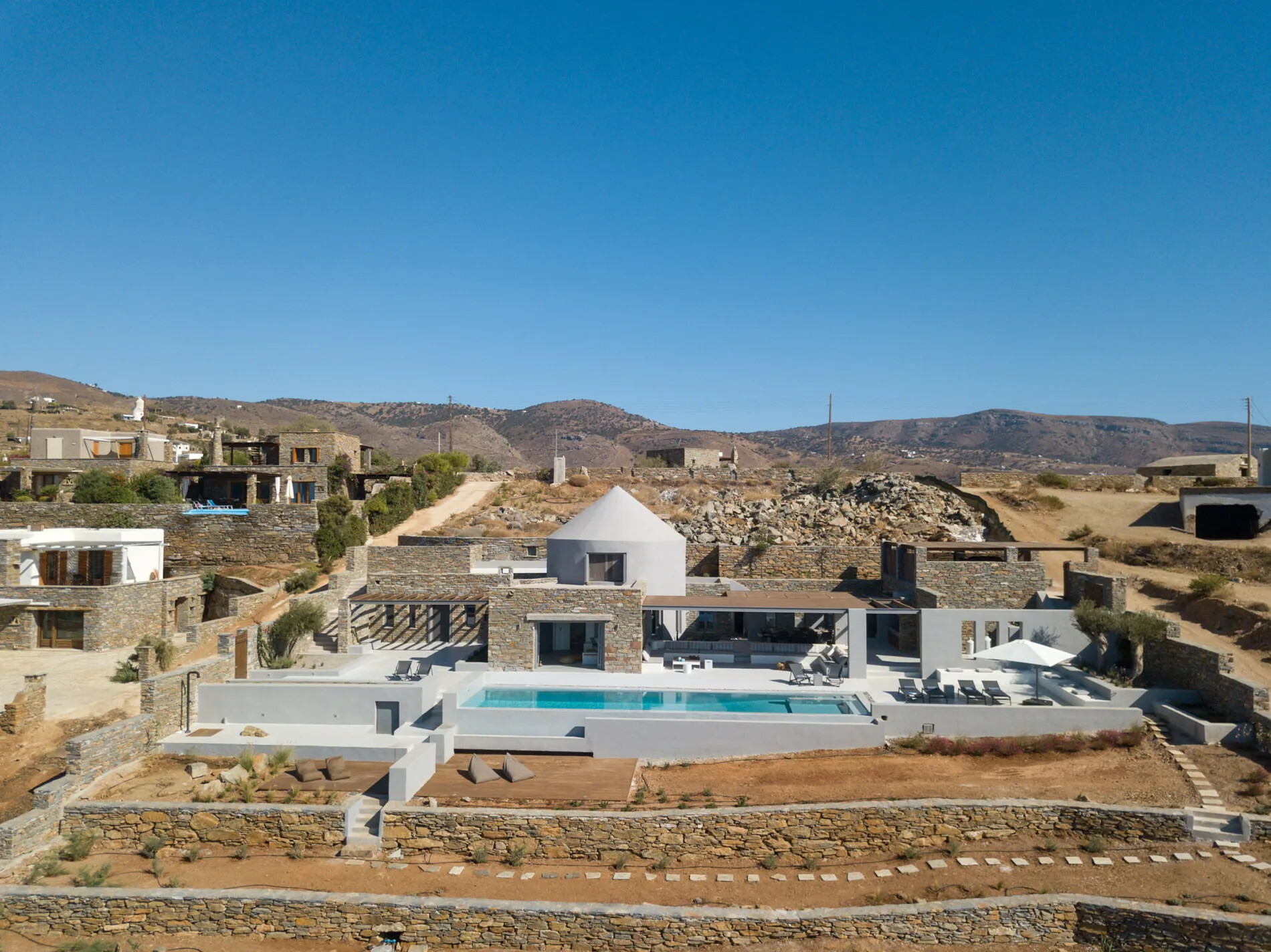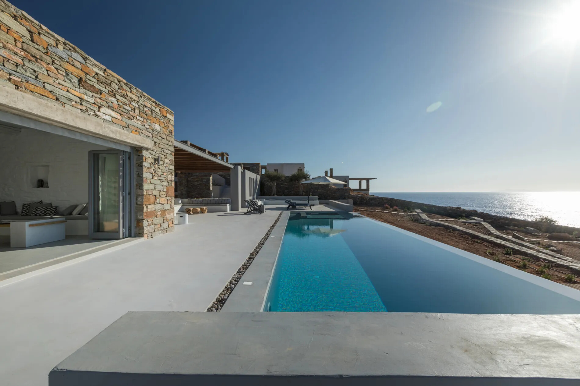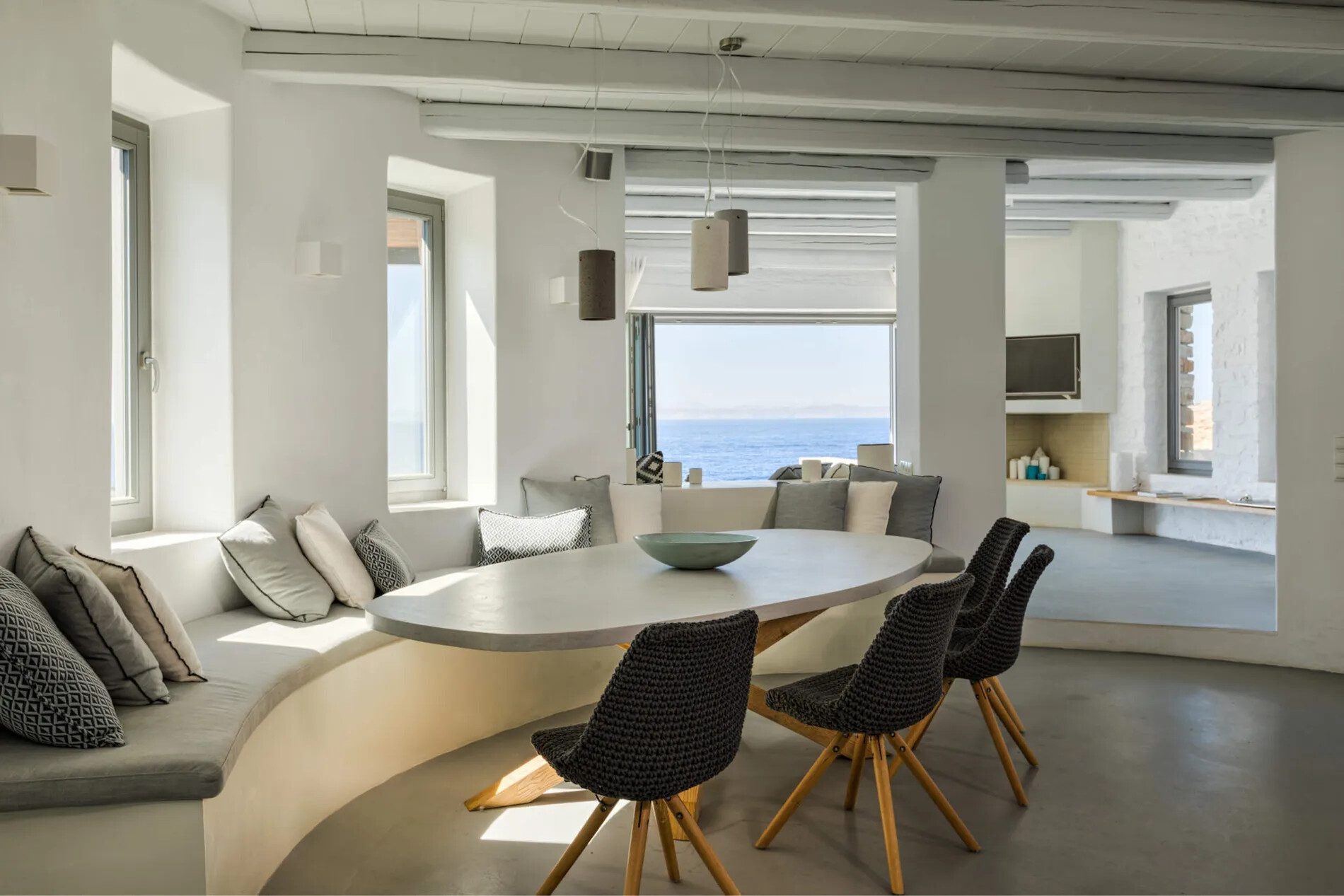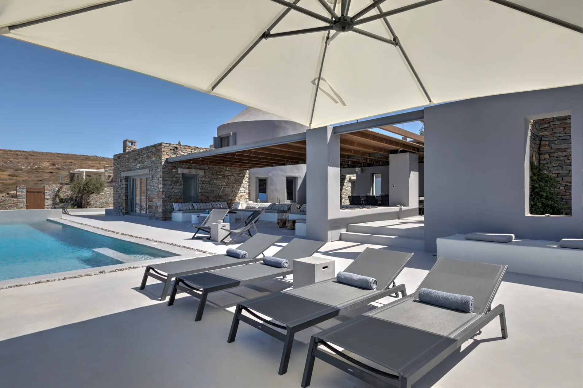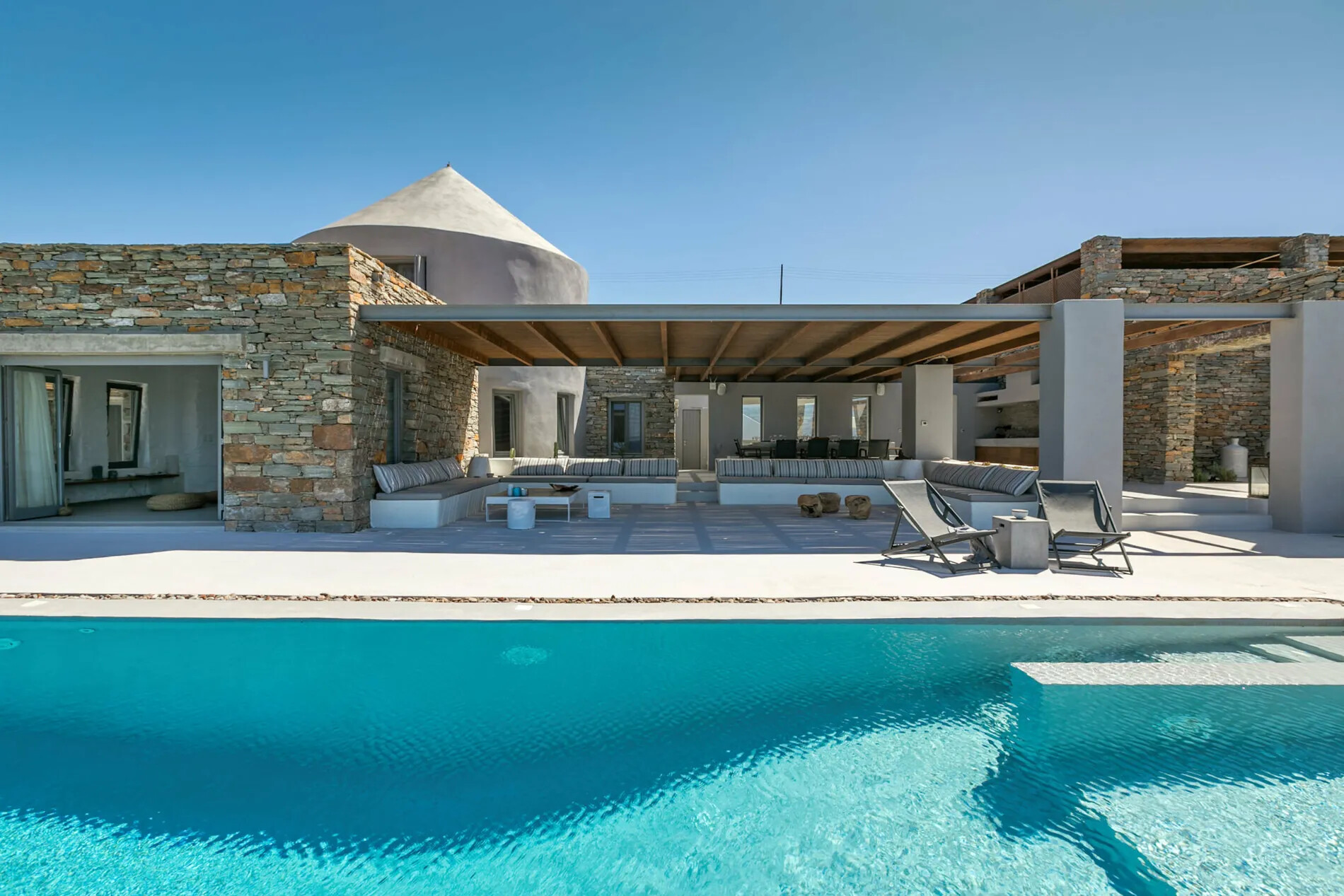 Spread across two floors and centered around a meticulously renovated windmill,  offers impeccably finished interiors and extensive shaded terraces. The main entrance leads to a well-equipped kitchen and a spacious dining area, while the living room provides panoramic sea vistas and seamless access to the terraces and infinity pool. The villa comprises three en-suite bedrooms, with the master suite opening onto a rooftop terrace offering unobstructed sea views.