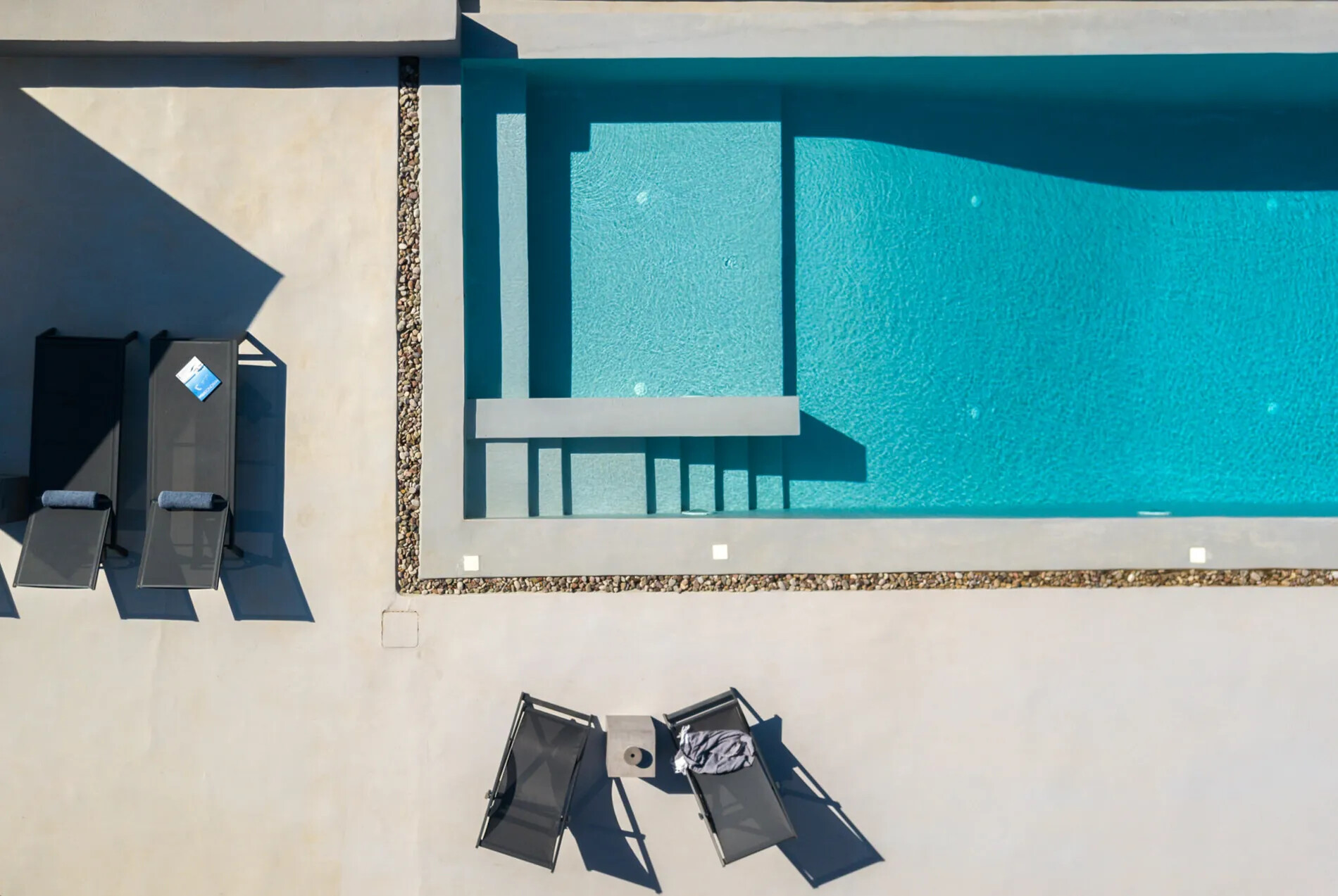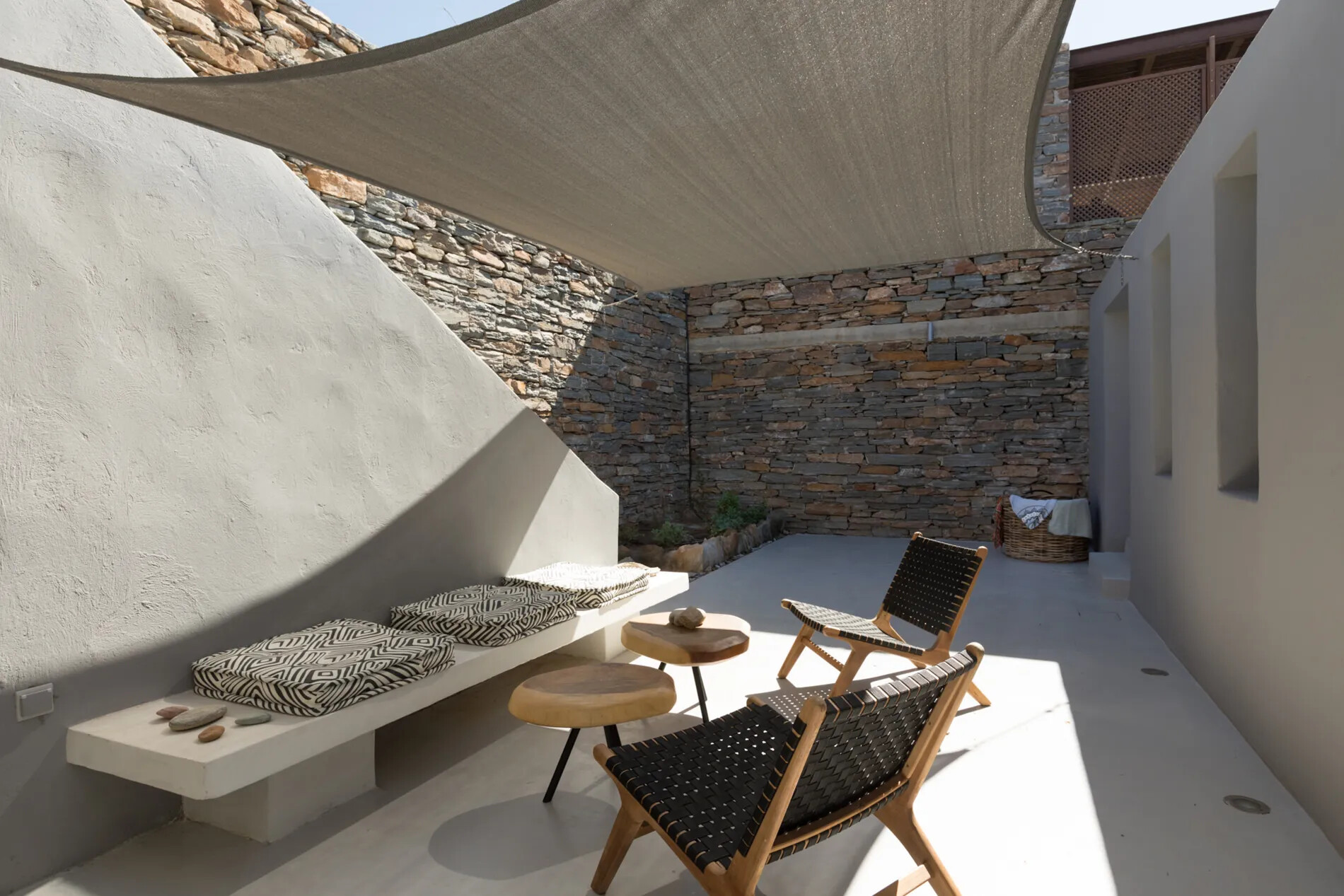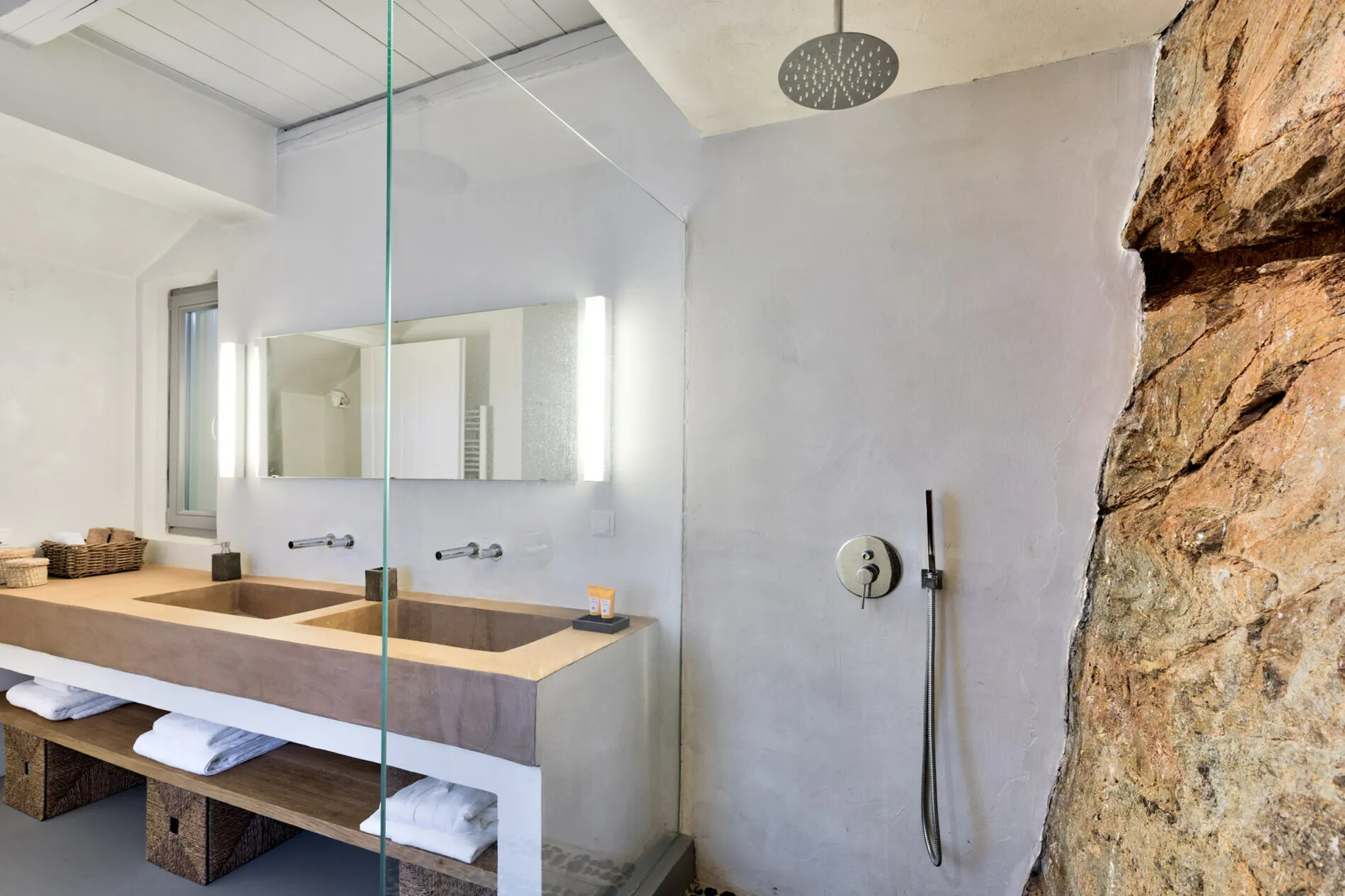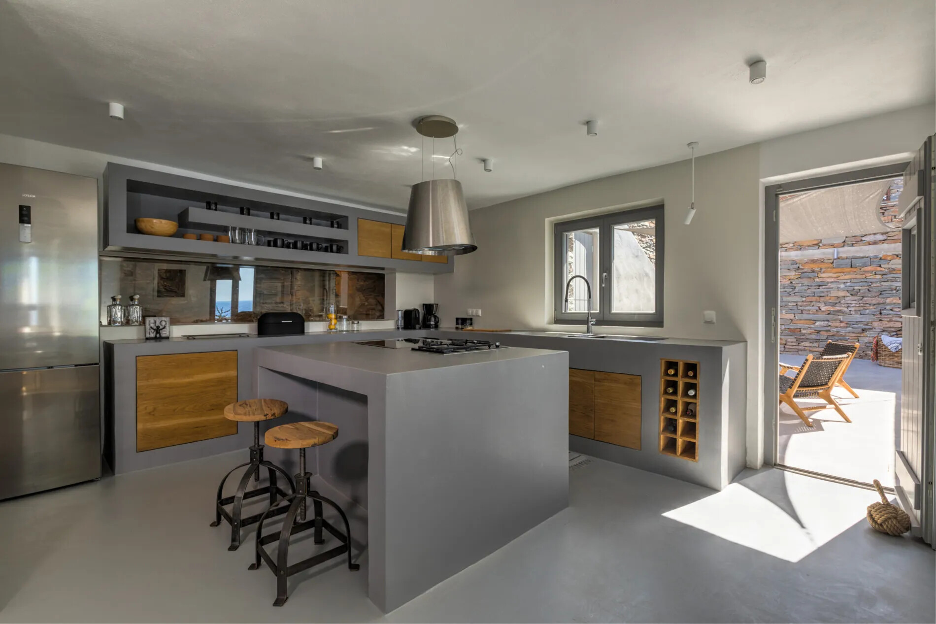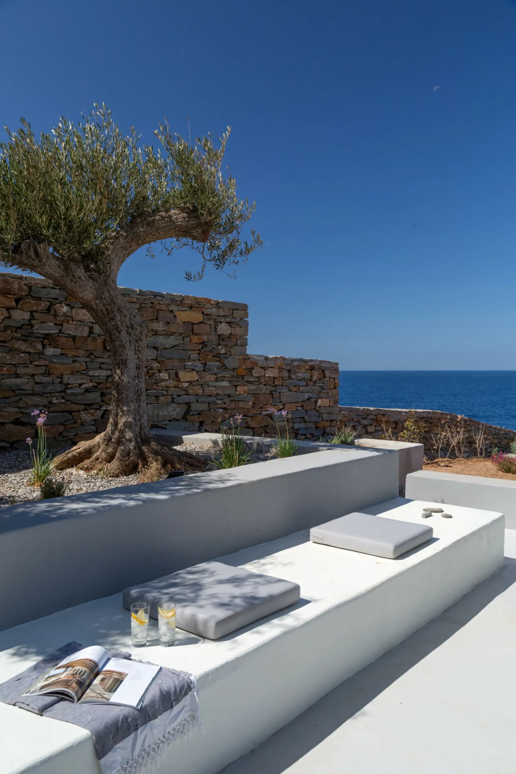 Spread across two floors and centered around a meticulously renovated windmill,  offers impeccably finished interiors and extensive shaded terraces. The main entrance leads to a well-equipped kitchen and a spacious dining area, while the living room provides panoramic sea vistas and seamless access to the terraces and infinity pool. The villa comprises three en-suite bedrooms, with the master suite opening onto a rooftop terrace offering unobstructed sea views.