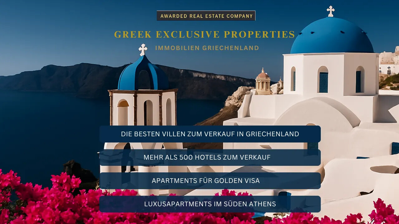 GREEK EXCLUSIVE PROPERTIES, ist das führende Immobilienunternehmen in Griechenland mit einem umfangreichen Portfolio von zum Verkauf stehenden Häusern in Griechenland. Hier finden Sie die besten Immobilien in Griechenland. Luxuriöse griechische Immobilien und Häuser in Griechenland mit atemberaubendem Meerblick.