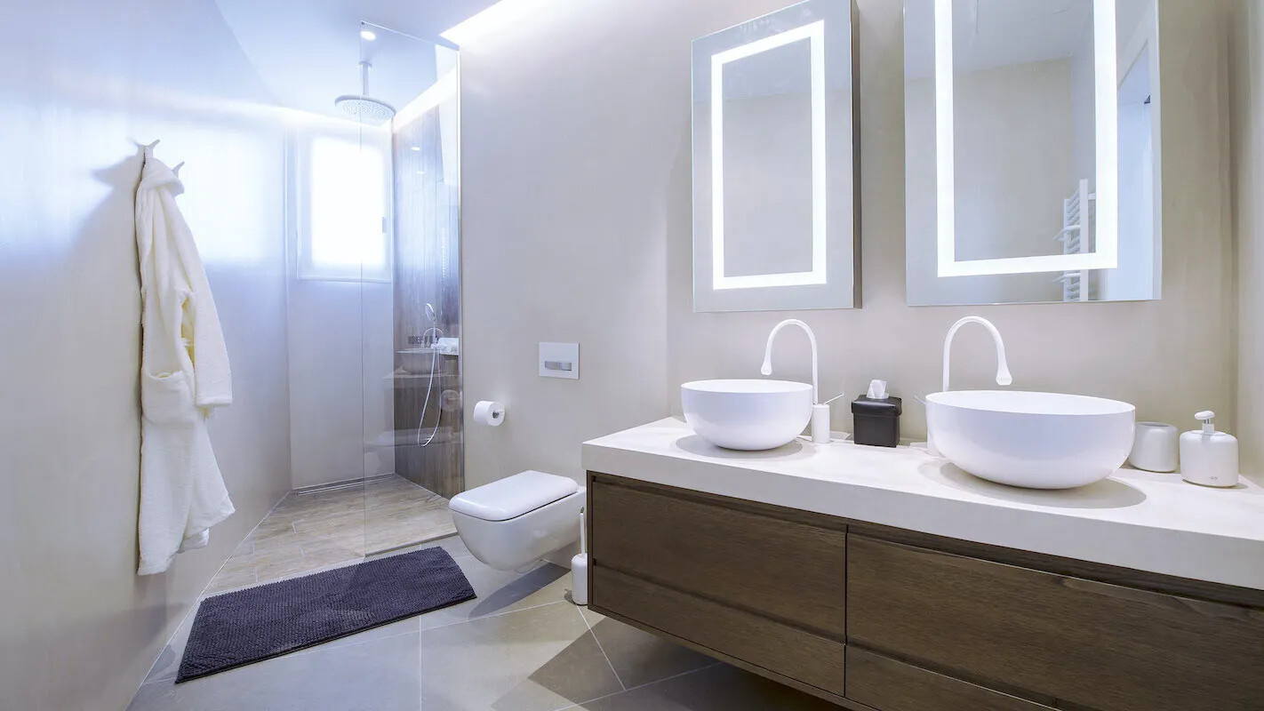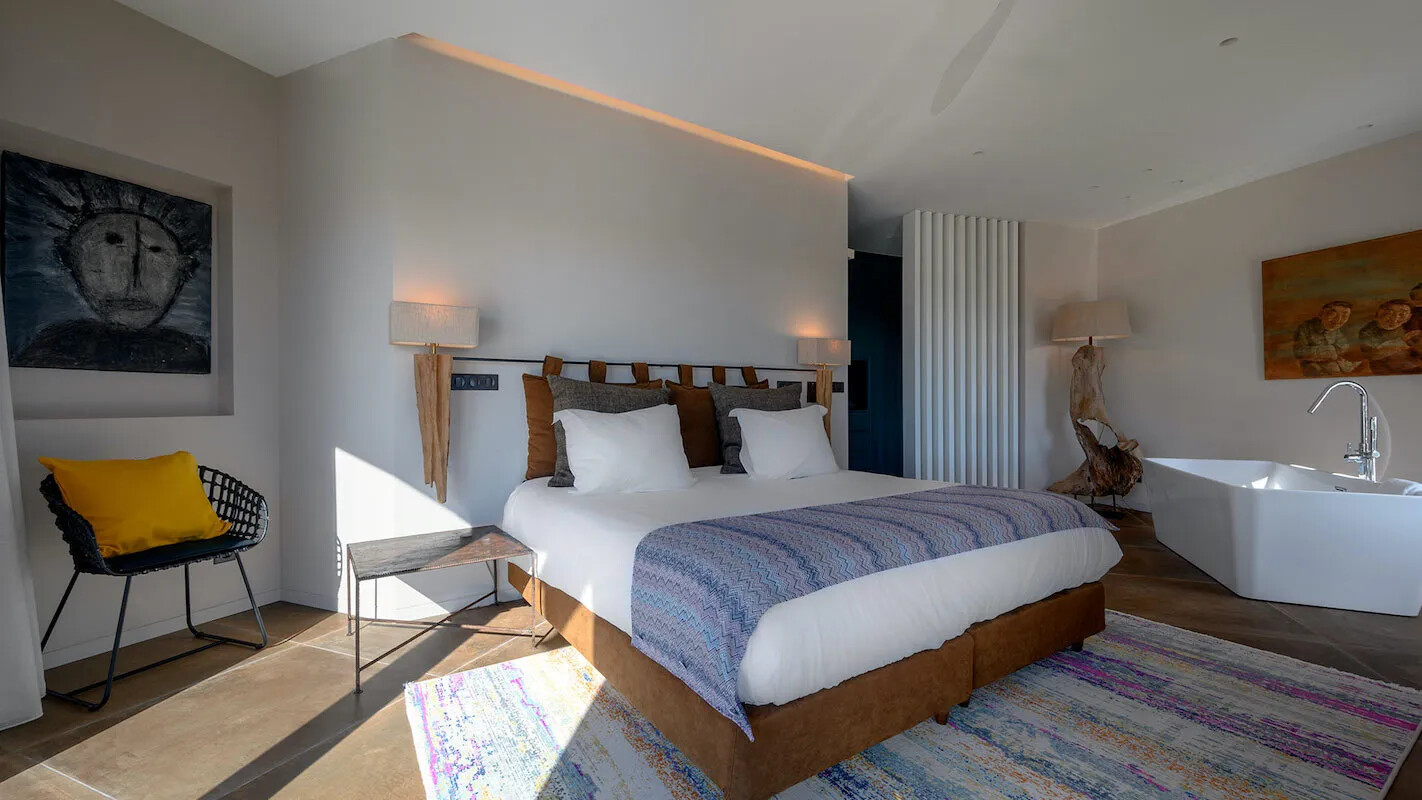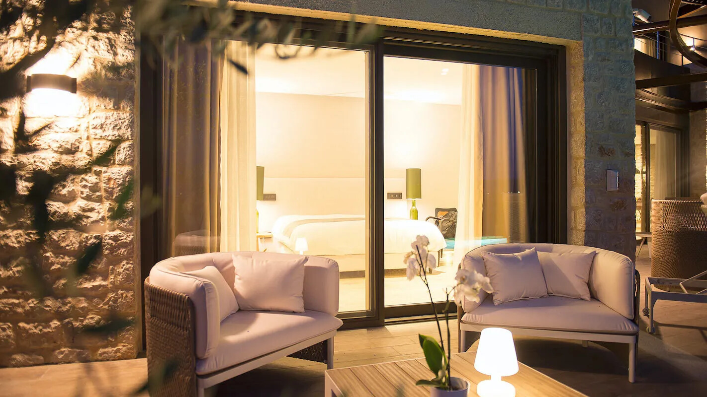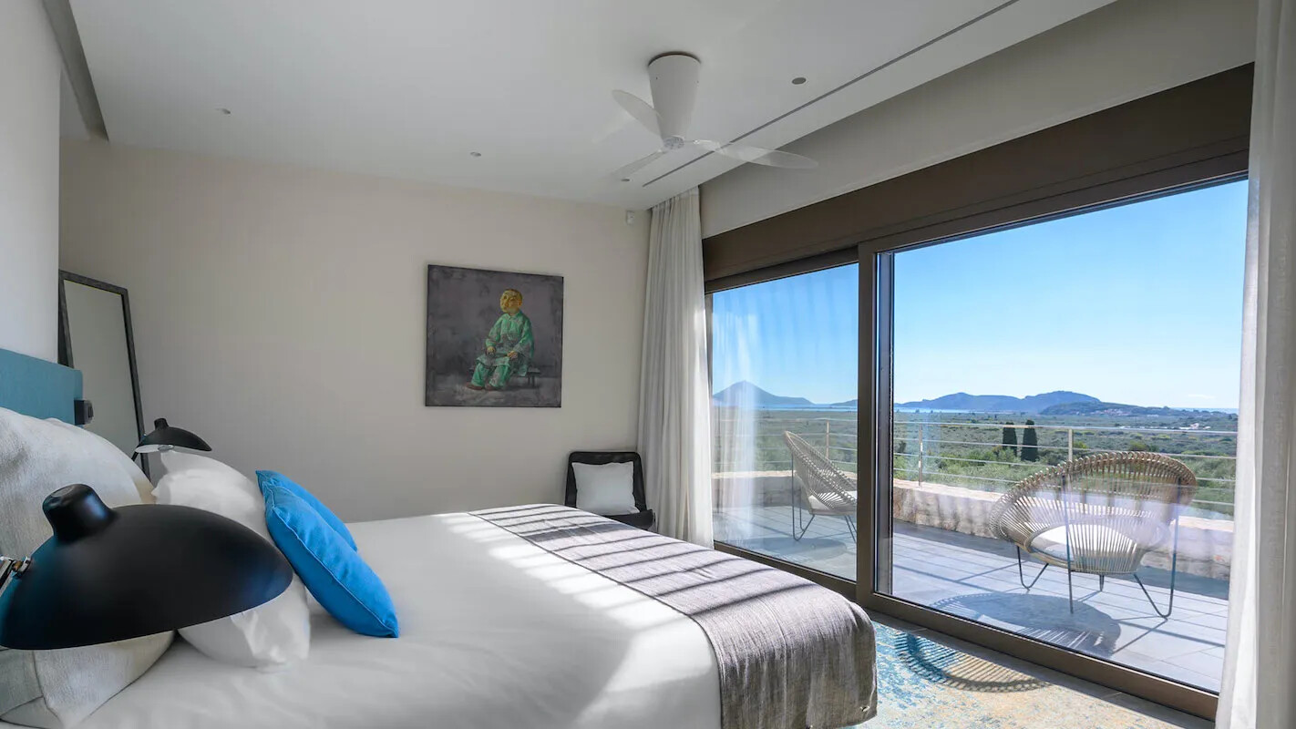 The ground floor features two bedrooms, each with a king-size bed convertible to singles, en-suite bathrooms, and private terraces with direct access to the infinity pool overlooking the sea. One of these bedrooms is wheelchair-friendly, offering accessibility without compromising on luxury.
