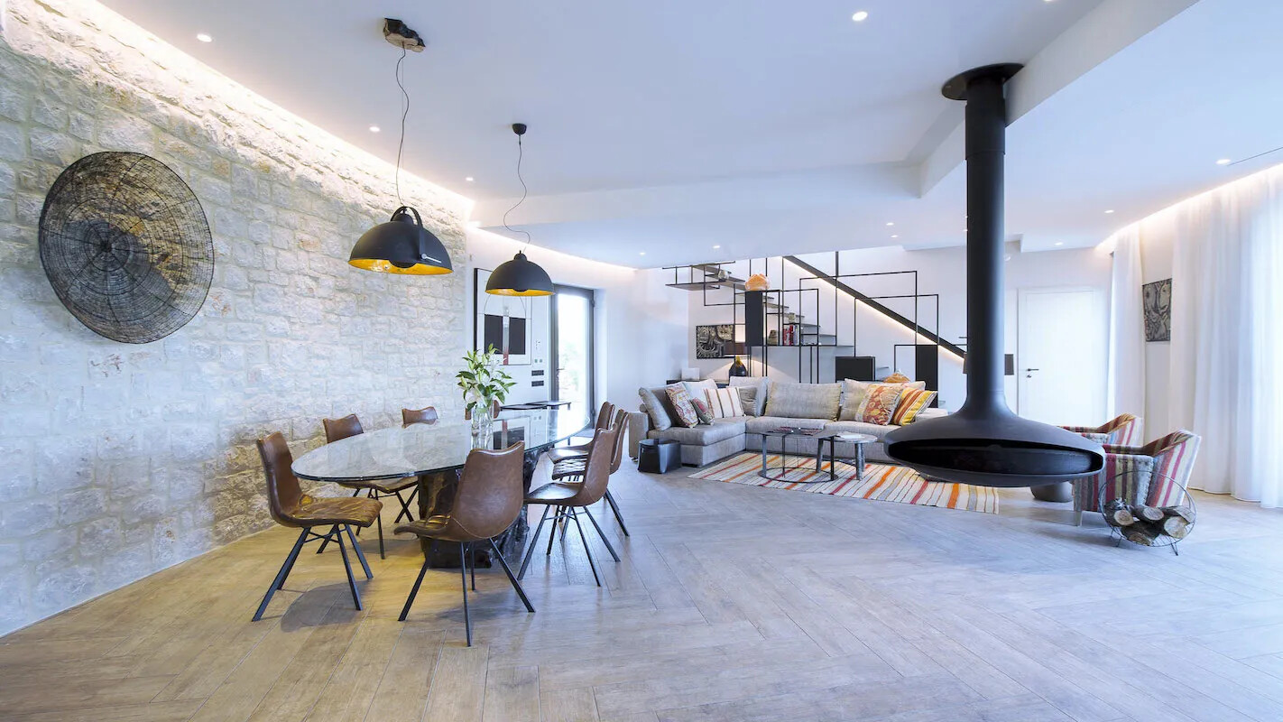 Indoors, the villa offers a comfortable living and dining area with an XL TV screen and a self-turning central fireplace, creating an inviting space for relaxation. The professional kitchen, equipped with a food elevator to the first floor, ensures convenience for culinary enthusiasts.