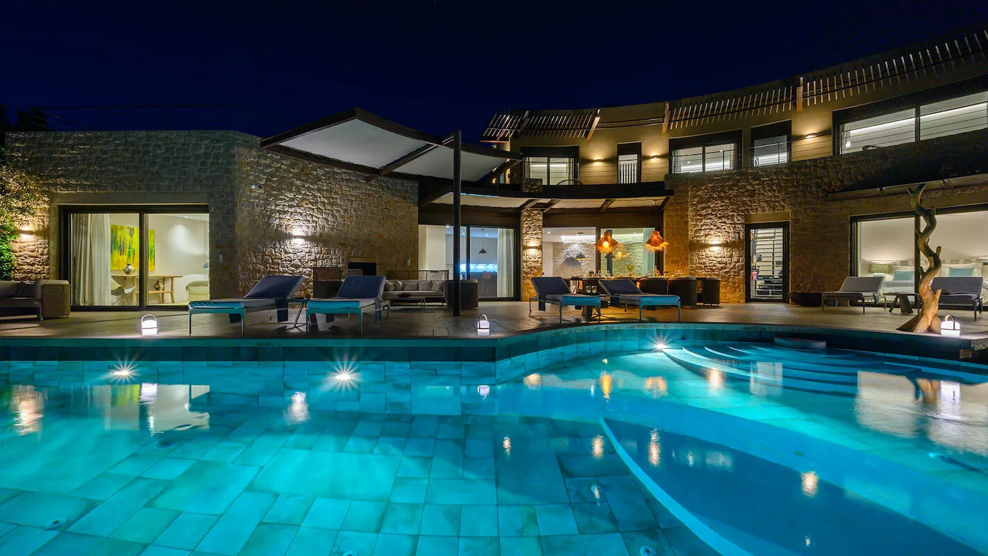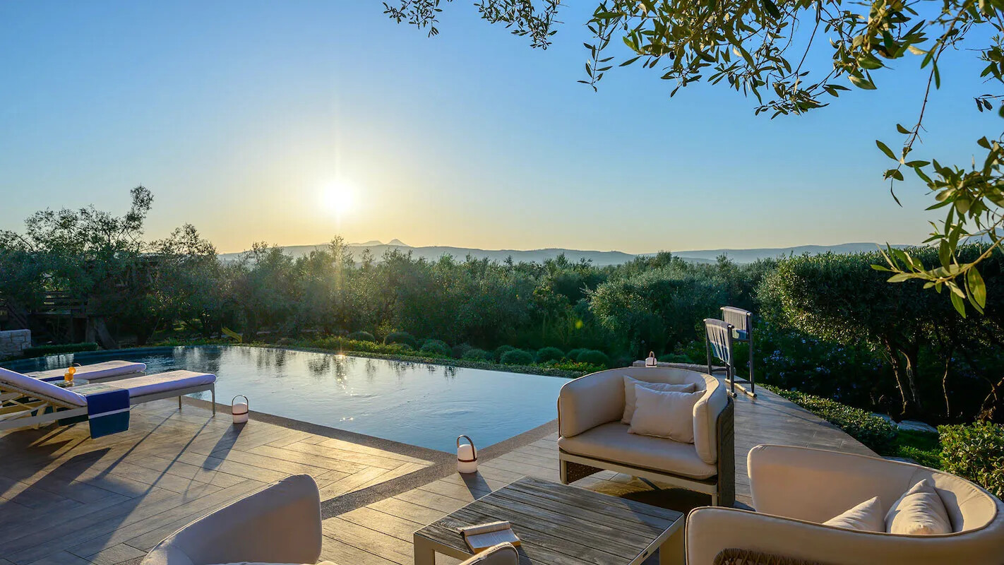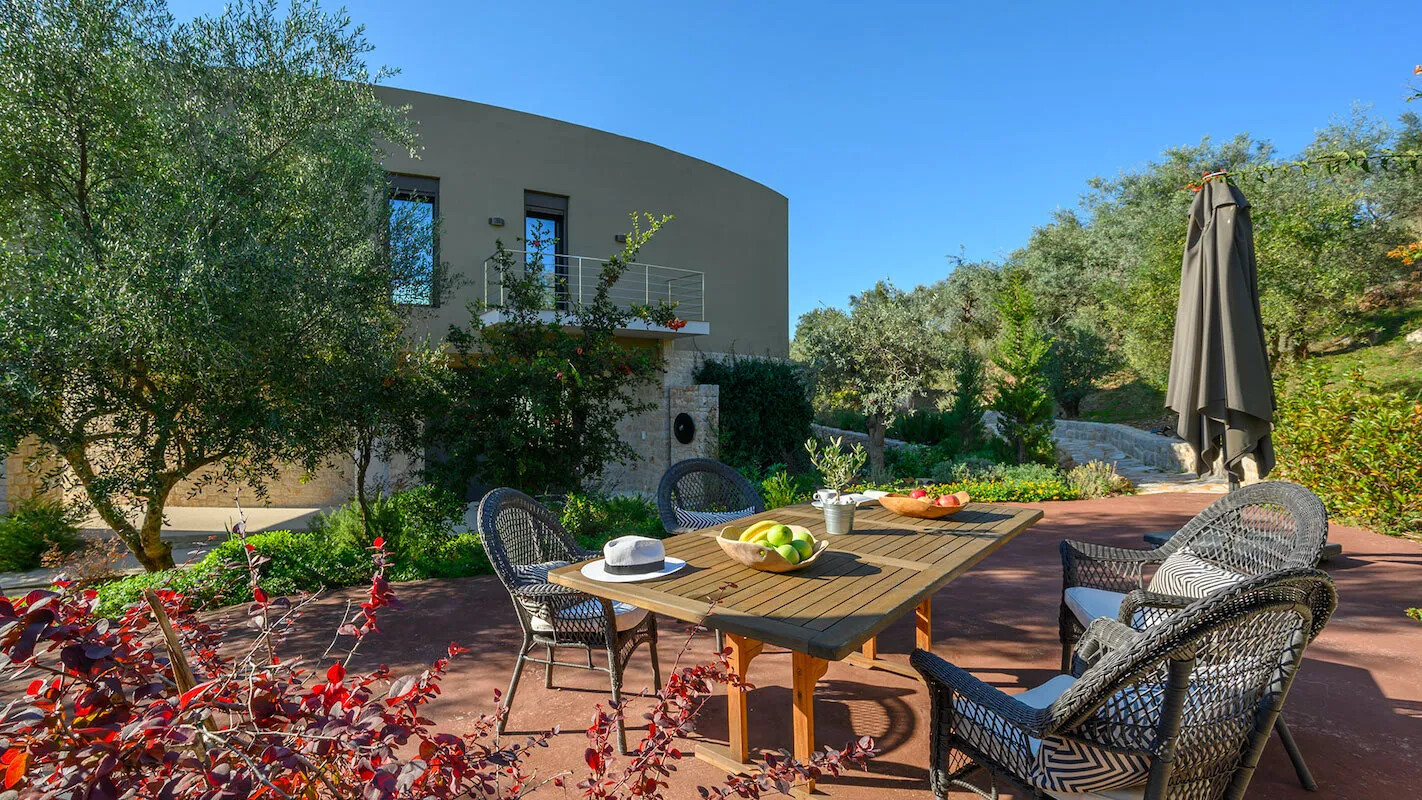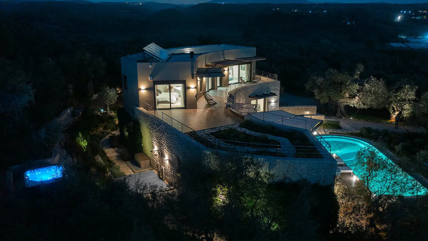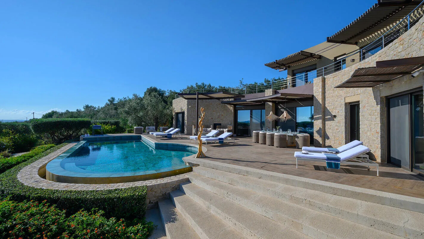 As you approach along the winding road flanked by ancient olive trees, the villa emerges as a hidden gem, its elegant façade blending seamlessly with the surrounding landscape. Designed in a moon-shaped configuration, the villa maximizes its vantage point to showcase the stunning vistas while preserving the integrity of the original olive grove, home to over 230 Koroneiki and Mavroulies olive trees.