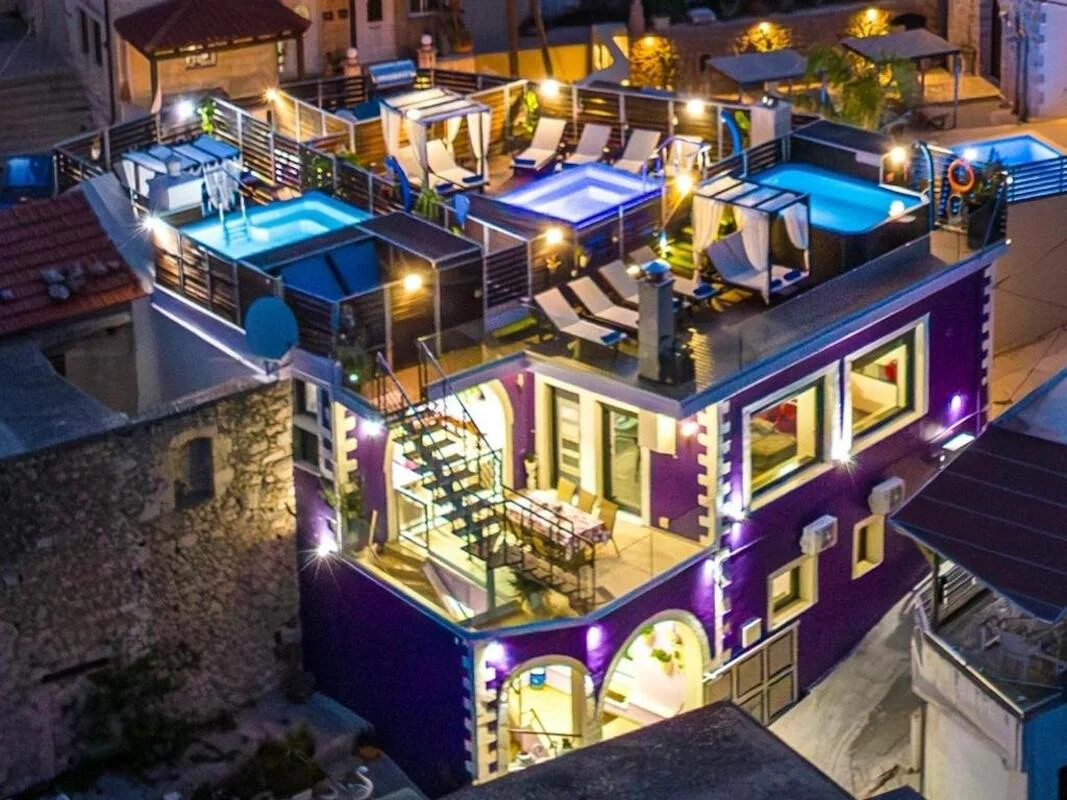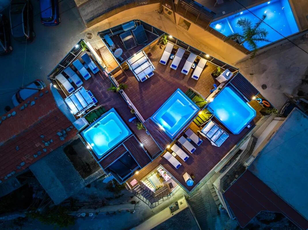 An internal staircase leads to the upper level, revealing an open-plan living area with a fireplace, air-conditioning, and a fully equipped kitchen. An external staircase leads to a 9-square-meter swimming pool, a serene oasis for moments of inner peace.