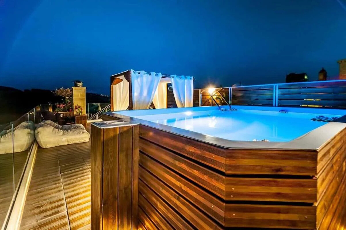 An internal staircase leads to the upper floor, revealing an open-plan living area adorned with a cozy fireplace and a fully furnished, well-equipped kitchen. An external staircase provides access to a 9-square-meter swimming pool, perfect for moments of absolute relaxation.