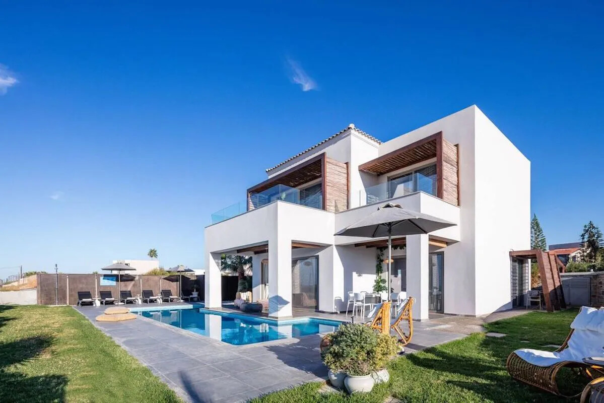• Features: Breathtaking Aegean Sea views, outdoor hot tub, private balconies, modern amenities, privacy fencing