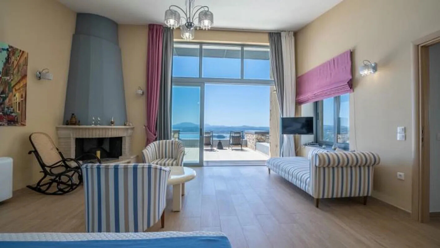 The Amazing Villa in Corfu, Barbati offers 5 bedrooms and 5 bathrooms, each with stunning vistas and elegant furnishings. The master bedroom features a fireplace and opens to a private sun deck, while the lower level includes a gym and staff room with en-suite facilities.