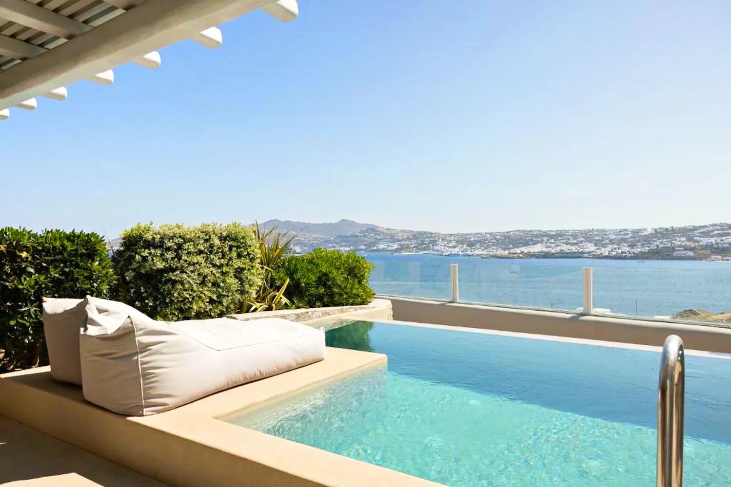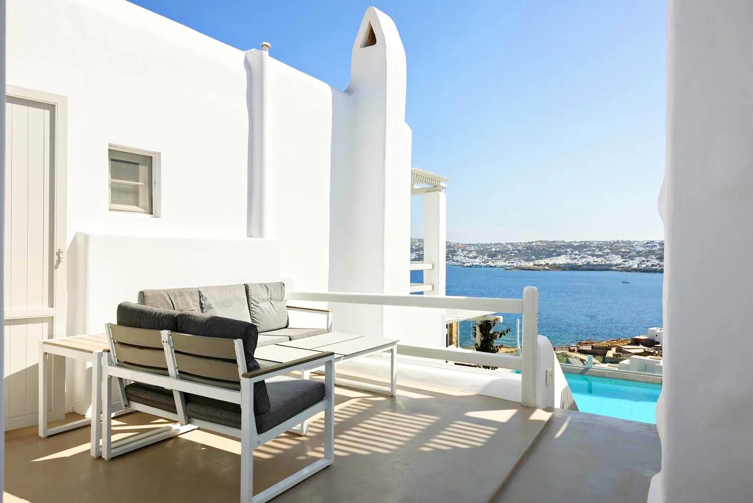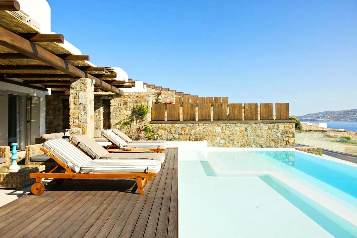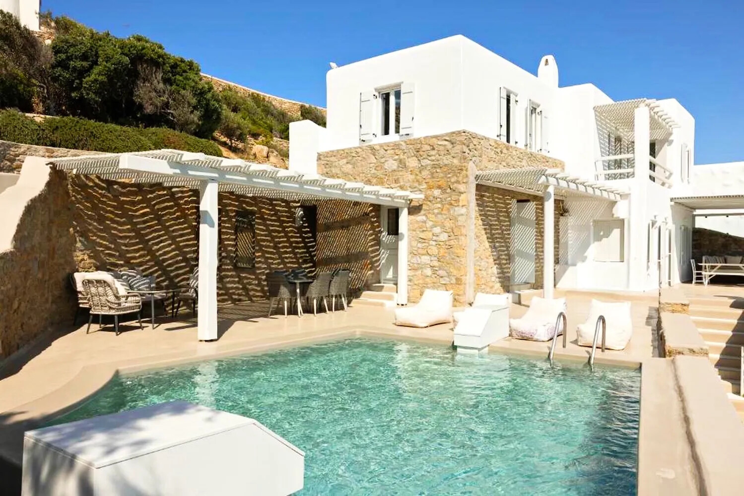 House for Sale with Sea Views in Mykonos with Private Jacuzzi & Panoramic is a unique opportunity to acquire a luxurious estate comprising two distinct residences: a four-bedroom maisonette and a two-bedroom apartment, each with private pools and breathtaking panoramic views of the Aegean Sea. This villa offers four luxuriously appointed bedrooms, each designed for maximum comfort. All rooms feature double beds and en-suite bathrooms with modern finishes, combining practicality and refined style. The ground floor includes a spacious living room, dining area, and a fully equipped kitchen. Large glass doors lead to the outdoor terrace, creating a seamless indoor-outdoor living experience. Ideal for guests or independent living, this apartment provides a cozy yet elegant atmosphere. With stunning sea views, this space is a sanctuary for both relaxation and entertainment. One of the most striking features of the House for Sale with Sea Views in Mykonos with Private Jacuzzi & Panoramic is the expansive veranda equipped with a Jacuzzi. It provides the perfect vantage point for enjoying the dramatic sea views and Mykonos sunsets. Each residence boasts its own private swimming pool, offering tranquil and secluded outdoor spaces. A shared pool is also available within the small complex, shared only with two other houses. Located in the prestigious Kanalia area, this House for Sale with Sea Views in Mykonos with Private Jacuzzi & Panoramic combines peaceful seclusion with proximity to Mykonos Town, Ornos Beach, and the island’s vibrant nightlife. This dual-residence property presents a significant investment opportunity in the Mykonos real estate market. It is ideal as a luxurious private residence or as a high-income rental property. House for Sale with Sea Views in Mykonos with Private Jacuzzi & Panoramic is more than a home; it is an experience. Contact us today to discover more about this exceptional offering. House for Sale with Sea Views in Mykonos with Private Jacuzzi & Panoramic
