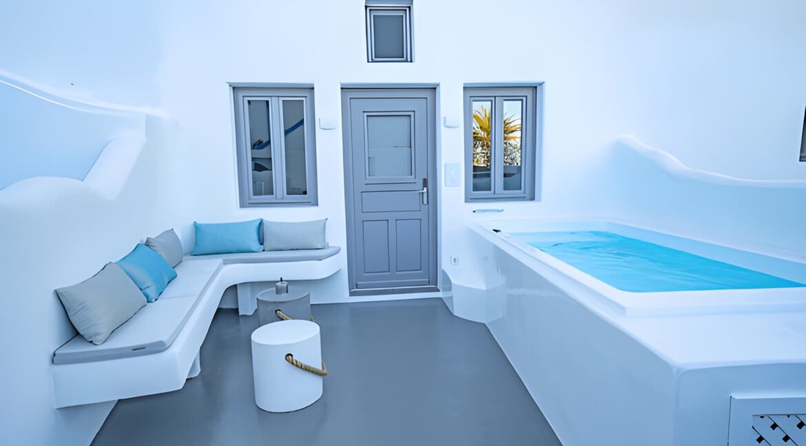 This elegant complex consists of stylishly designed boutique suites, each conceived as a private retreat that blends modern comfort with Santorini’s traditional architectural character.