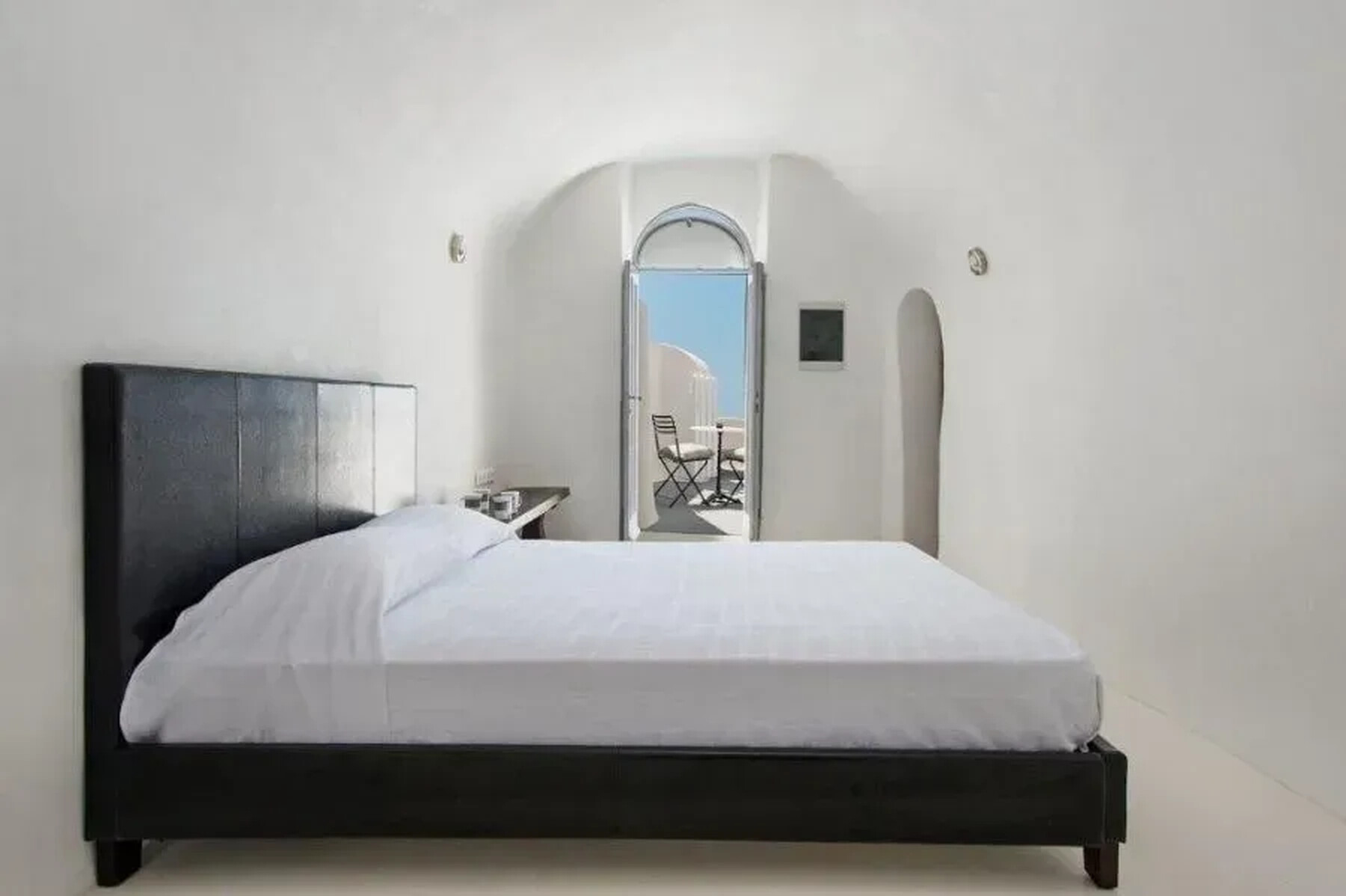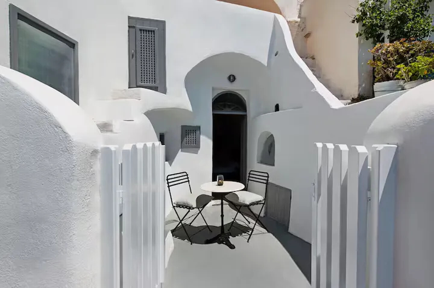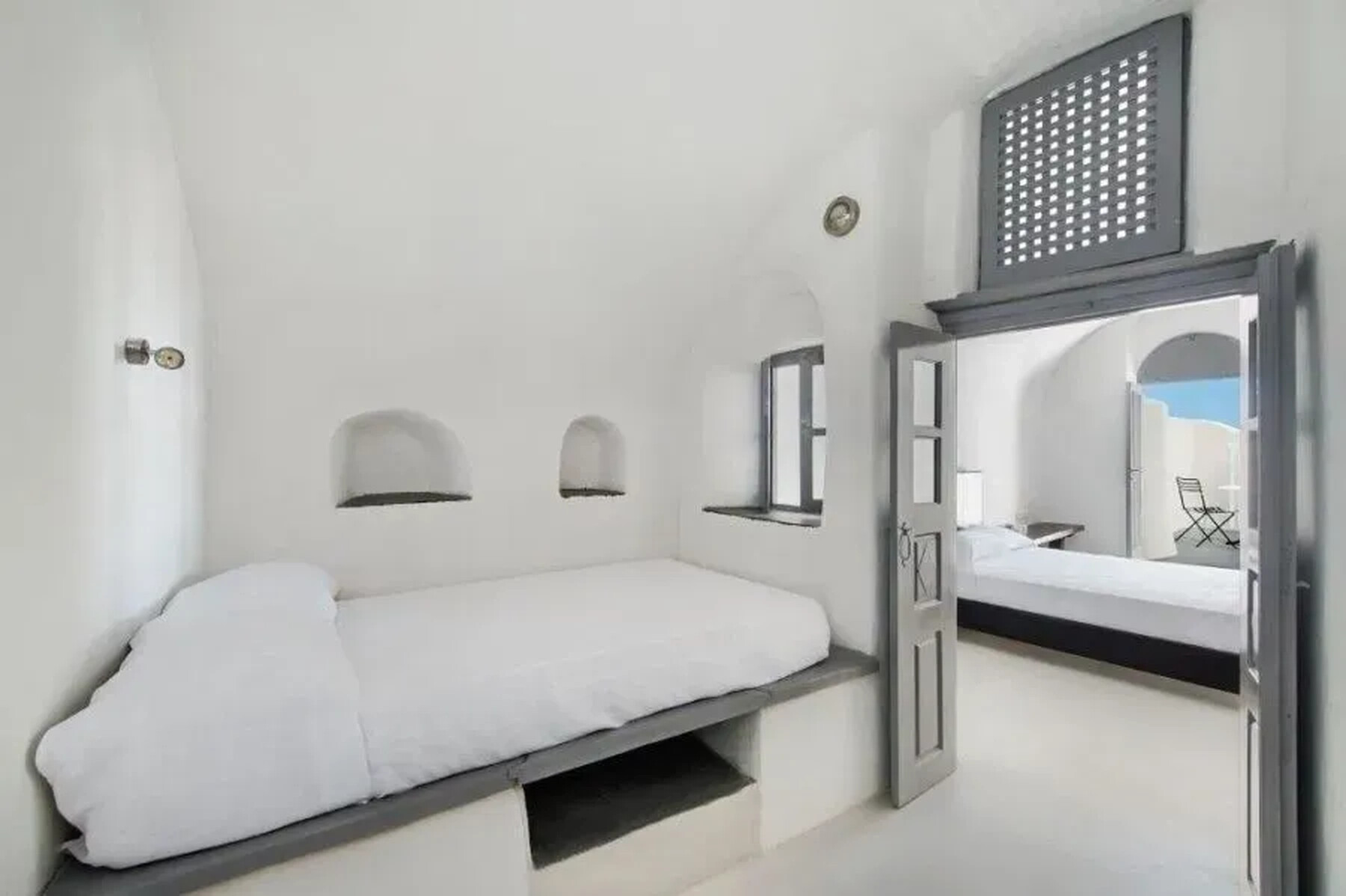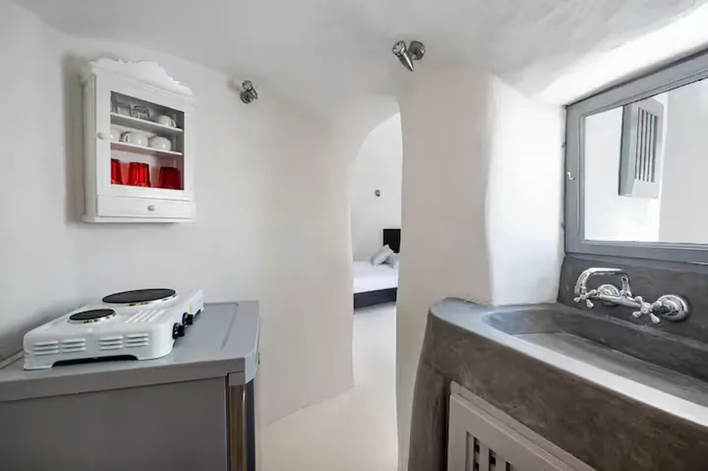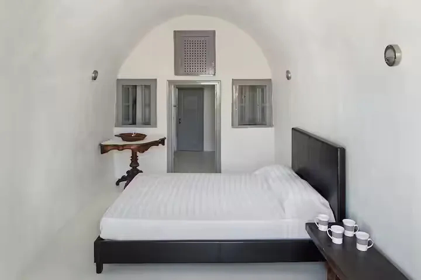This authentic cave house is a true representation of Cycladic architecture, built directly into the volcanic cliffside and painted in serene tones of grey and white to reflect the island’s traditional aesthetic.