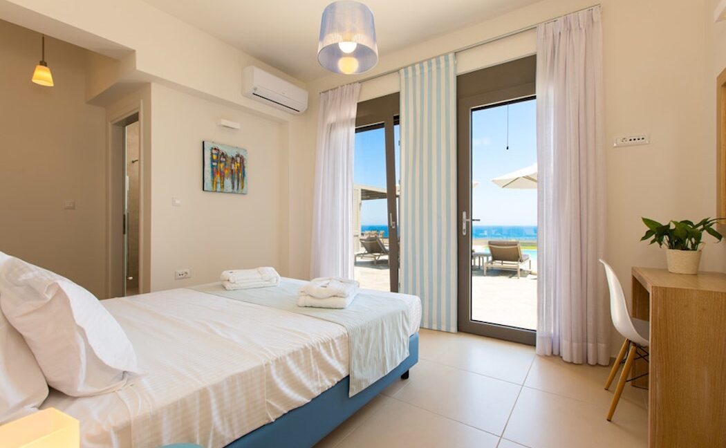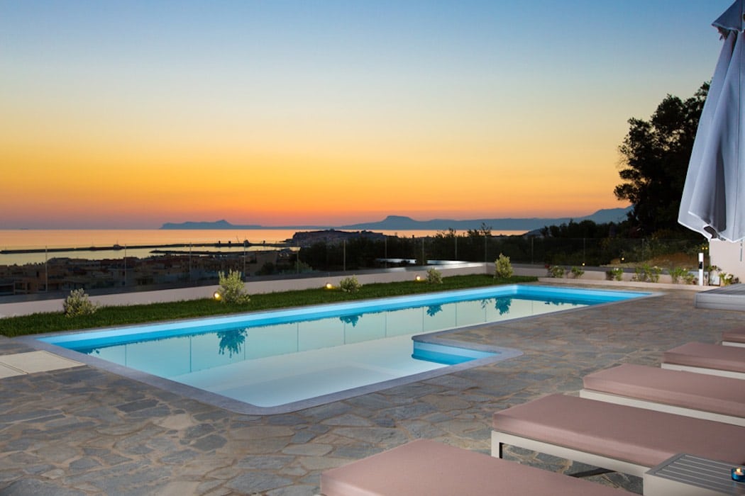 It is located in a private land surrounded by olive trees and on the outskirts of Rethymno city offering the best location and sea view that you can find if you are searching for a villa close to the town and the beach! Relax and enjoy the sea and sunset views from any angle of the pool area and balconies. Totally isolated but close to everything as Rethymno city centre and the beach is only 1 km away, the villa offers full privacy