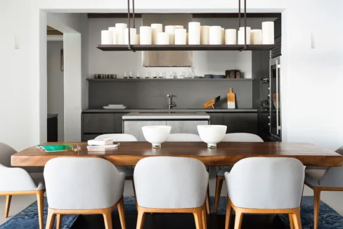 Inside, you’ll find six sumptuously appointed en suite bedrooms, each featuring steam showers and oversized bathtubs. The living and dining areas are spacious, offering panoramic views of the Aegean Sea, and the chef’s kitchen is fully equipped with top-tier amenities. A fitness center awaits those who seek an invigorating workout, and throughout the villa, you’ll discover elegant handmade furnishings.