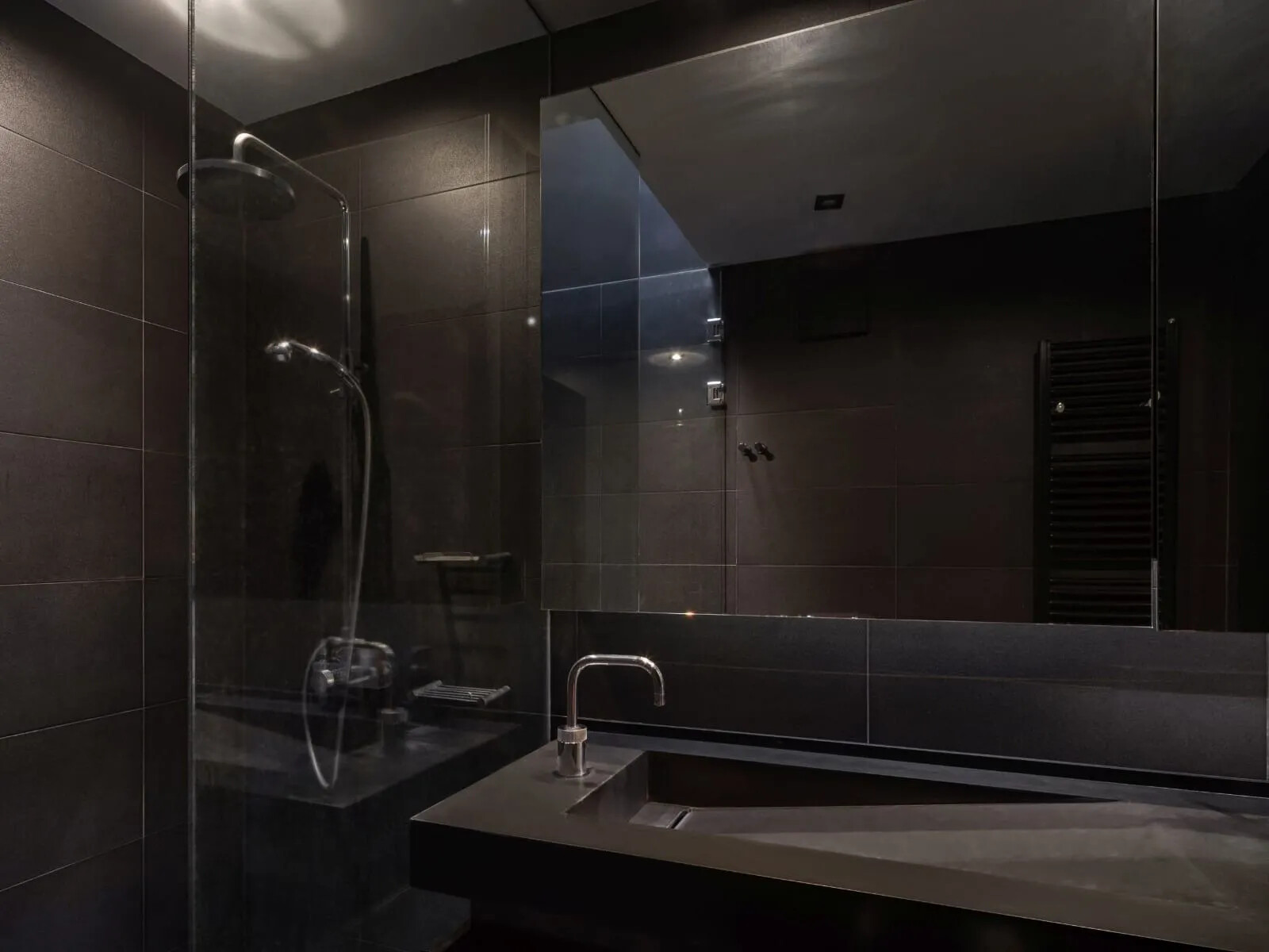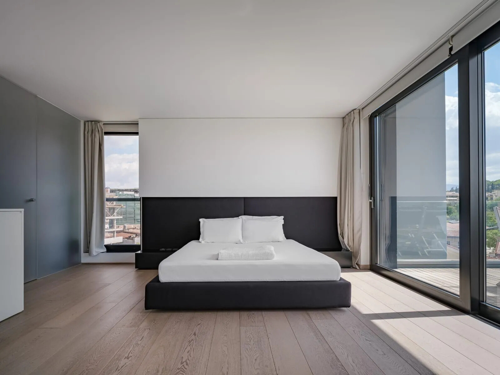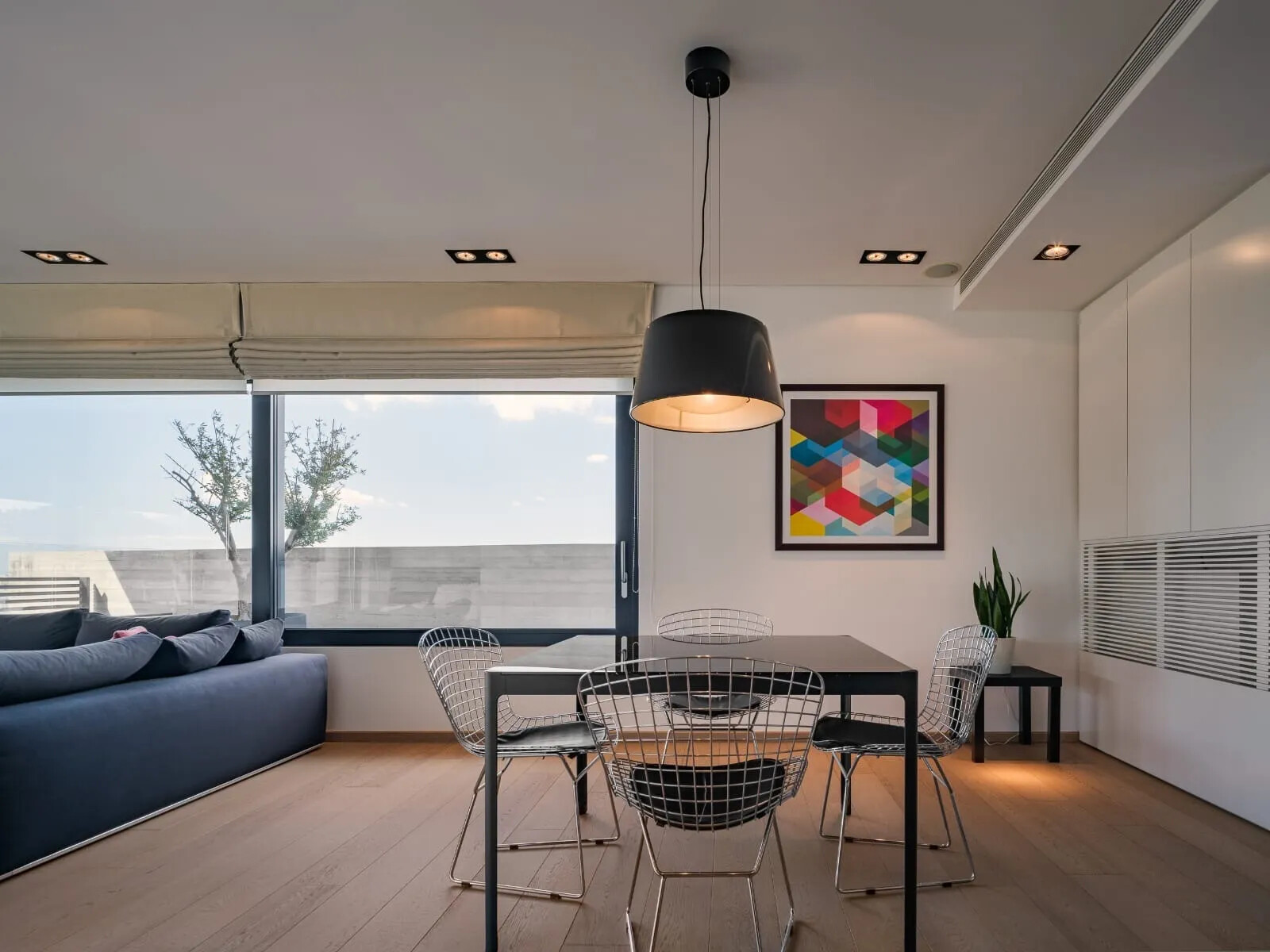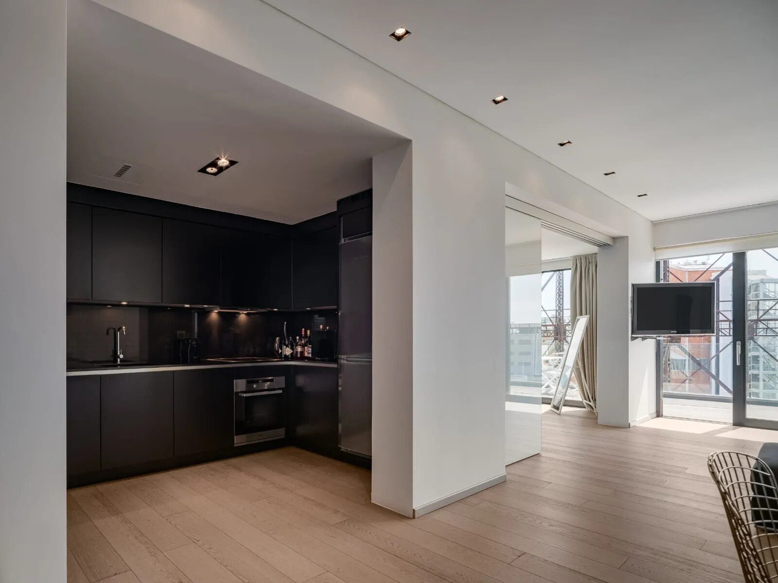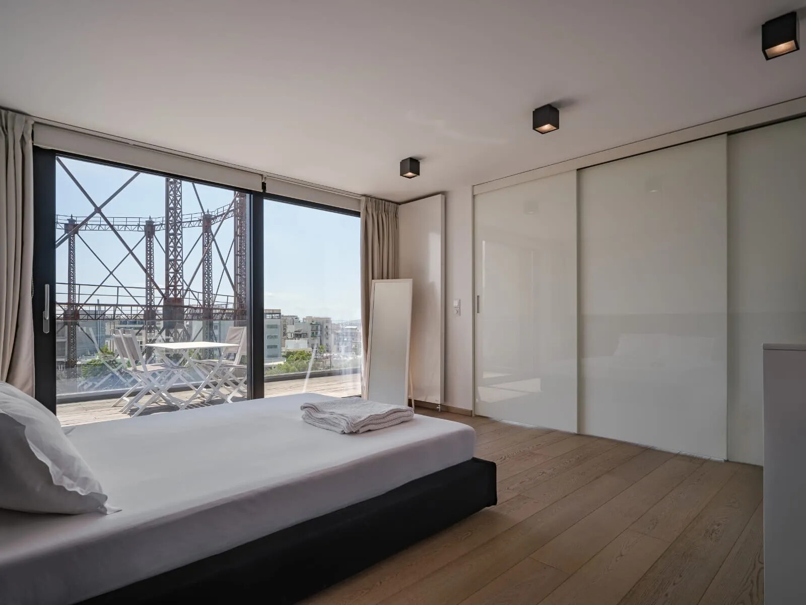 Also available in the same vicinity is a stunning 180 sqm loft-penthouse located on the 3rd and 4th floors. This unit features minimal architecture with high-quality materials that highlight the elegance and luxury of the property. It includes a spacious living room with an open-plan kitchen, one master en-suite bedroom, and one additional bedroom with a separate bathroom.