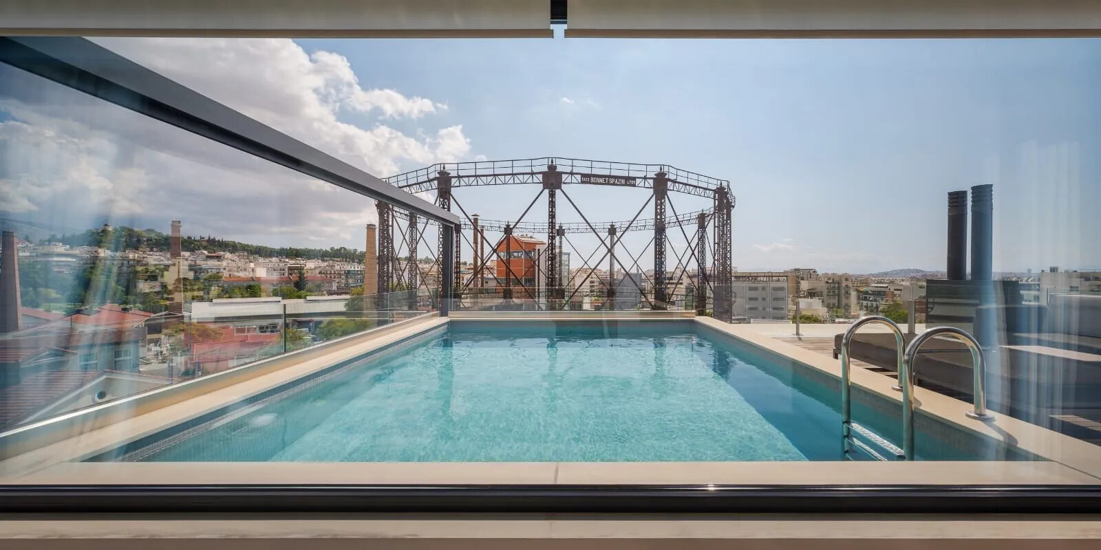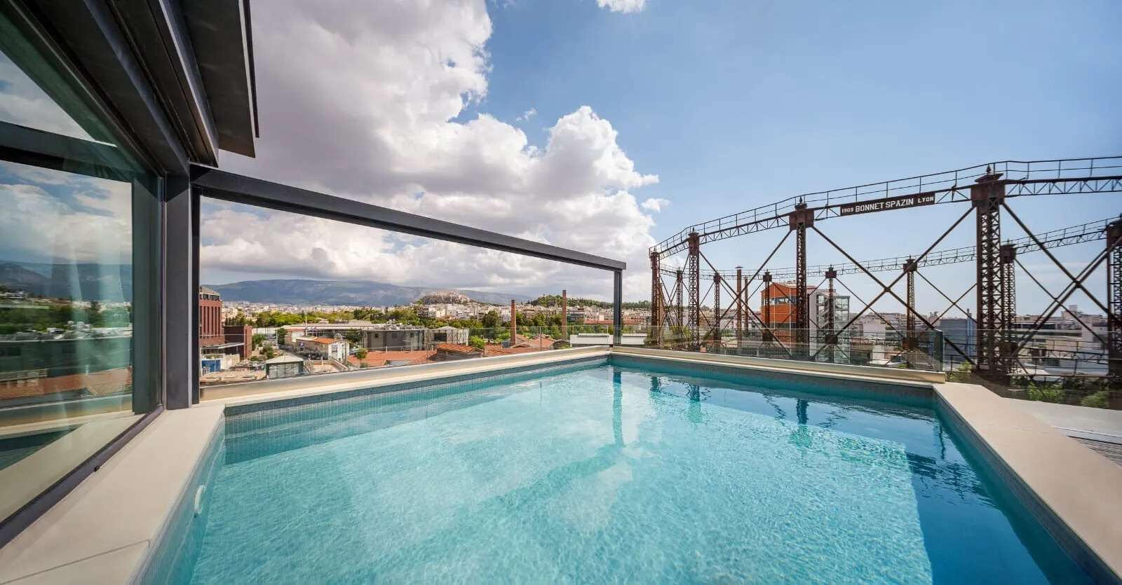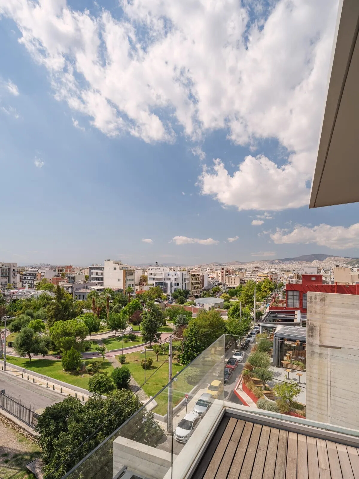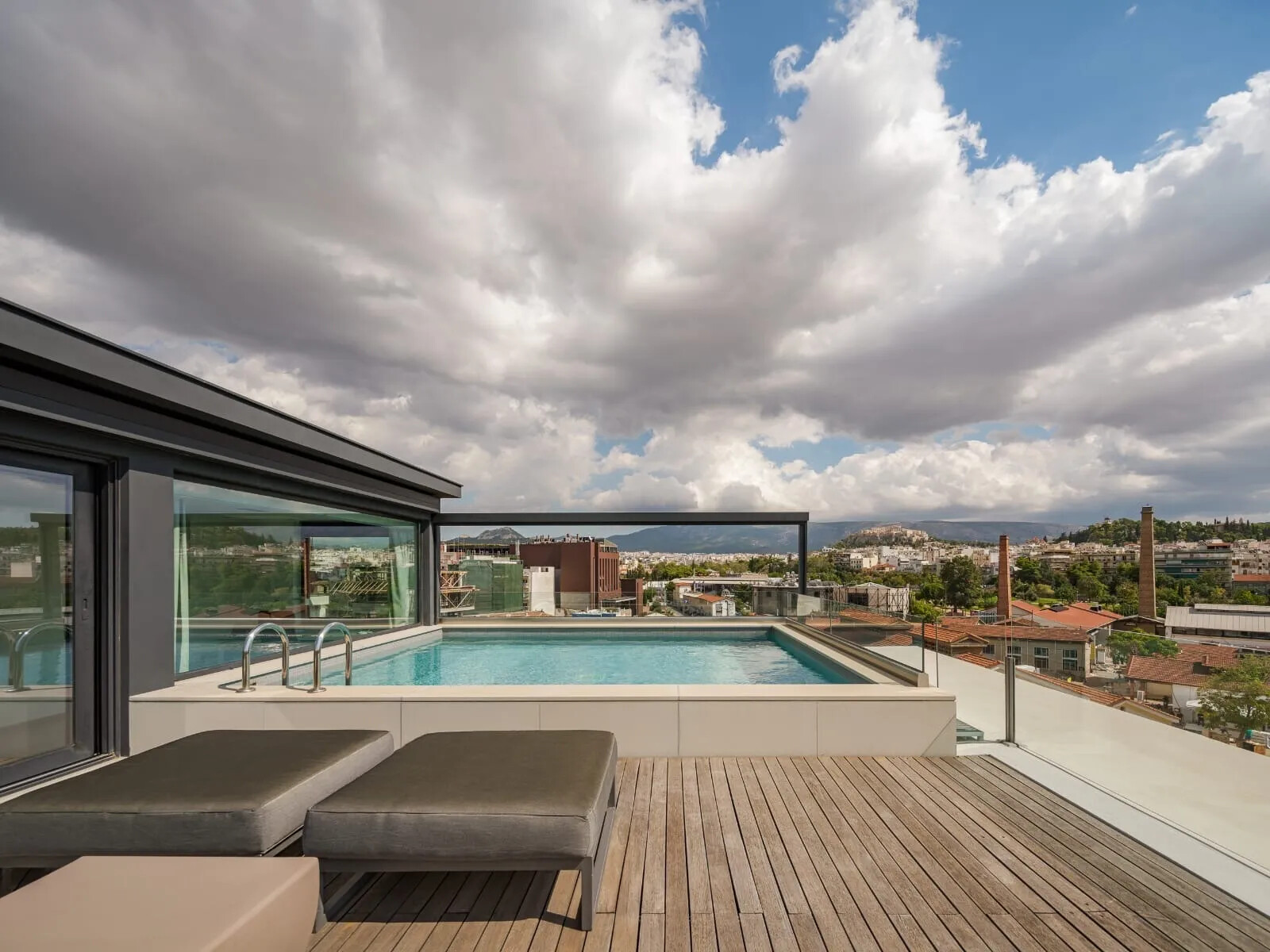 The penthouse is exceptionally luminous, with expansive openings offering unobstructed views. A heated pool on the rooftop offers panoramic vistas of the Acropolis, Lycabettus Hill, and the wider Athens basin.